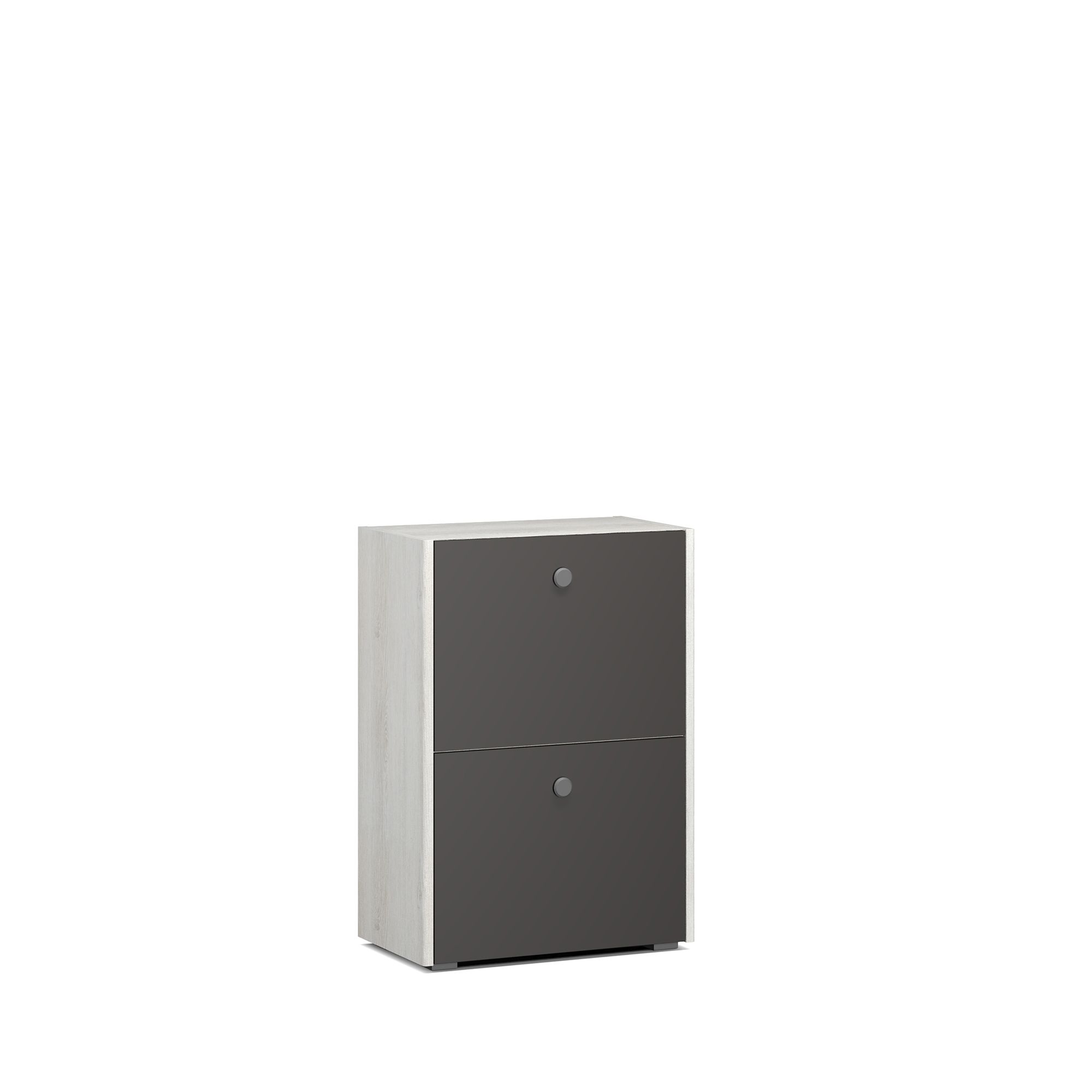 Тумба оснащена двумя отделениями с откидными фасадами, расположенными один под другим. Фасады выполнены из МДФ с технологией окутывания без острых кромок. Металлические ручки – черного цвета. Фурнитура скрытого крепления не нарушает эстетическое восприятие мебели.