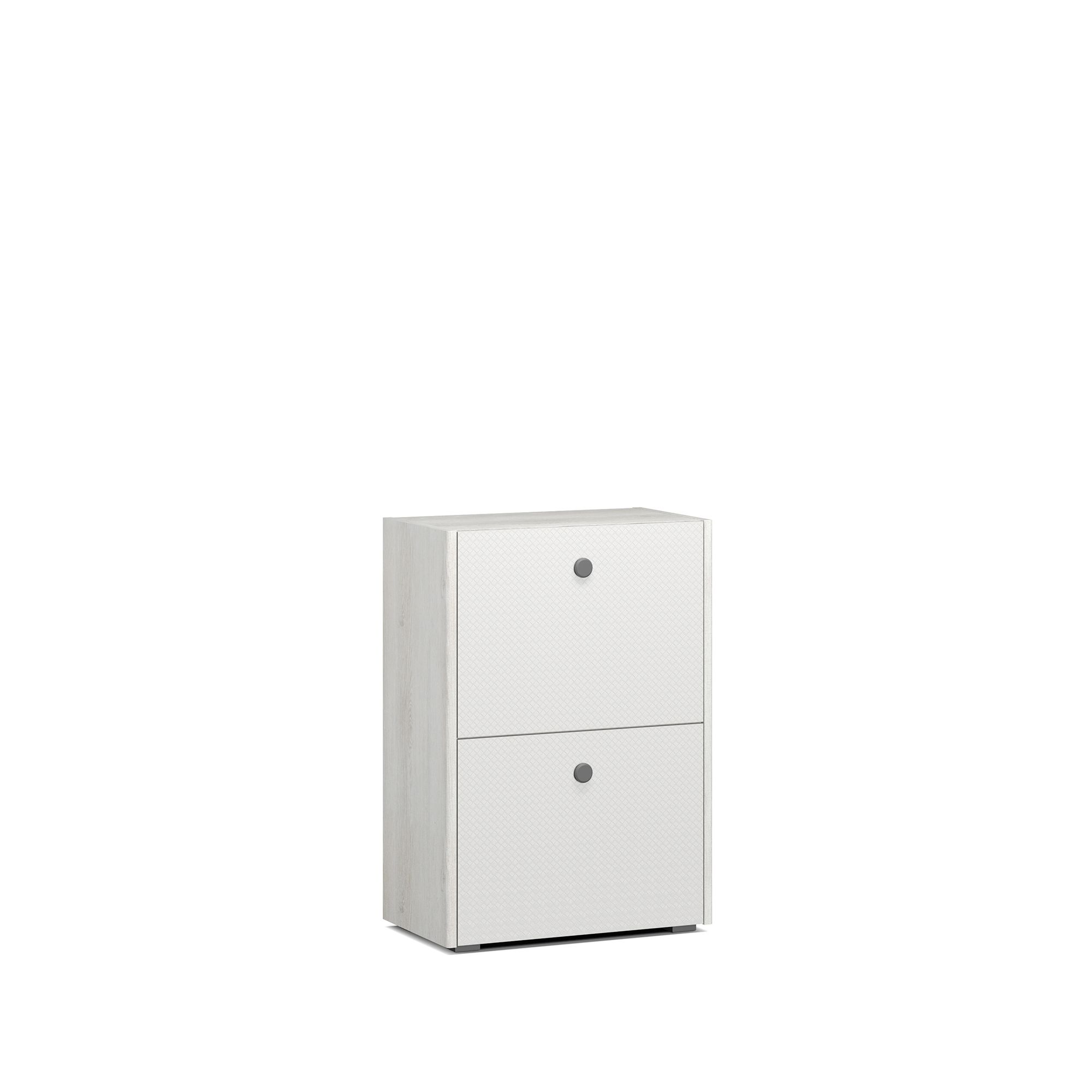 Тумба оснащена двумя отделениями с откидными фасадами, расположенными один под другим. Фасады выполнены из МДФ с технологией окутывания без острых кромок. Металлические ручки – черного цвета. Фурнитура скрытого крепления не нарушает эстетическое восприятие мебели.