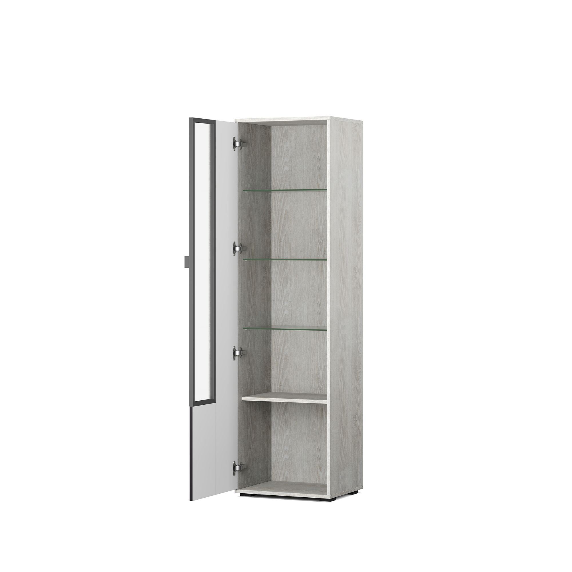 Однодверный шкаф ESIDO оборудован распашным фасадом со стеклянной вставкой, за которым располагается система полок. Предусмотрены варианты с левым и правым открыванием фасада. Полки за стеклом также выполнены из стекла. Фасады – из МДФ с технологией окутывания без острых кромок. Вкладные фасады подчеркивают геометрию каждого элемента. Инновационные петли с доводчиком европейского производства обеспечивают плавное закрывание дверей. Фурнитура скрытого крепления не нарушает эстетическое восприятие мебели.