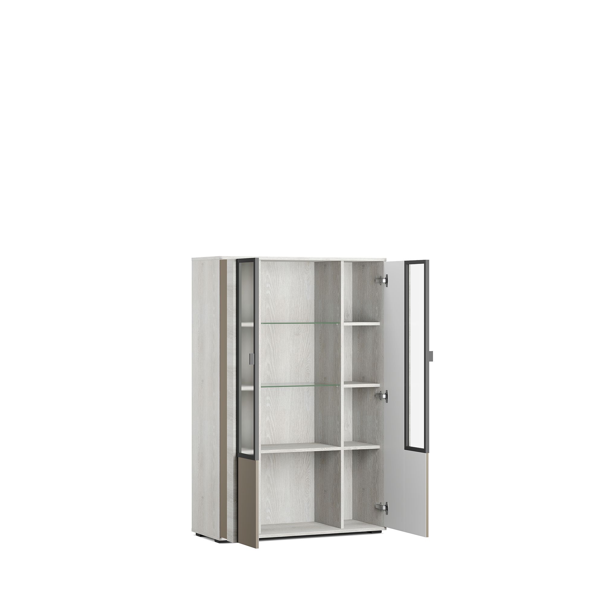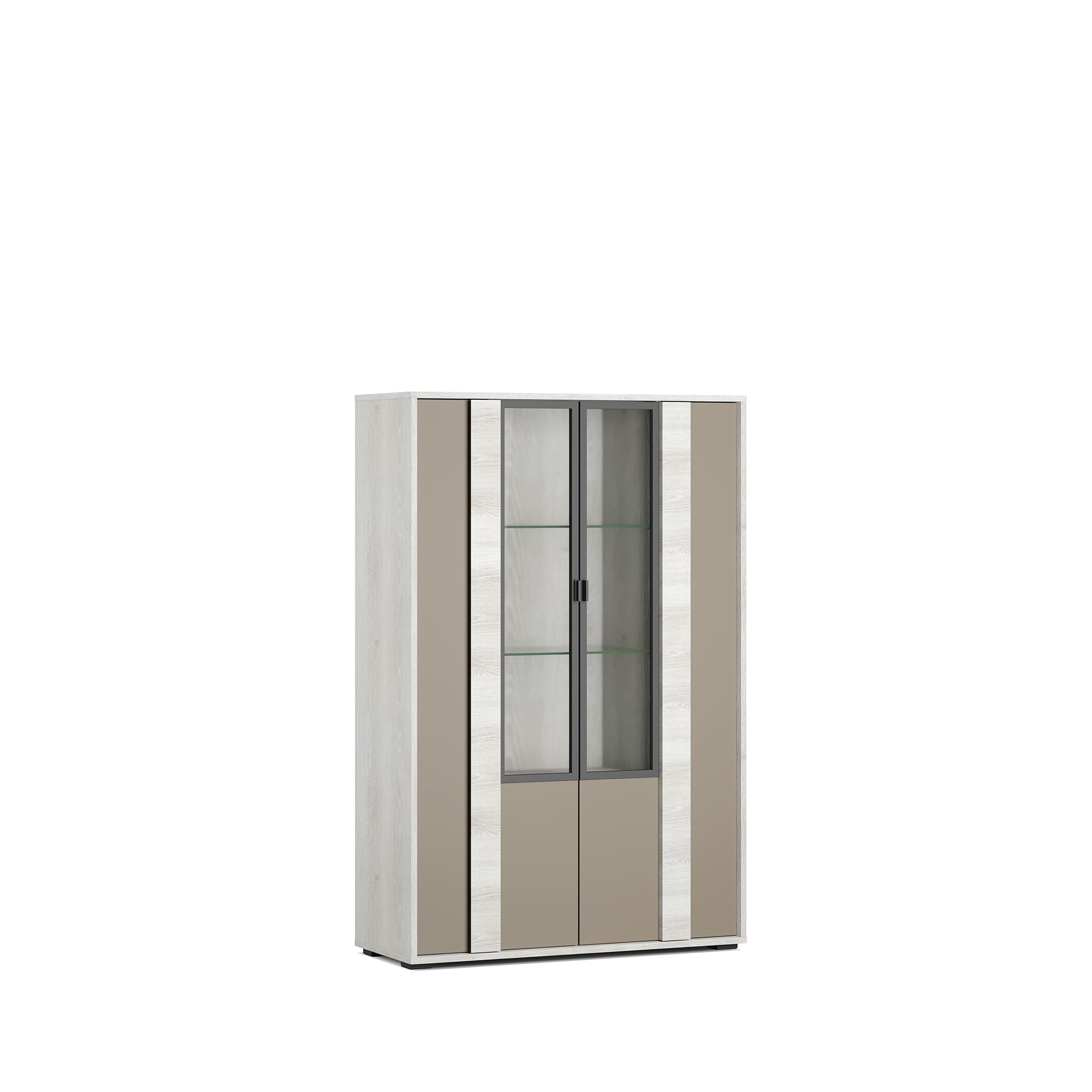 Двухдверный шкаф оборудован распашными фасадами со стеклянными вставками, за которыми располагается система полок. Полки за стеклом также выполнены из стекла. Фасады – из МДФ с технологией окутывания без острых кромок. Вкладные фасады подчеркивают геометрию каждого элемента. Инновационные петли с доводчиком европейского производства обеспечивают плавное закрывание дверей. Фурнитура скрытого крепления не нарушает эстетическое восприятие мебели.