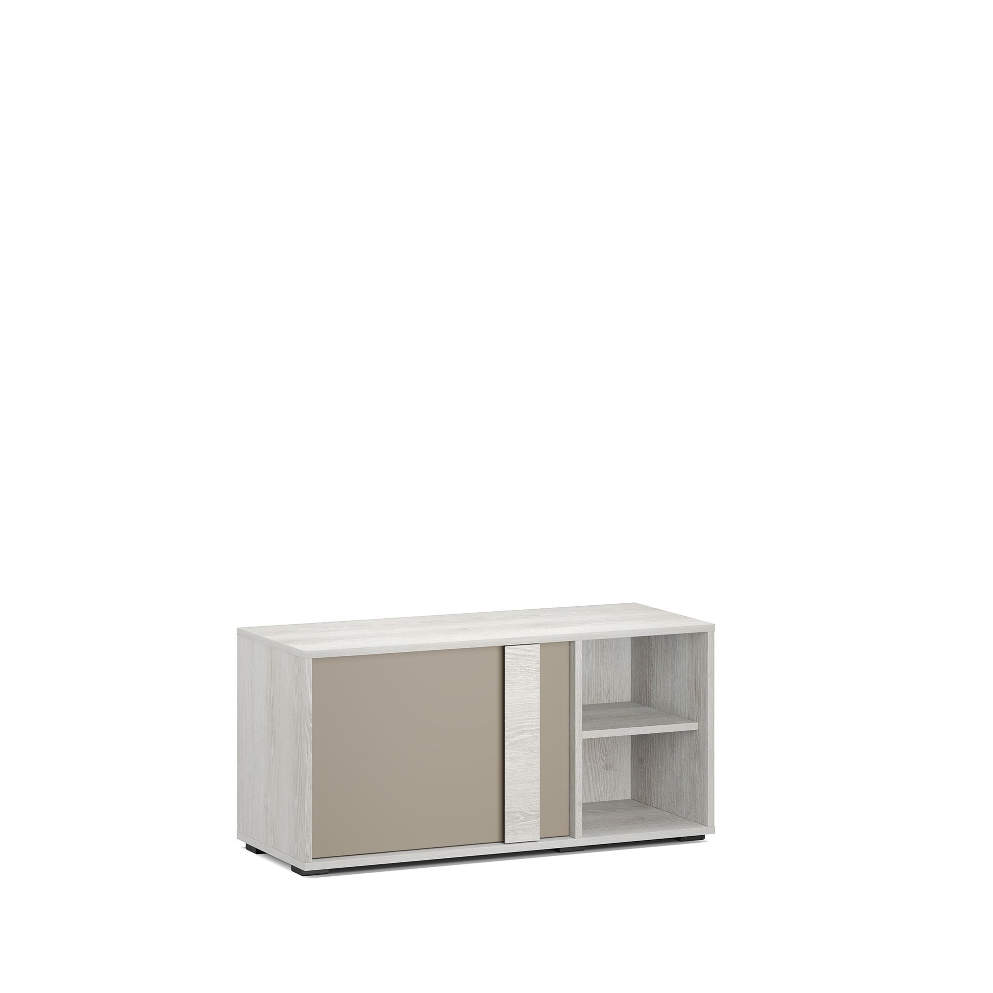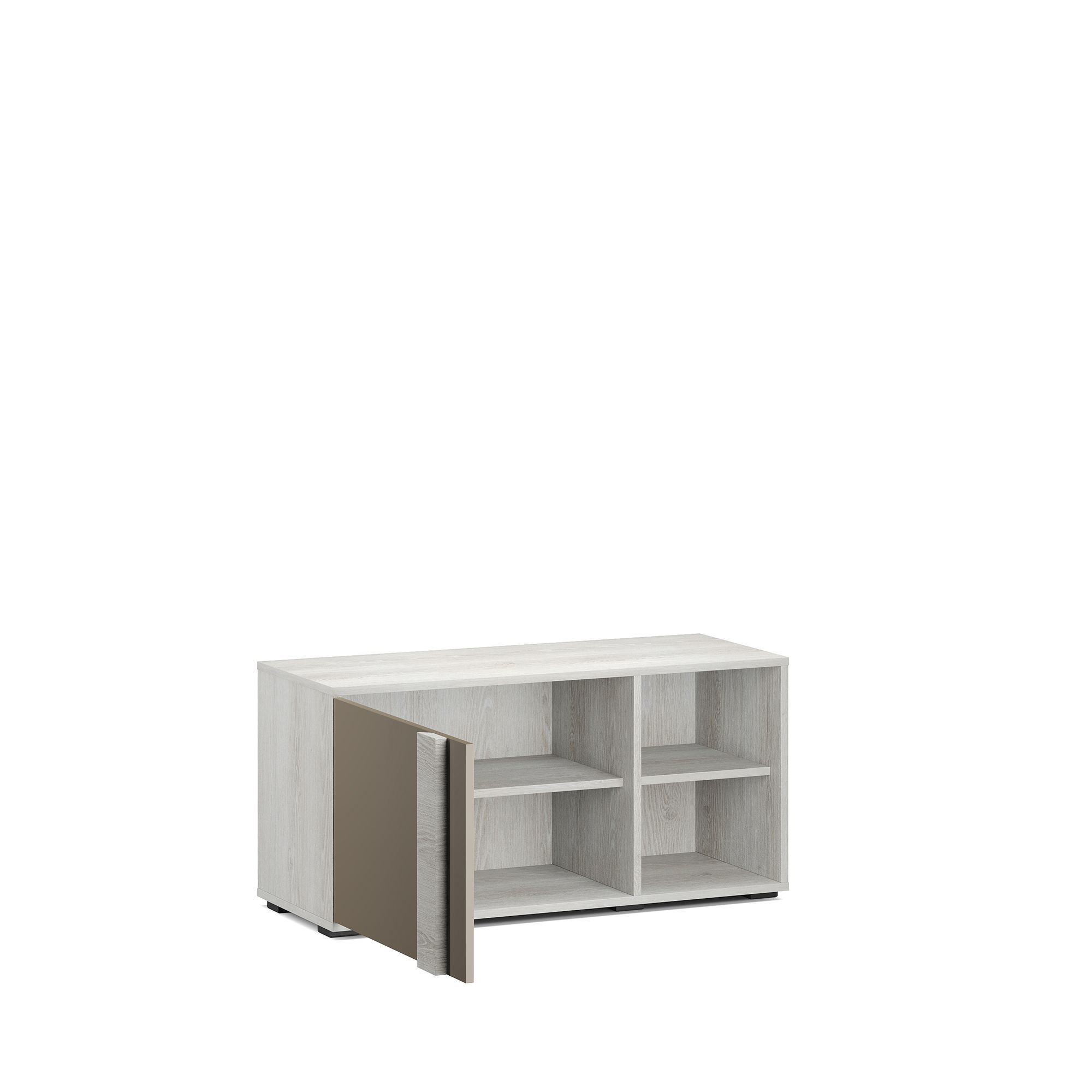 Компактная тумба оснащена распашным фасадом, за которым располагаются полки из ДСП, а также отделением для открытого хранения. Роль ручки на распашном фасаде выполняет декоративная планка в древесной текстуре. Вкладные фасады выполнены из МДФ с технологией окутывания без острых кромок. Инновационные петли с доводчиком европейского производства обеспечивают плавное закрывание дверей. Фурнитура скрытого крепления не нарушает эстетическое восприятие мебели.