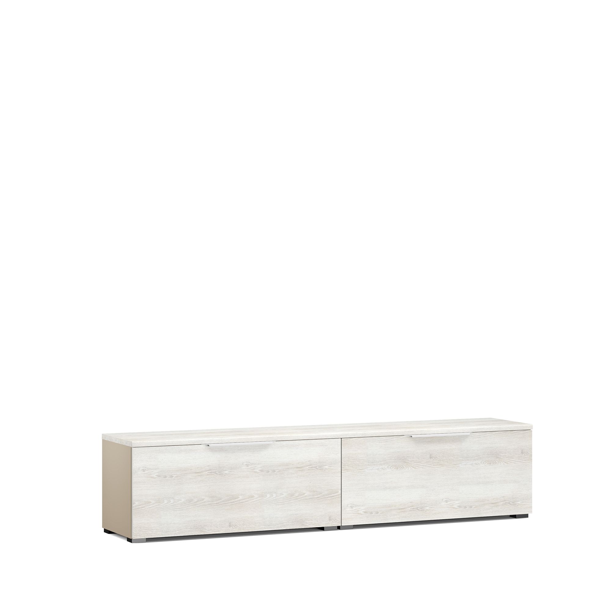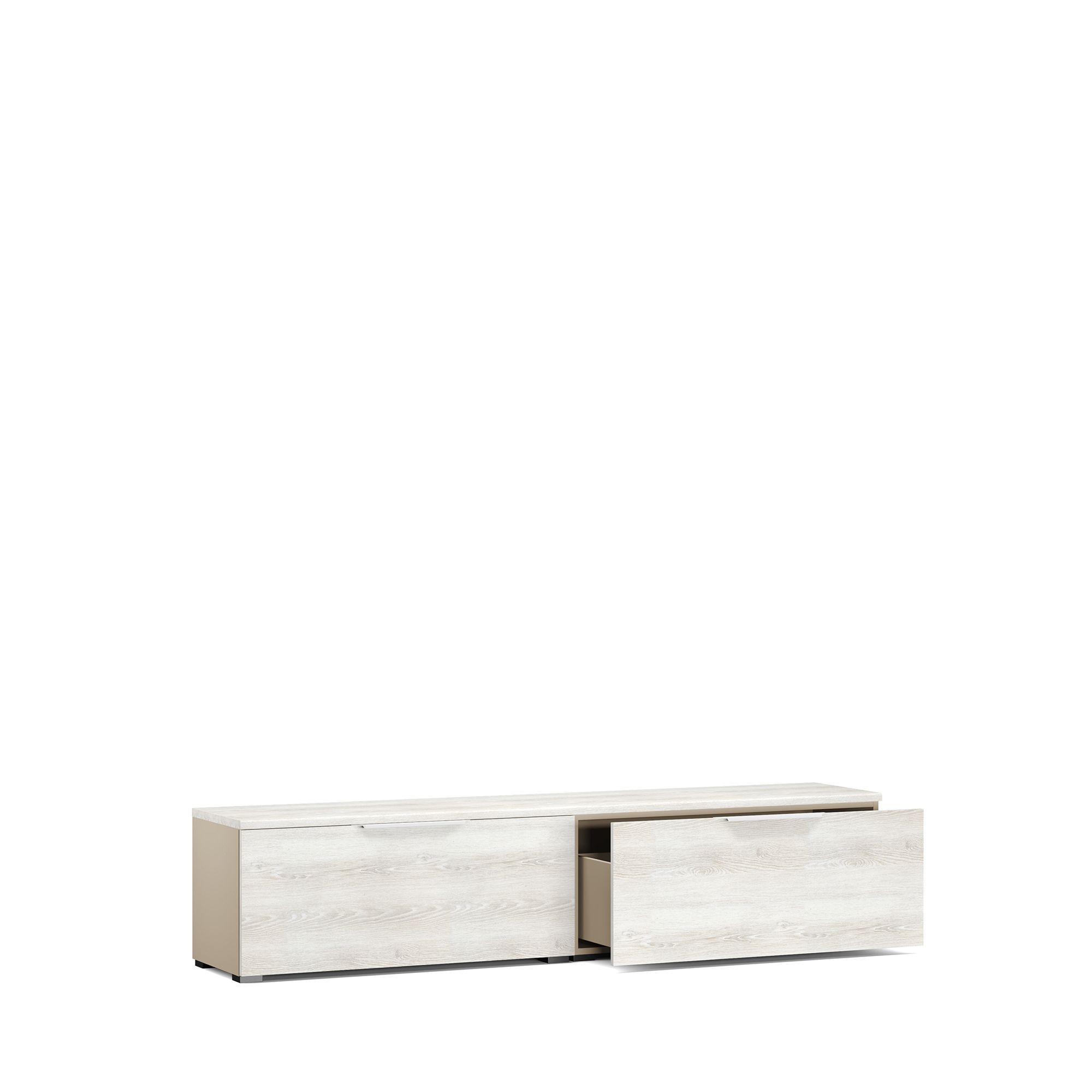 ТВ-тумба оснащена двумя выдвижными ящиками в древесной текстуре.  Фасады выполнены из МДФ с технологией окутывания без острых кромок. Торцевая металлическая ручка – белого цвета. Направляющие ящика рассчитаны на нагрузку до 25 кг, работают бесшумно и плавно. Фурнитура скрытого крепления не нарушает эстетическое восприятие мебели.