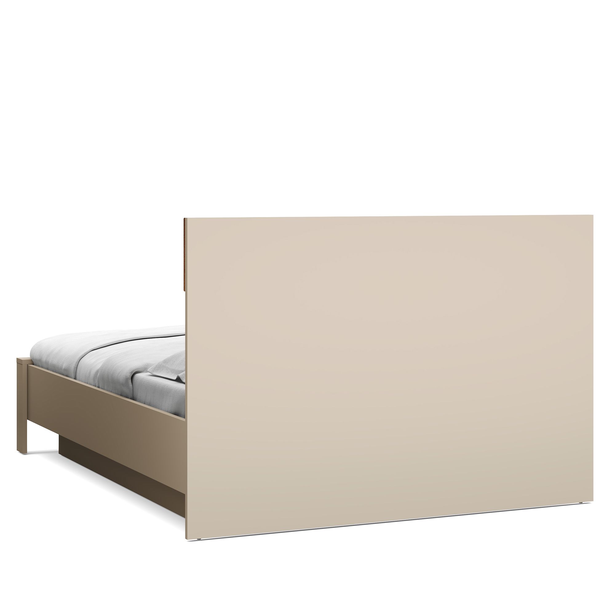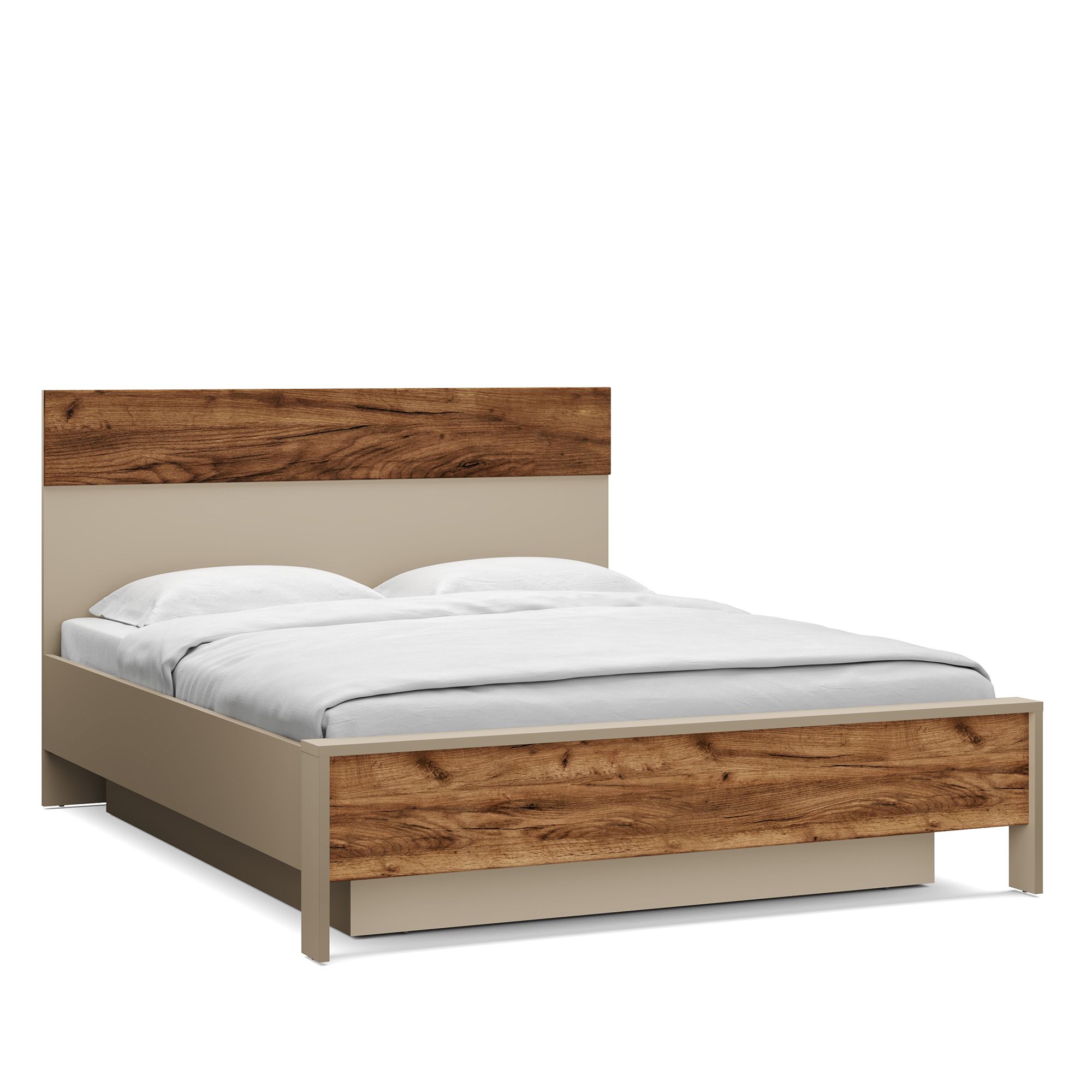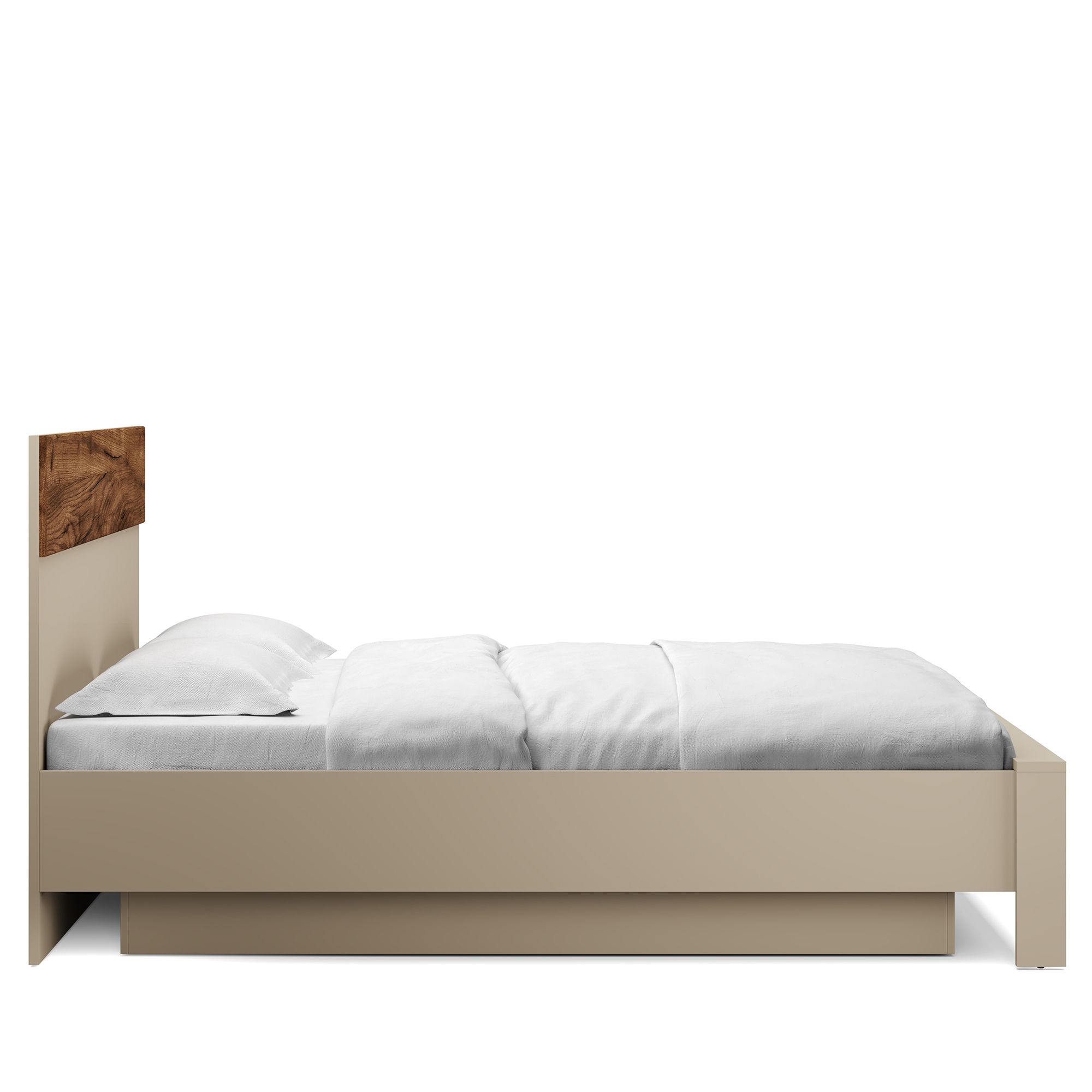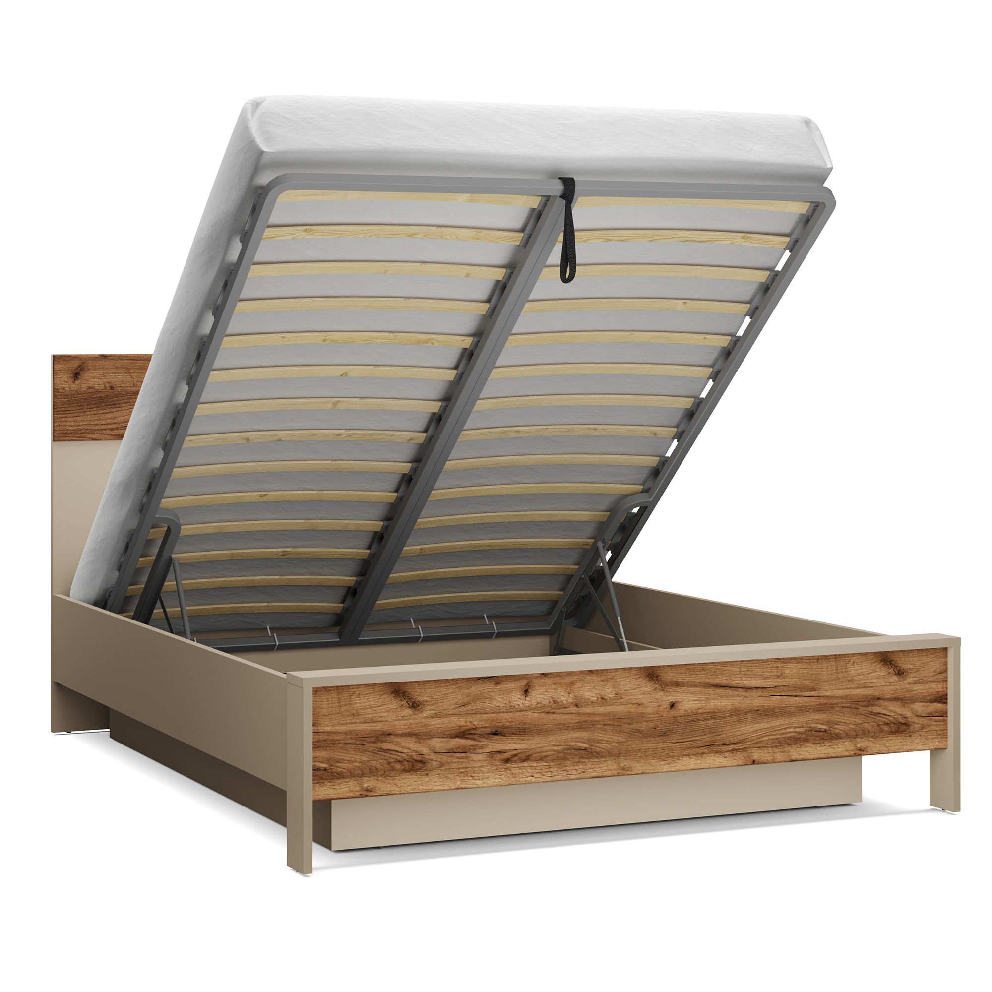 Кровать с бельевым ящиком выполнена в сочетании древесной текстуры и отделки в оттенке Капучино. В комплектацию модели входят: металлическое основание, ортопедическая решетка с подъемным механизмом (28 ламелей шириной 53 мм, расстояние между ламелями – 79 мм).