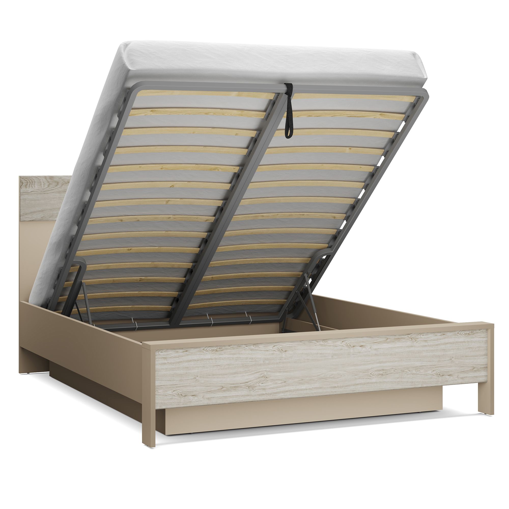 Кровать с бельевым ящиком выполнена в сочетании древесной текстуры и отделки в оттенке Капучино. В комплектацию модели входят: металлическое основание, ортопедическая решетка с подъемным механизмом (28 ламелей шириной 53 мм, расстояние между ламелями – 79 мм).