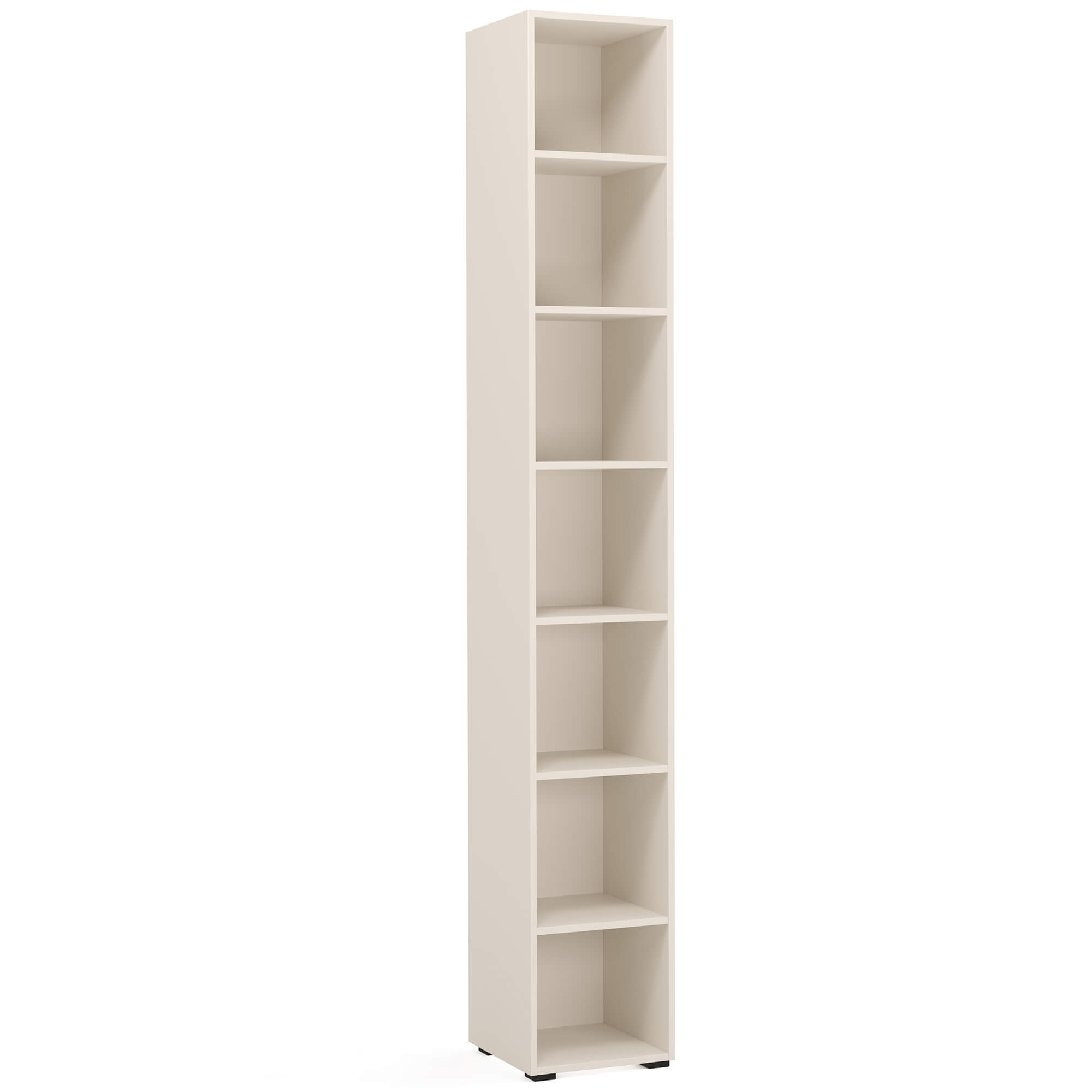 Стеллаж АРТА / ARTA, оснащенный шестью полками, выполнен в отделке Cachmere. Элемент предназначен как для самостоятельного использования, так и в составе системы хранения высотой 264,7 см. Применение в качестве завершающего элемента шкафной композиции дизайном не предусмотрено. При сборке композиции разница высот между стеллажом и шкафами компенсируется регулируемыми опорами (включены в комплект).