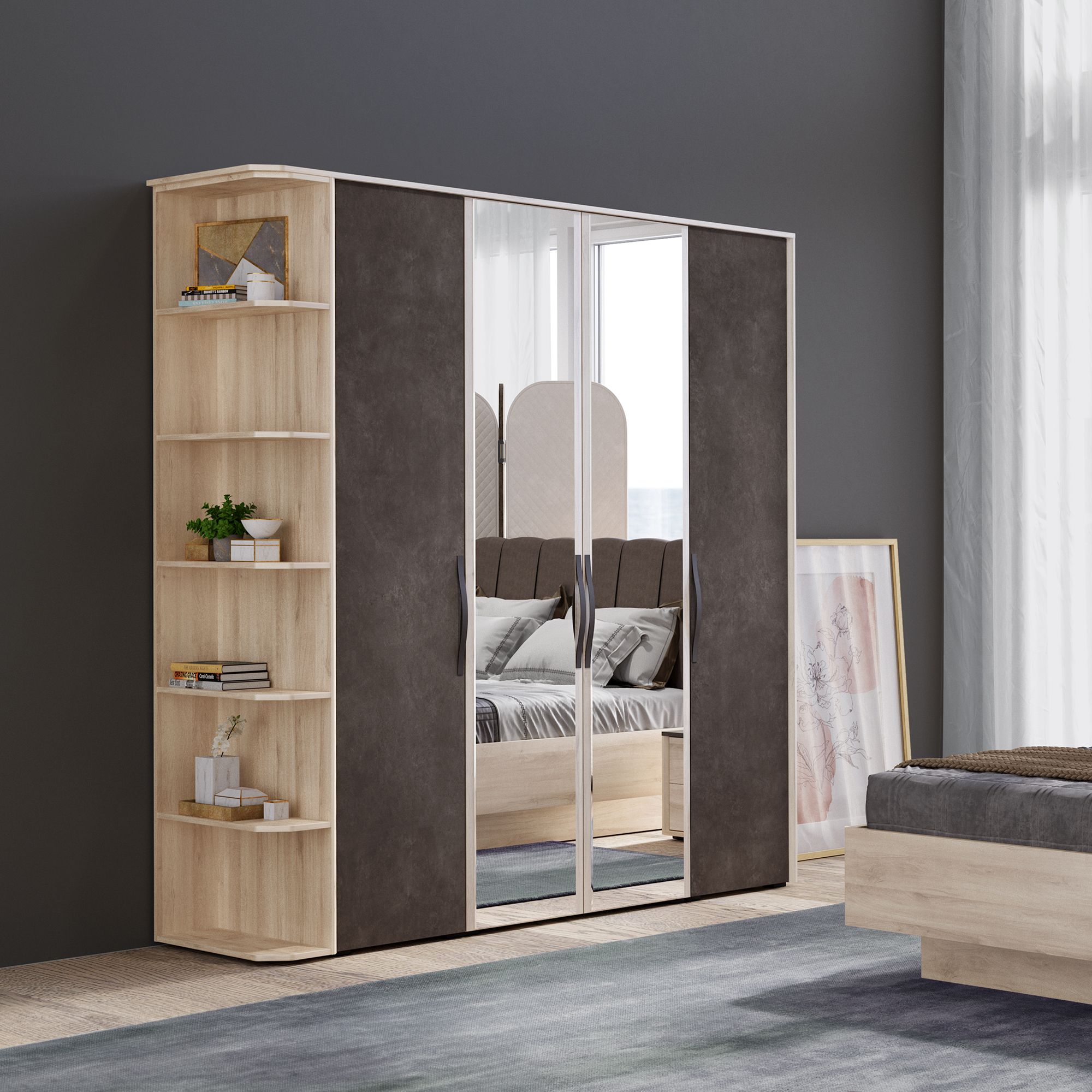 Стеллаж ALTERA может располагаться как в левой, так и в правой части шкафной композиции. Полки модели имеют скошенный угол, что обеспечивает эстетику и безопасность.