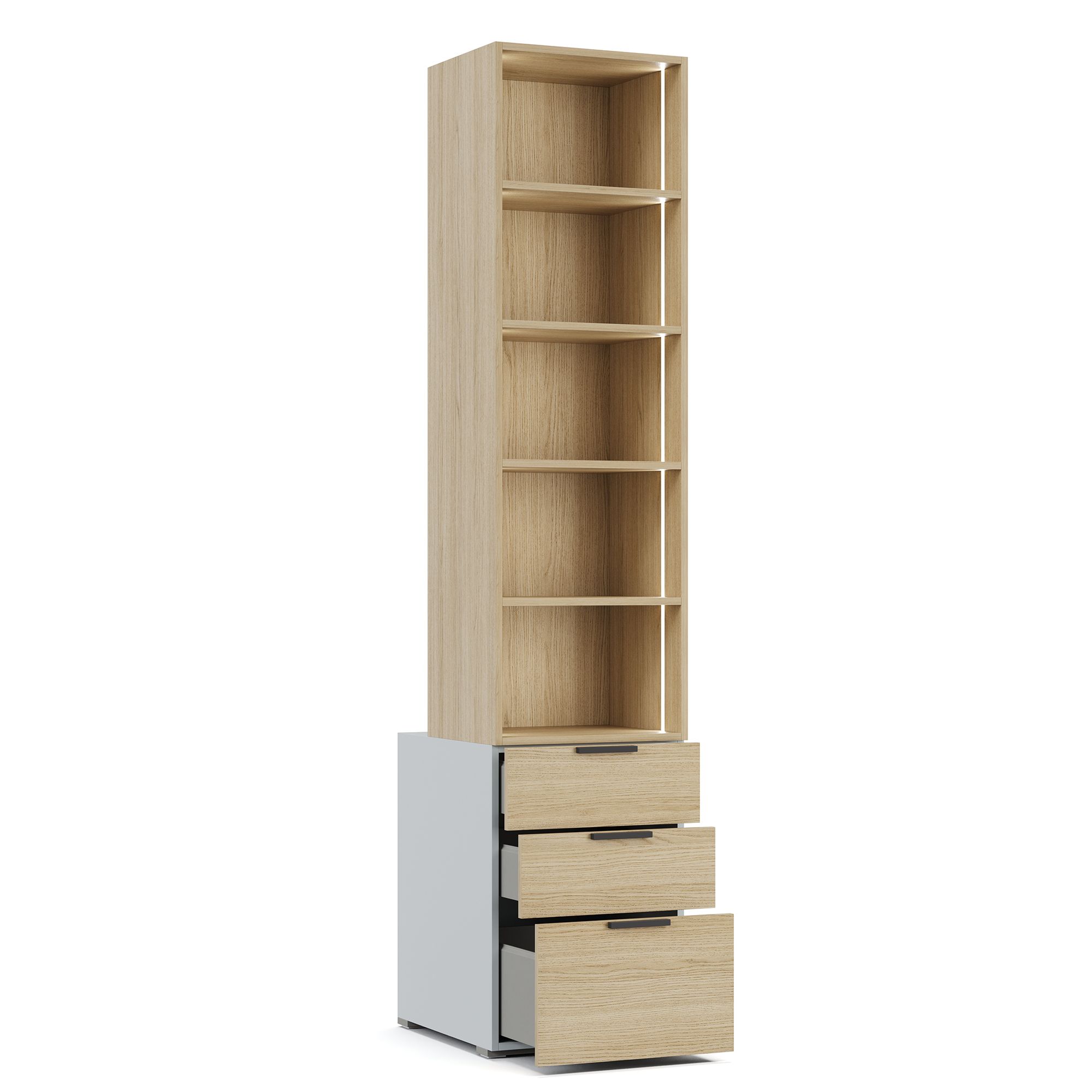 Стеллаж NAPOLI представляет собой двухсекционную систему, в верхней части которой расположена система открытого хранения с полками, оснащенная двумя встроенными светильниками (система включения заказывается отдельно). Нижняя часть стеллажа представляет собой три выдвижных ящика, фасады которых выполнены в отделке древесной текстурой. Внутренний декор ящиков выполнен в текстуре Шенилл. ВАЖНО! Модуль предназначен исключительно для использования в середине композиции, так как верхняя часть стеллажа имеет глубину 40 см.
