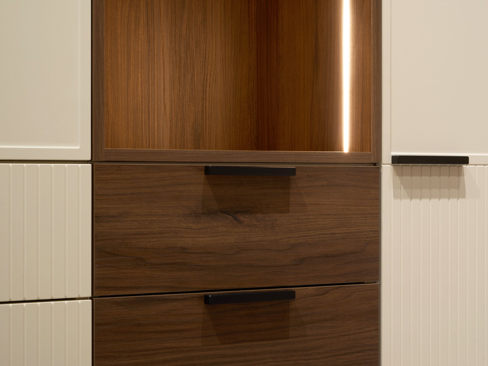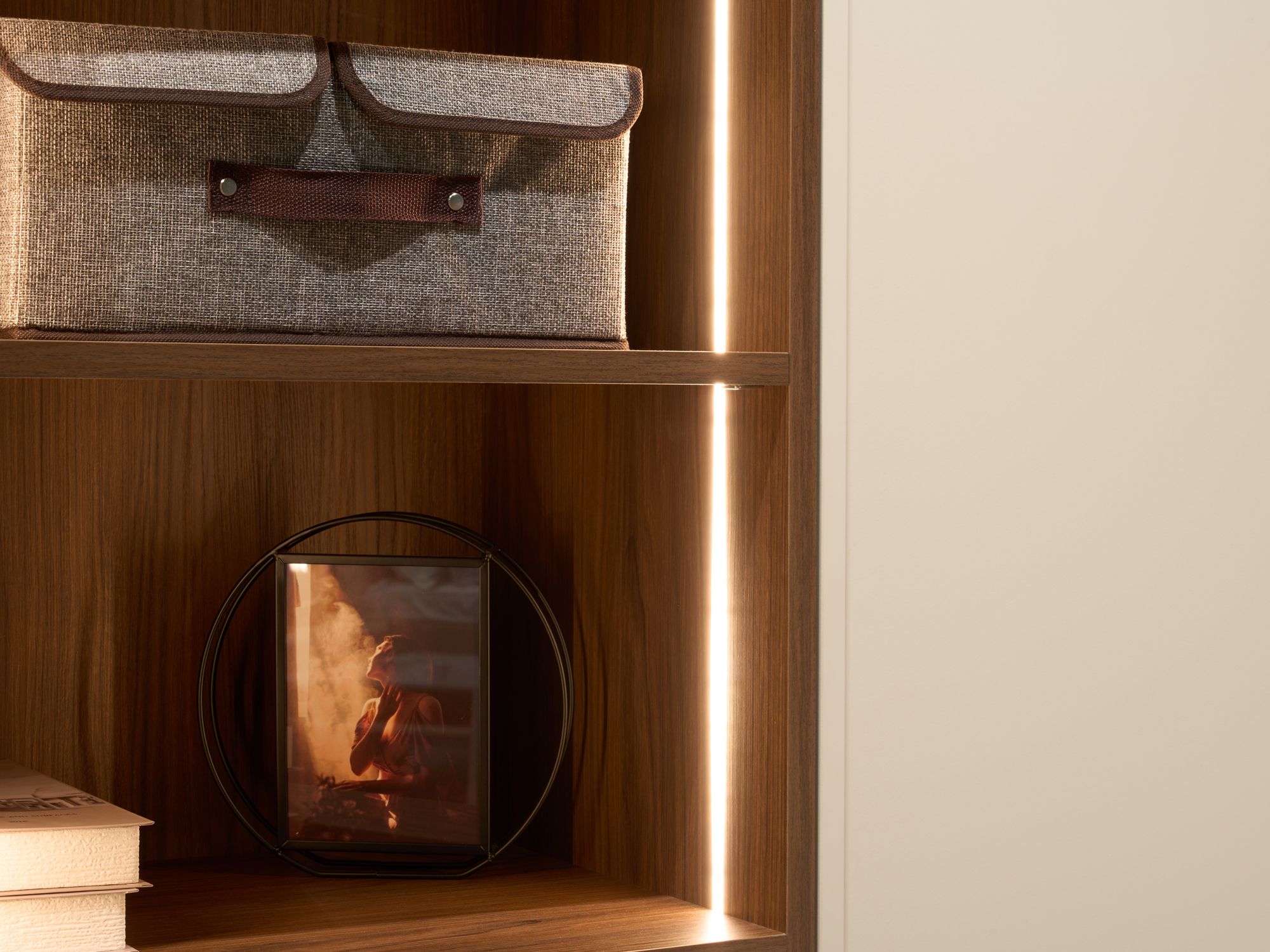 В боковые стенки шкафов и стеллажей интегрированы светодиодные светильники Fusion (Италия) в пластиковом корпусе молочного оттенка. На выбор предлагаются два вида выключателей: кнопочный и с пультом управления.