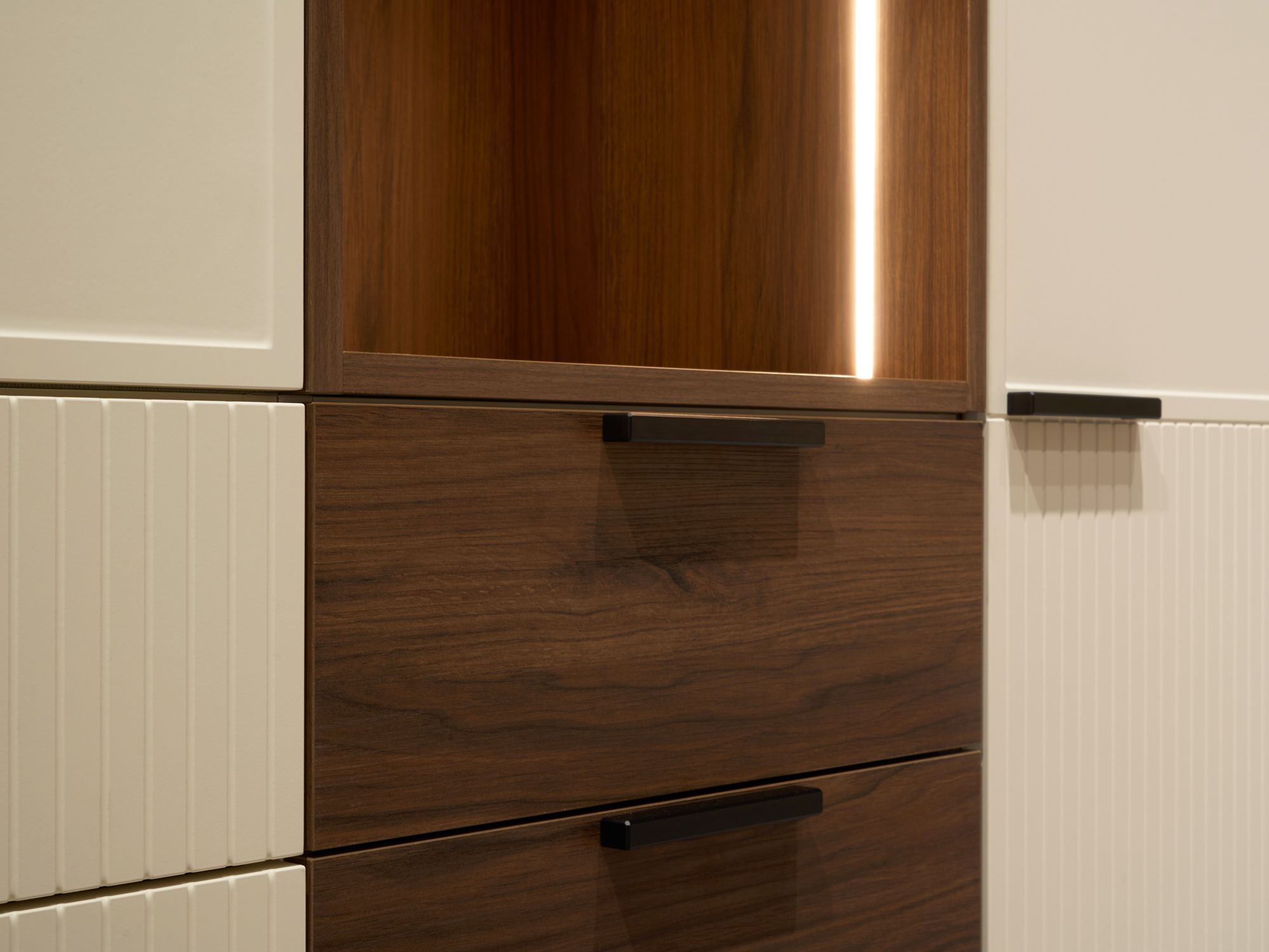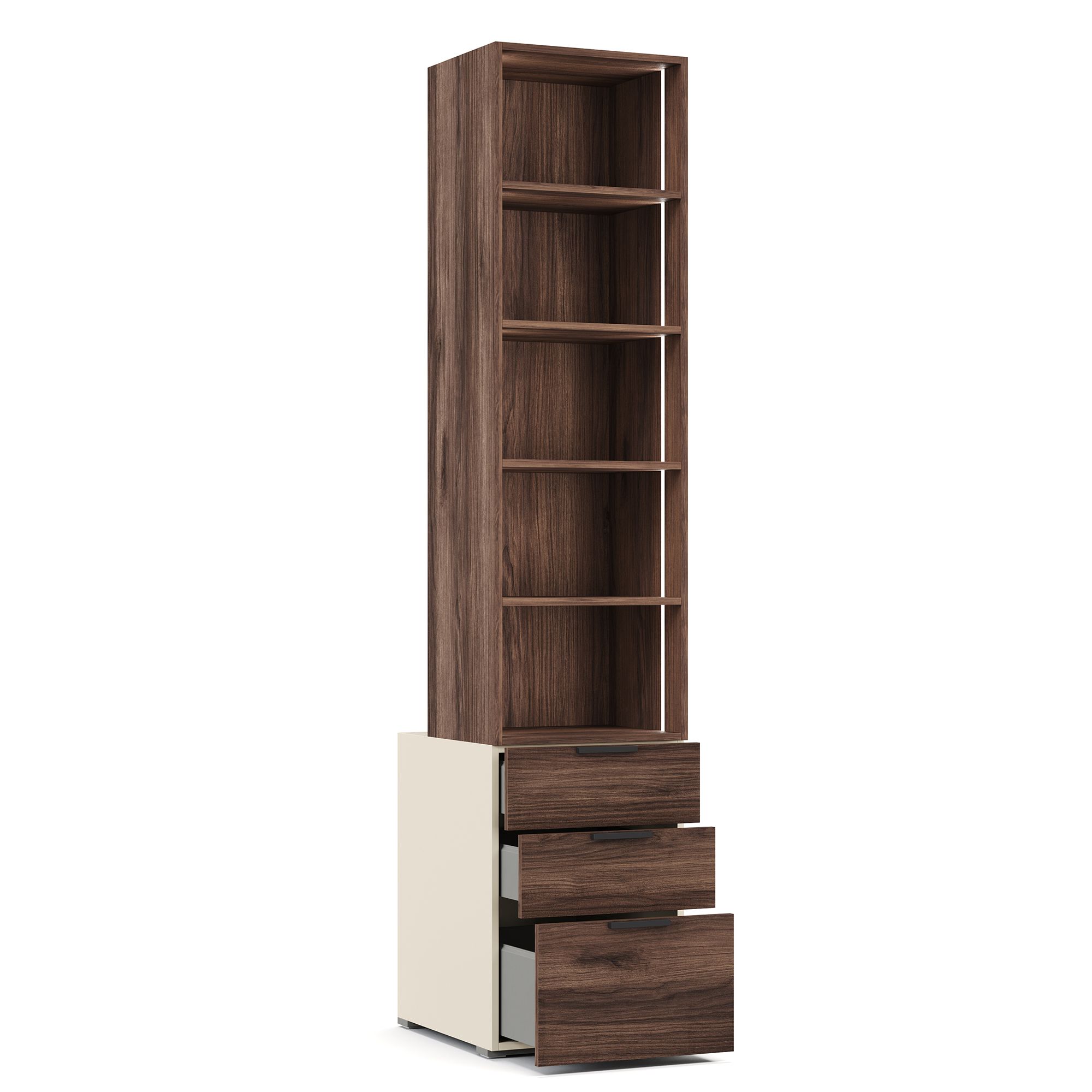 Стеллаж NAPOLI представляет собой двухсекционную систему, в верхней части которой расположена система открытого хранения с полками, оснащенная двумя встроенными светильниками (система включения заказывается отдельно). Нижняя часть стеллажа представляет собой три выдвижных ящика, фасады которых выполнены в отделке древесной текстурой. Внутренний декор ящиков выполнен в текстуре Шенилл. ВАЖНО! Модуль предназначен исключительно для использования в середине композиции, так как верхняя часть стеллажа имеет глубину 40 см.