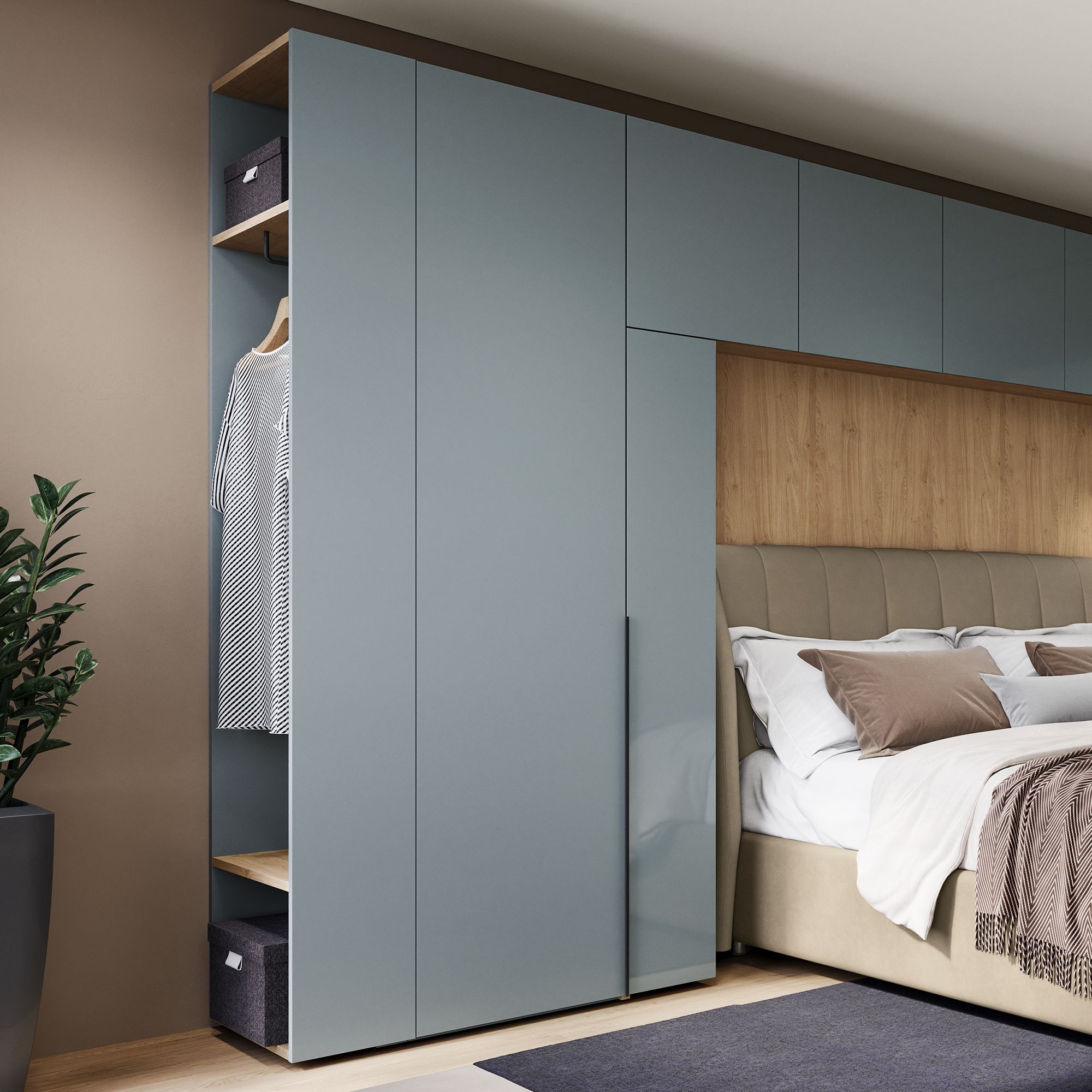 Для гармоничного вида шкафная композиция может заканчиваться завершающими элементами – стеллажами с открытыми полками для книг и декора или стеллажами, оснащенными штангой для вешалок.