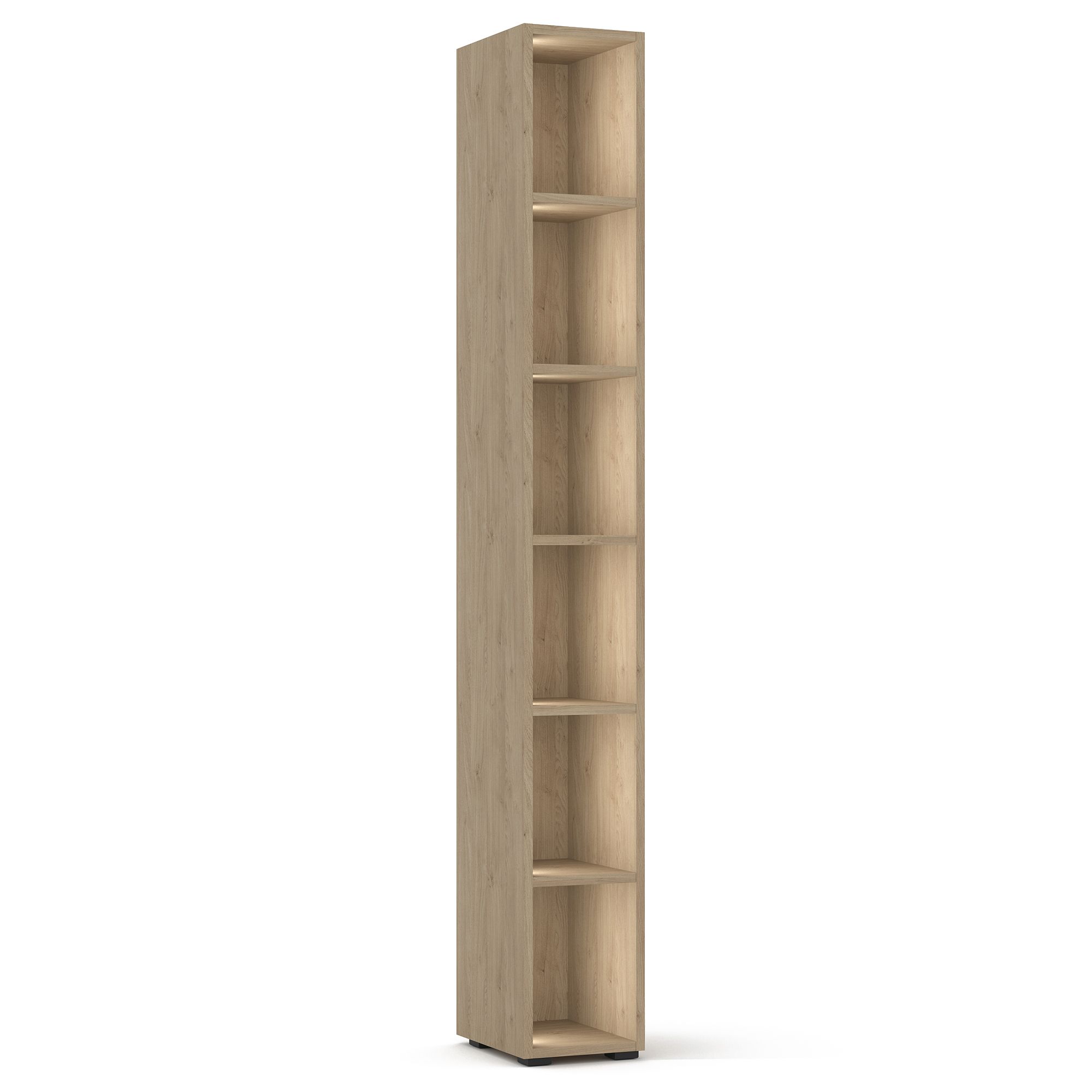 Стеллаж TERAMO с полками из ЛДСП выполнен в отделке древесной текстурой Дуб Кендал натуральный. В комплектацию элемента входит вертикальный врезной светильник (размещение слева либо справа выбирается при сборке). ВАЖНО! Система включения-выключения подсветки заказывается отдельно.