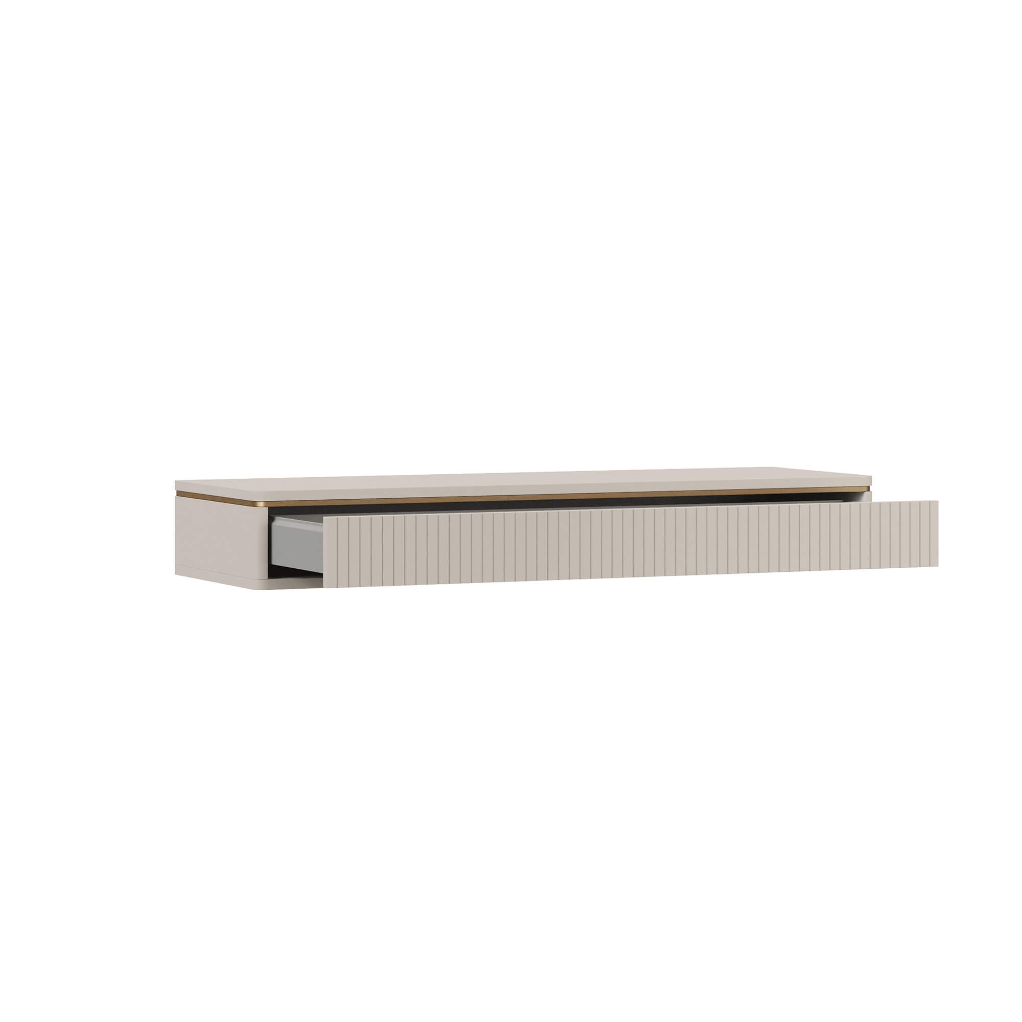 Стол-консоль ТИАРА / TIARA предназначен для навешивания на стену и может выполнять функцию бьюти-зоны, компактного рабочего места или полки для размещения декора. Максимально допустимая распределенная нагрузка – 15 кг. Стол оснащен выдвижным ящиком с системой открывания Push-to-open. Фасад модели выполнен в отделке эмалью и декорирован вертикальной фрезеровкой.