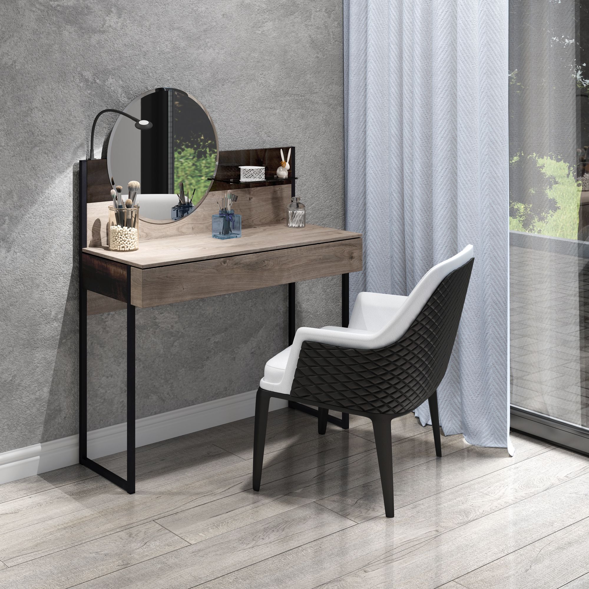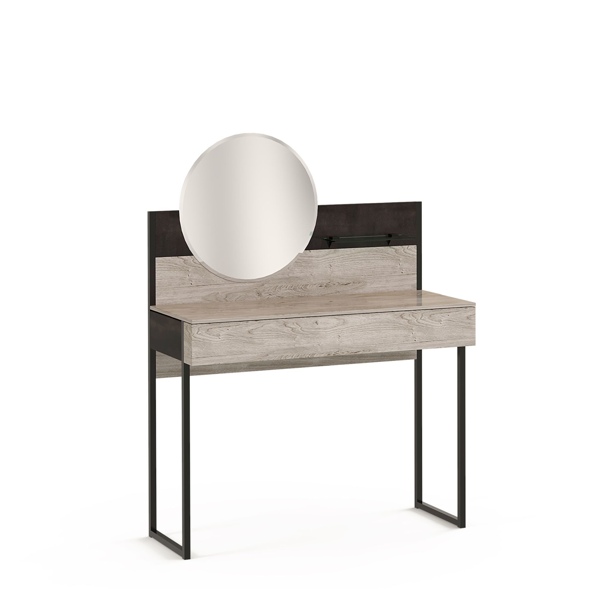 Туалетный стол BOSTON на изящных опорах из черного металла оснащен выдвижным ящиком и стильным круглым зеркалом, тонированным в оттенок «бронза». Возможен дополнительный заказ светового оборудования – светильника на гибкой ножке с сенсорным включением, обеспечивающего направленный свет.