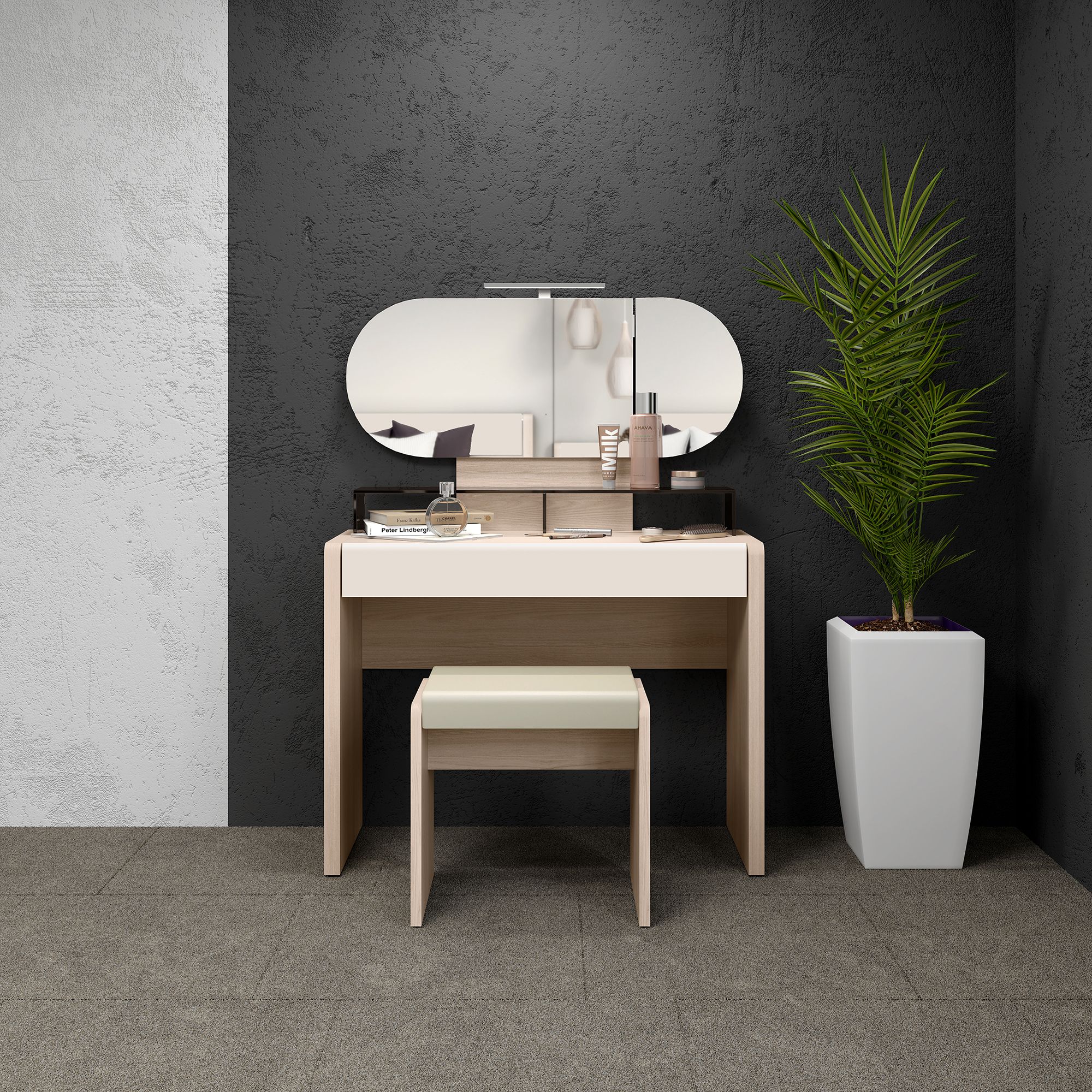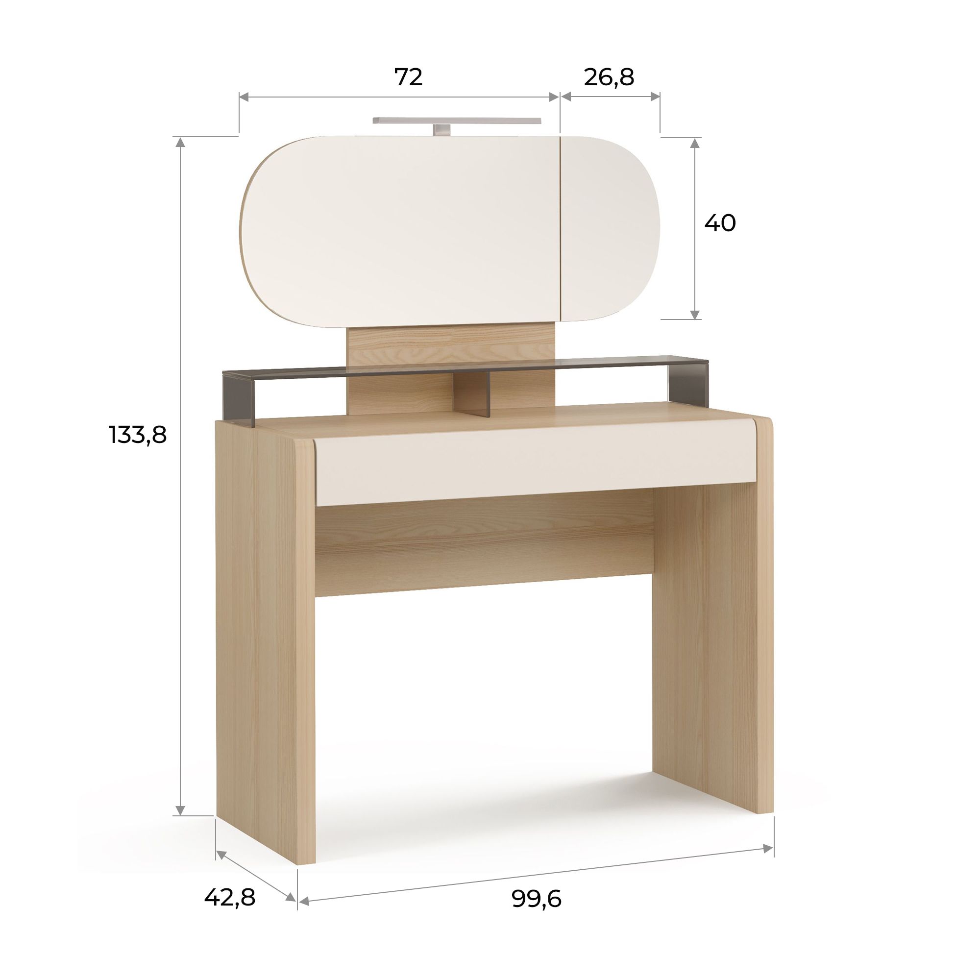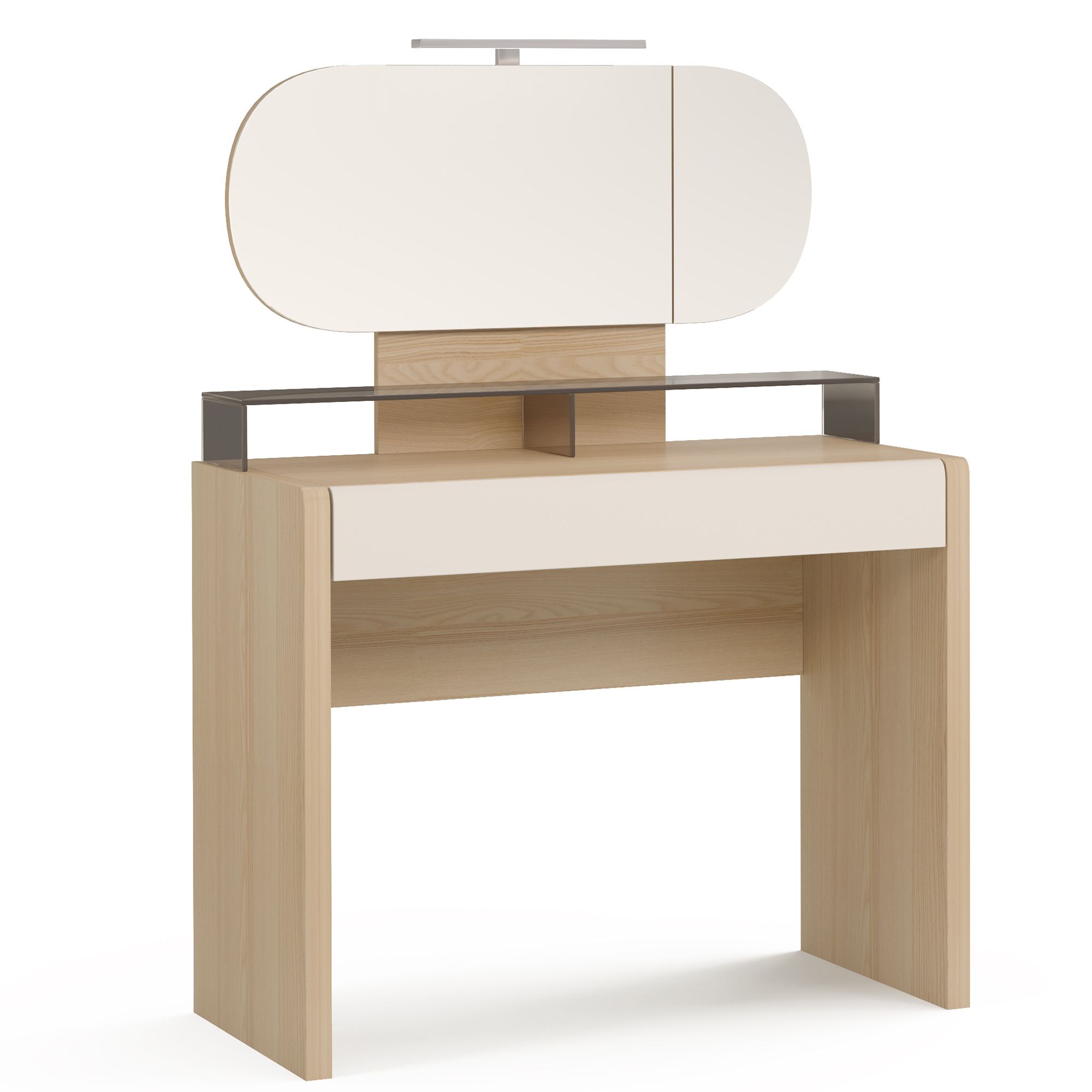Удобный туалетный столик оснащен зеркалом с двумя поворотными элементами, а также функциональной системой подсветки.