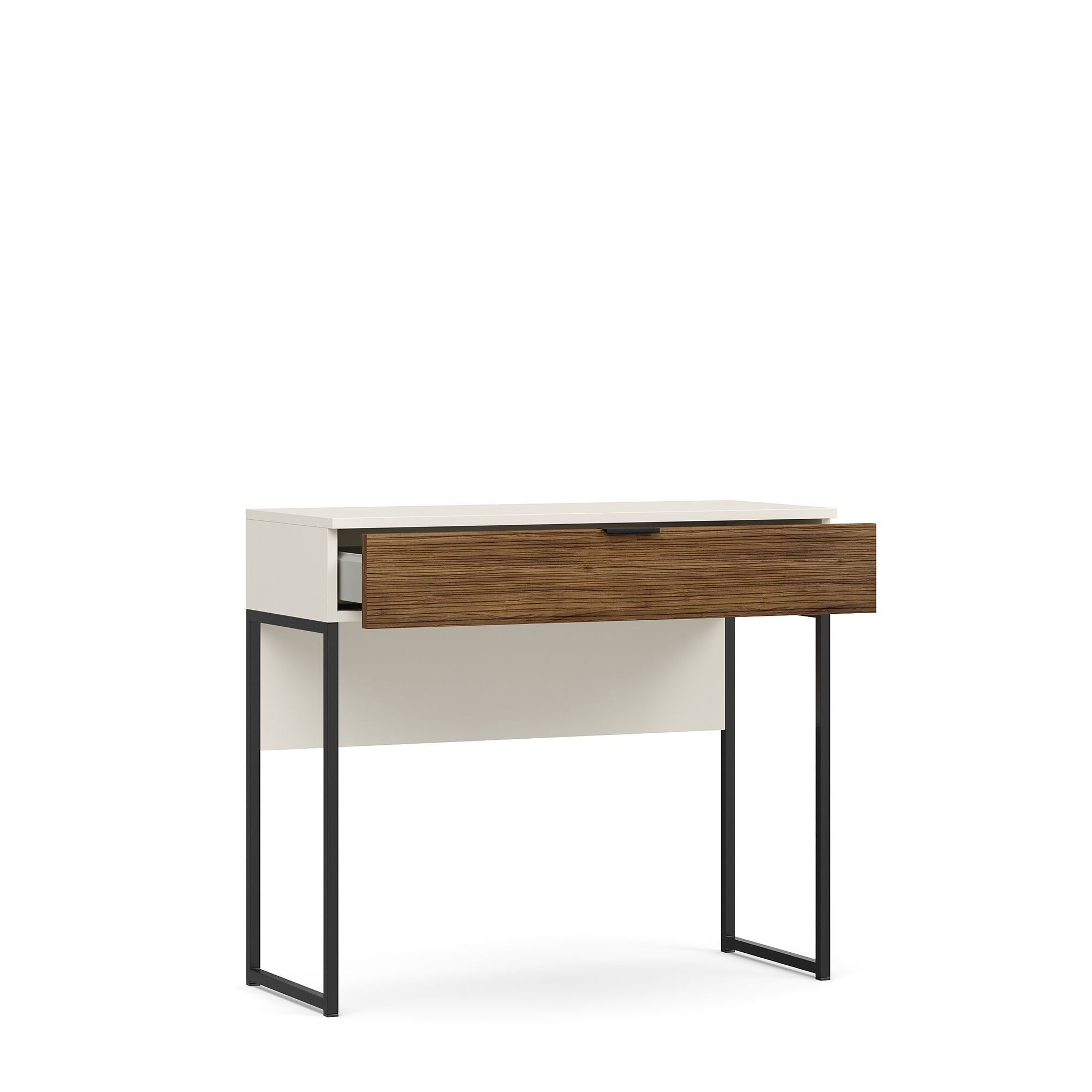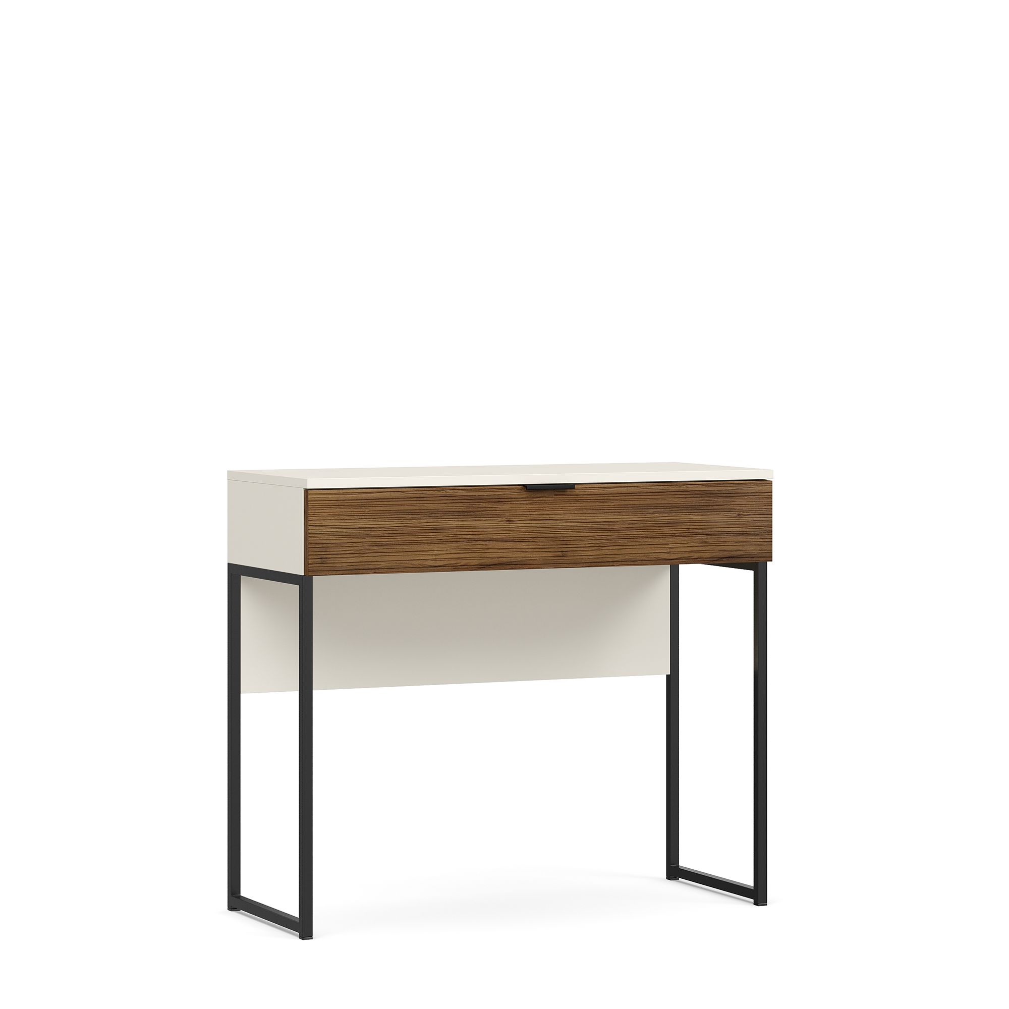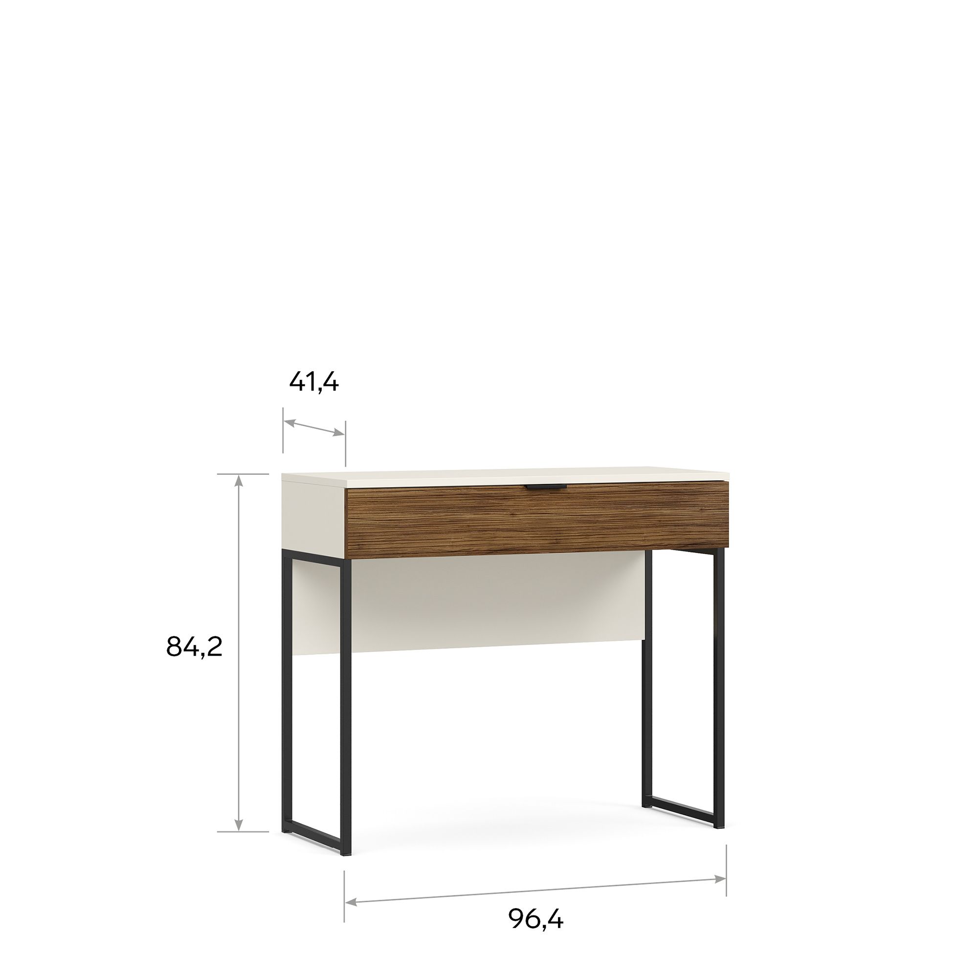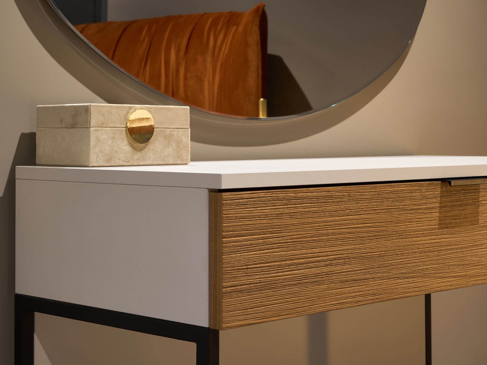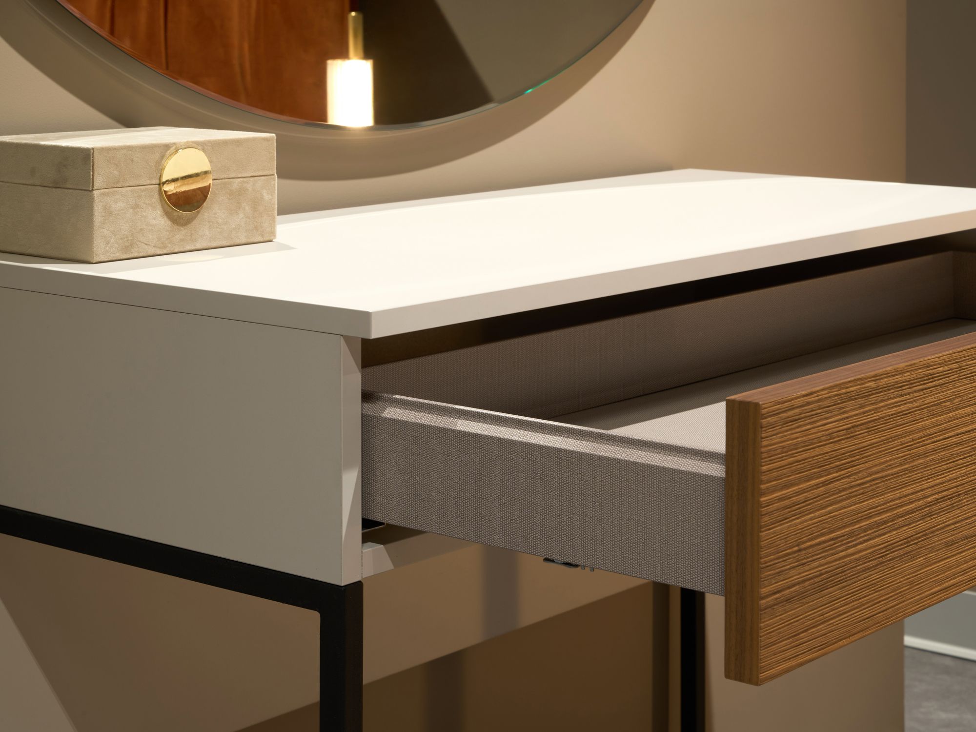Стол MONAKO на прочных металлических опорах оснащен выдвижным ящиком в отделке натуральным шпоном. Модуль можно использовать как в комбинации с навесным зеркалом, так и отдельно.