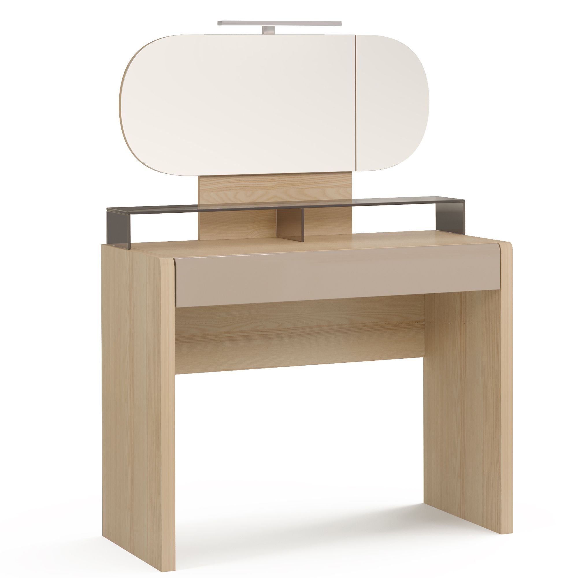 Туалетный столик ESTE оснащен удобным поворотным зеркалом и встроенной подсветкой. Вместительный ящик для косметики открывается и закрывается плавно и бесшумно благодаря надежной фурнитуре европейского производства. Стильные полки выполнены из закаленного тонированного стекла, которое обладает повышенной прочностью и даже при разрушении рассыпается на фрагменты с неострыми краями.