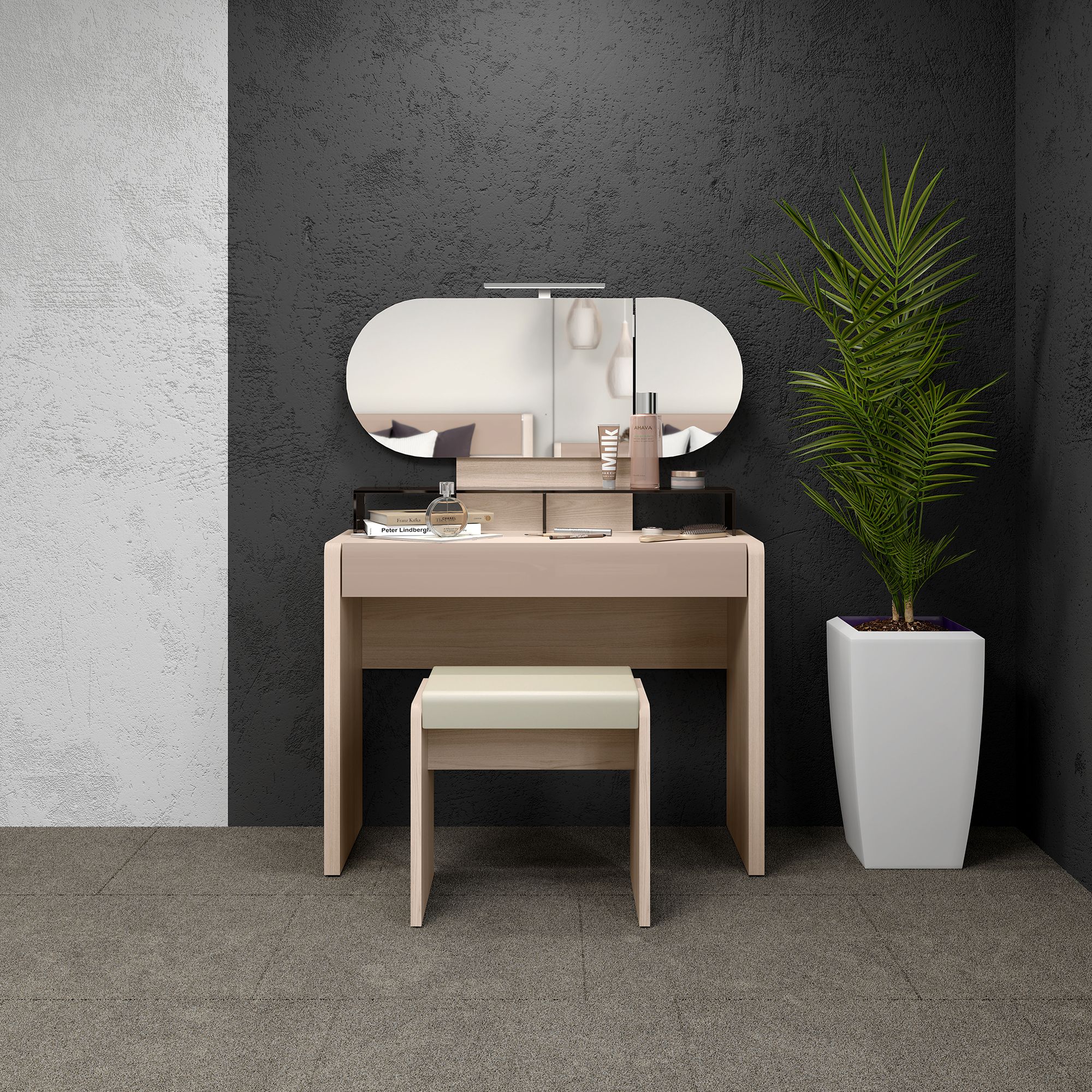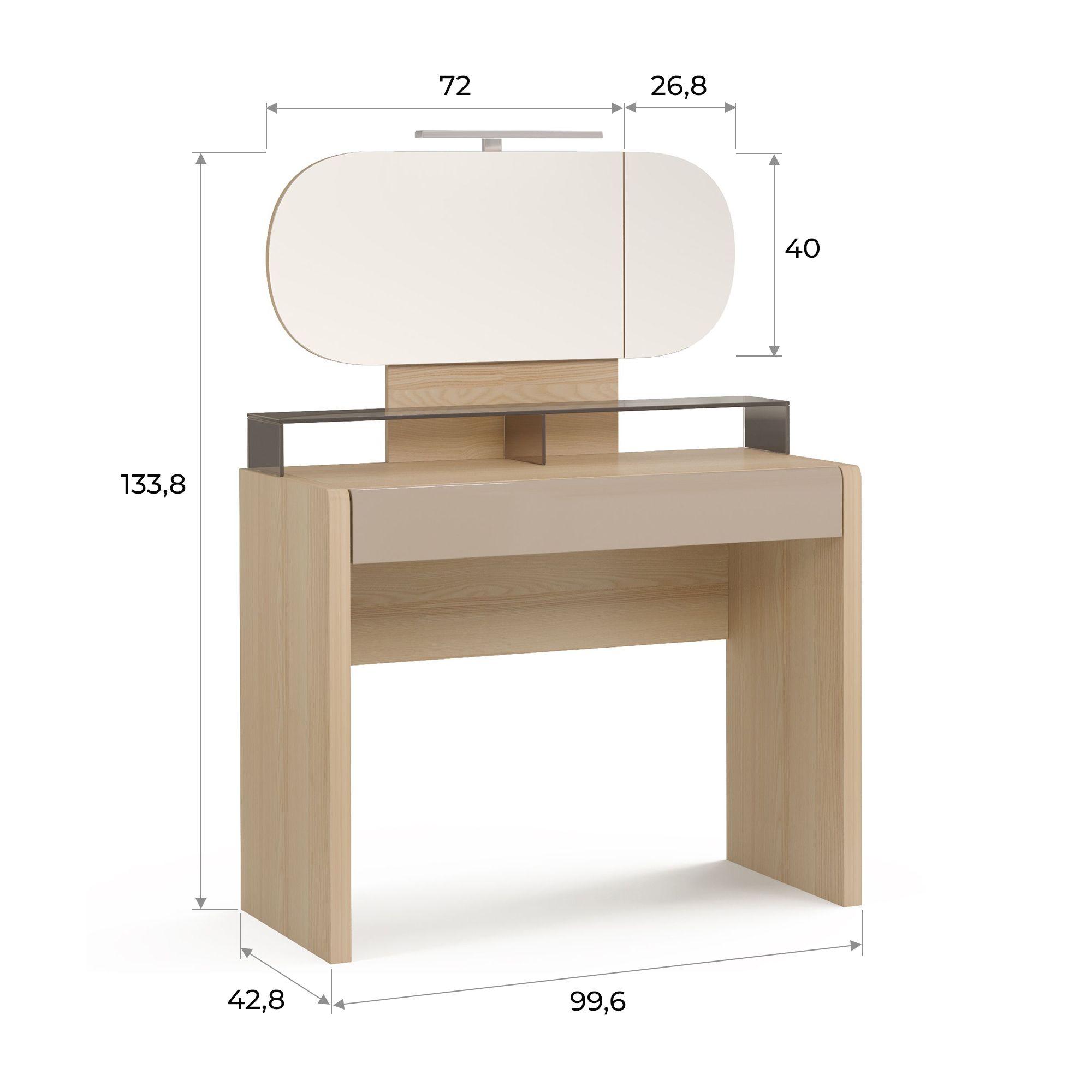 Удобный туалетный столик оснащен зеркалом с двумя поворотными элементами, а также функциональной системой подсветки.
