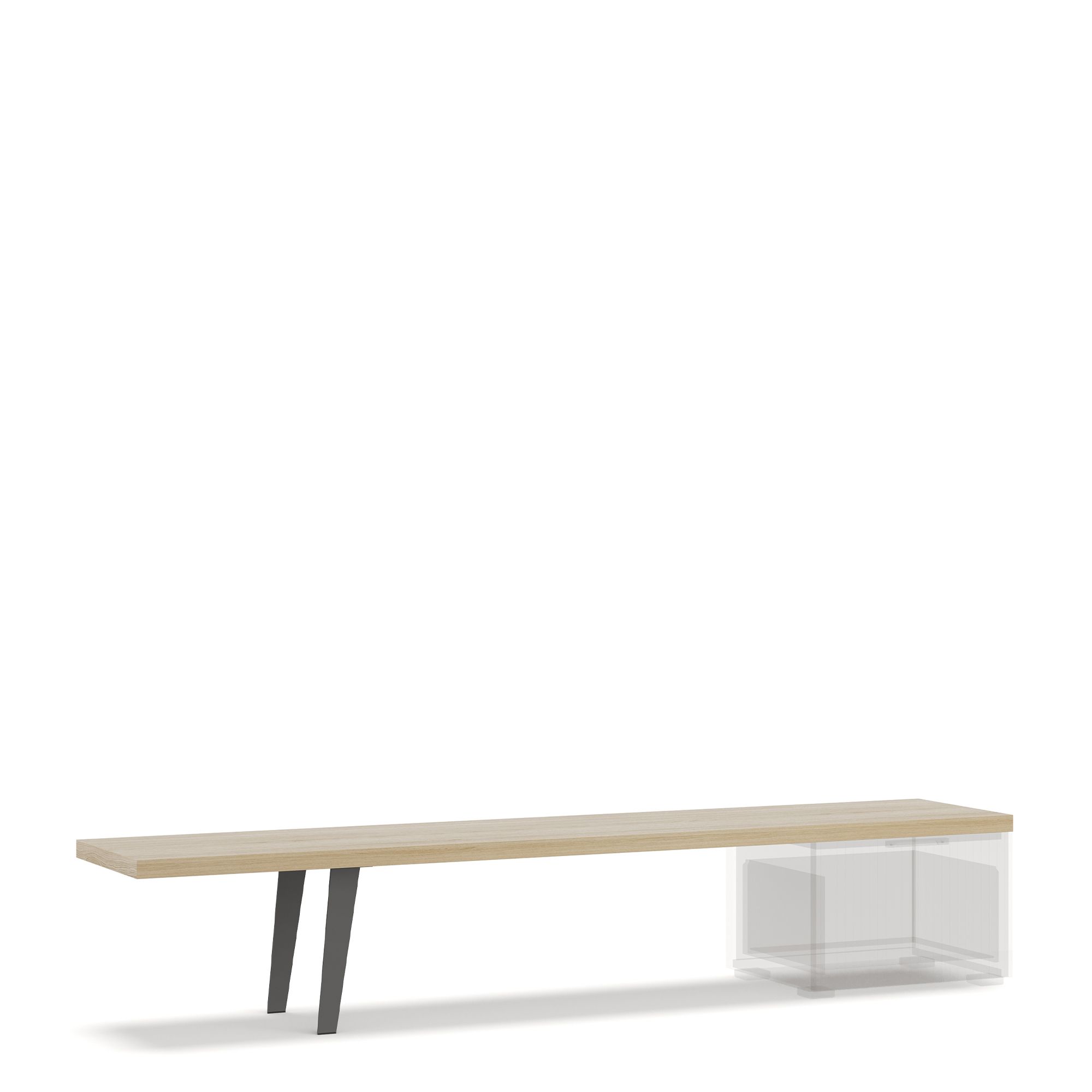 Продуманная система интерьерного проектирования включает приставные элементы, которые позволяют повысить функциональность мебельной композиции и придать ей стильный современный вид. Предусмотрены два варианта приставных столов. Более компактный предназначен для использования с тумбами высотой 33,8 см (устанавливается параллельно), стол на высоких опорах может комбинироваться с тумбами и комодами и располагаться как вдоль, так и поперек.