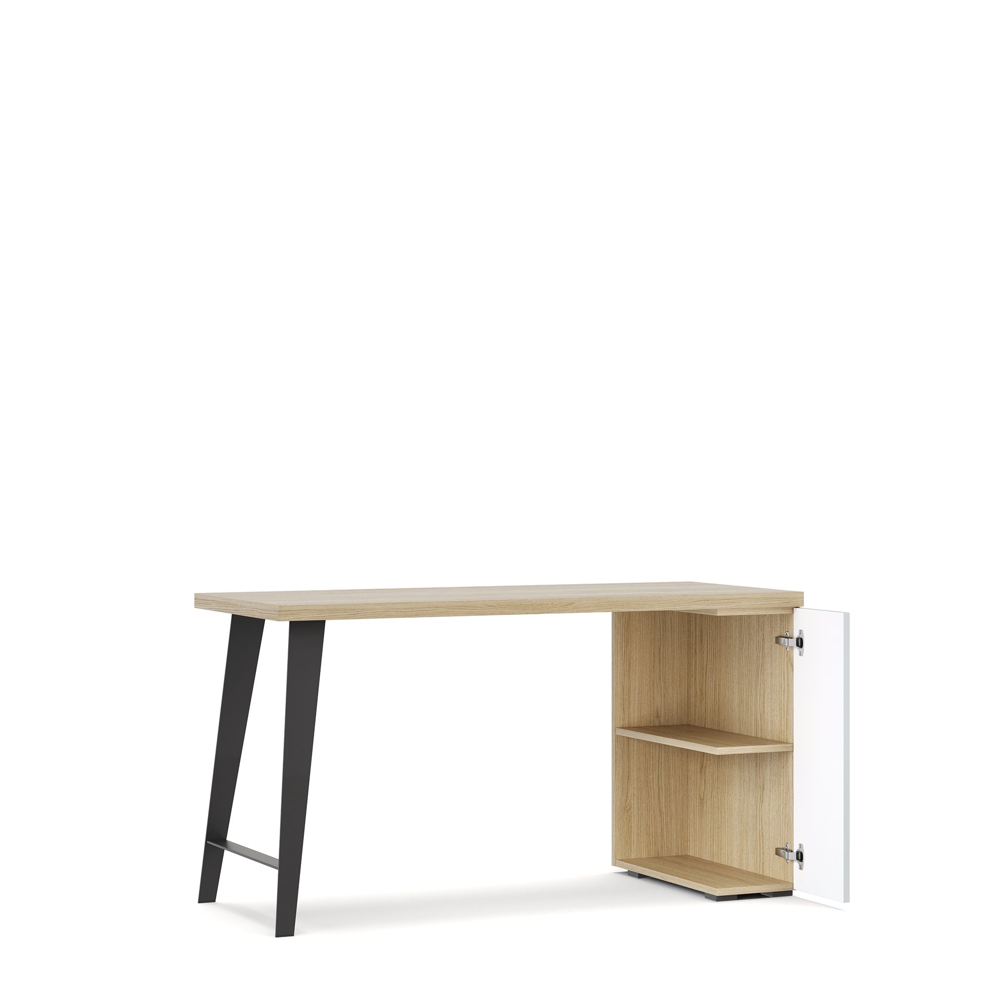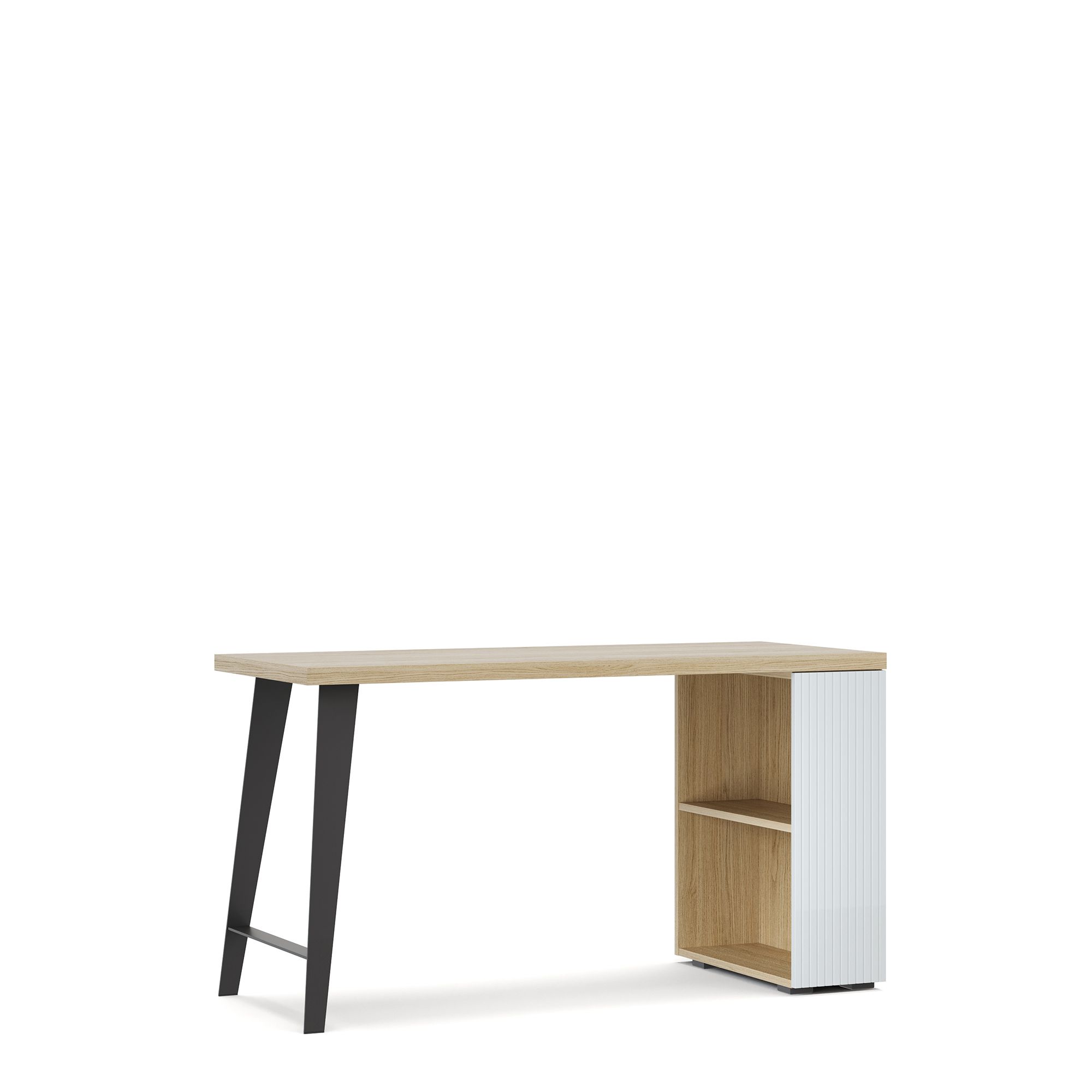Правый край столешницы письменного стола NAPOLI, выполненной в древесной текстуре, базируется на металлической опоре. Слева располагается модуль с панелью, декорированной вертикальной фрезеровкой, за которой располагается система открытого хранения с полками.