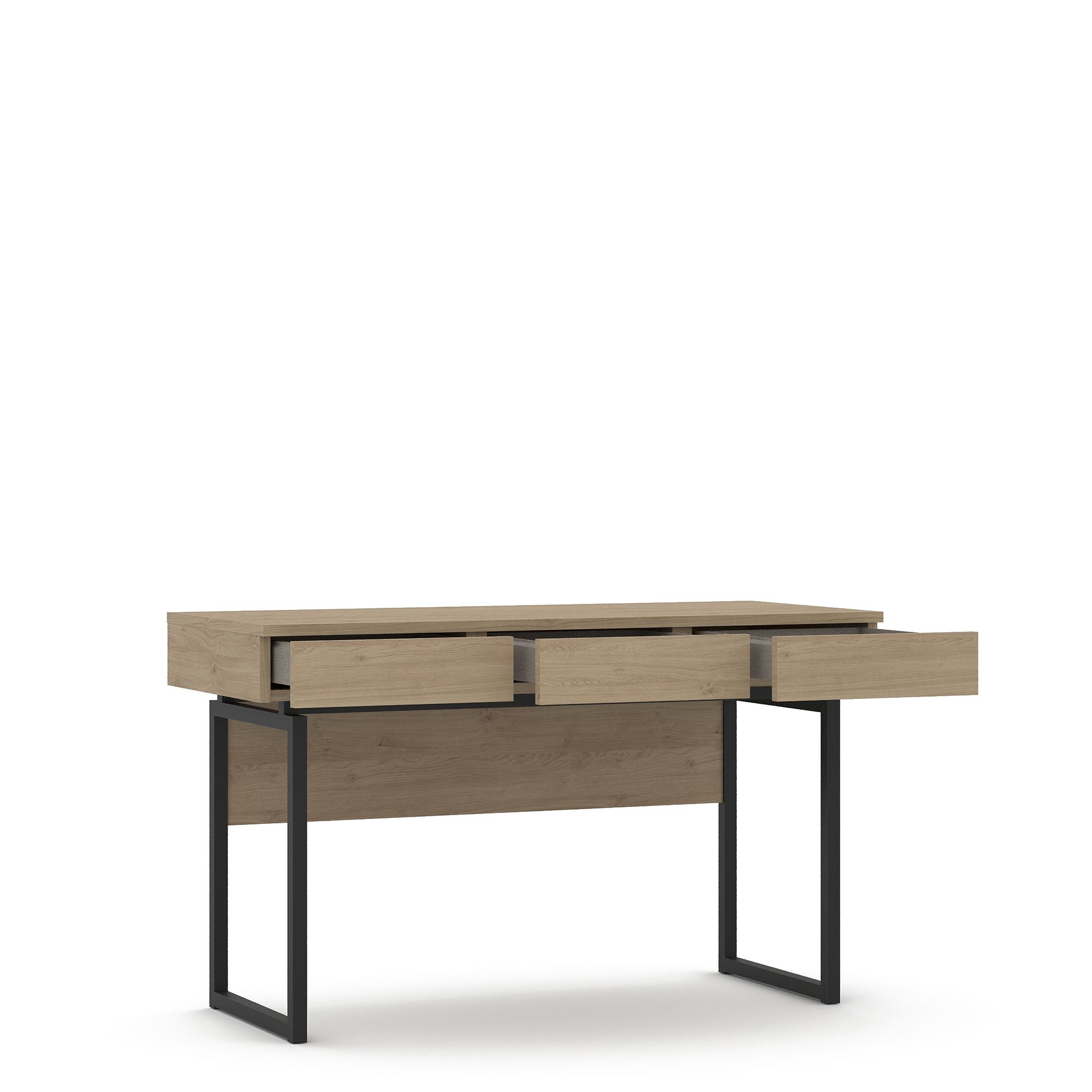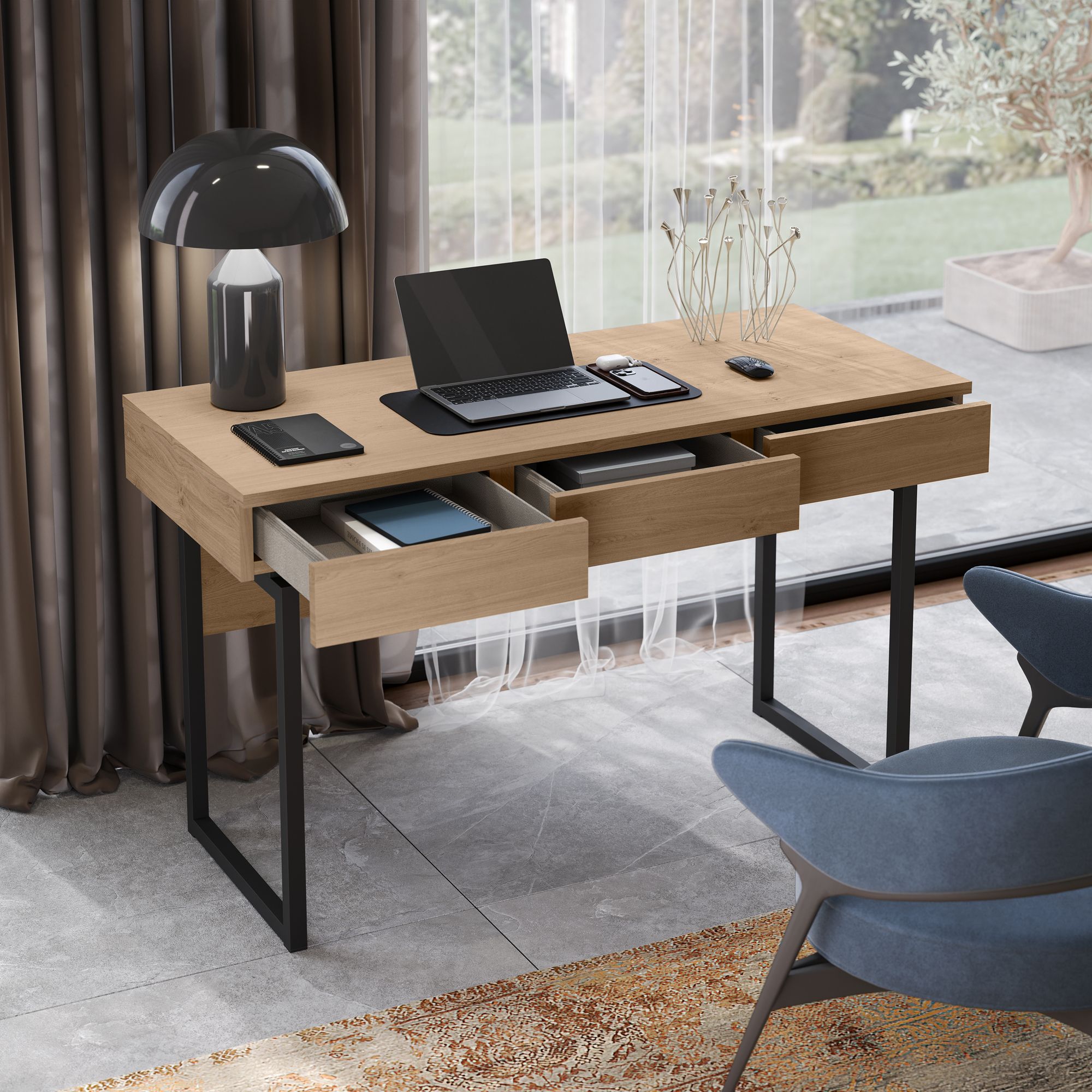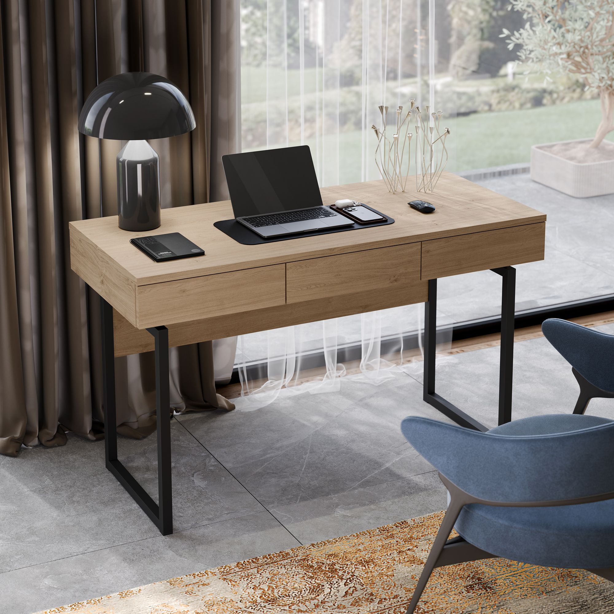 Письменный стол TERAMO на черных металлических опорах оснащен выдвижными ящиками. Ручки дизайном не предусмотрены, ящик открывается за фасад. При необходимости подключения аппаратуры рекомендуется дополнительный заказ заглушки для проводов.