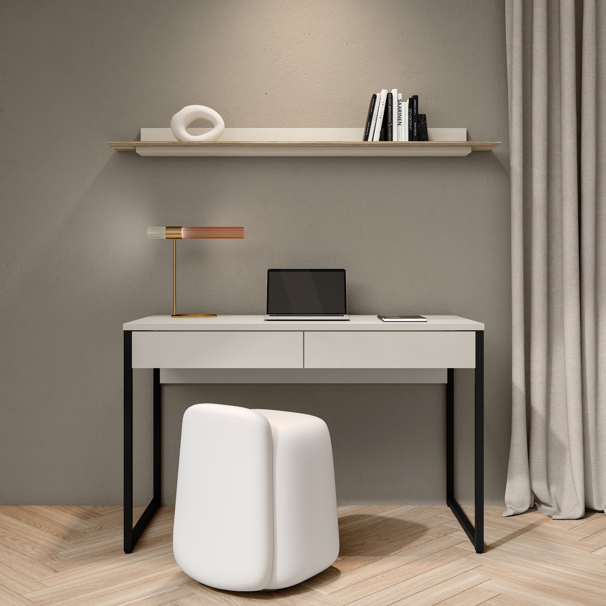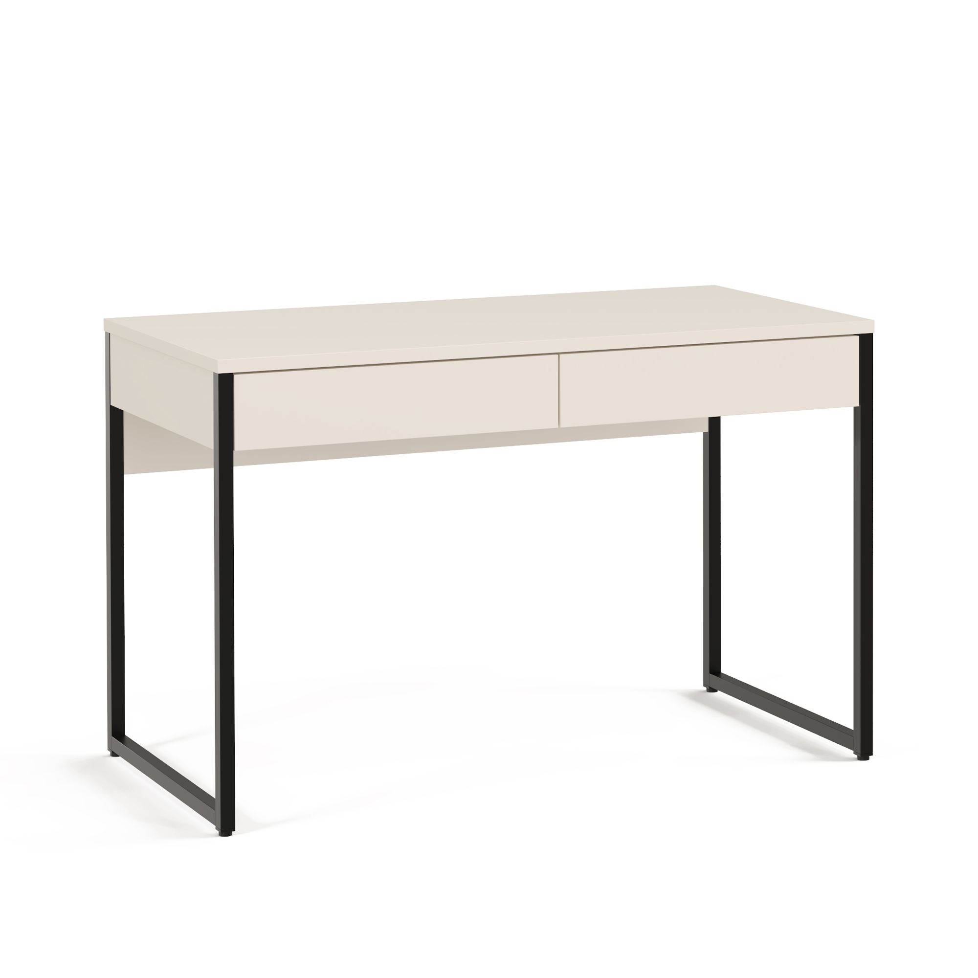 Письменный стол ARTA лаконичного дизайна с двумя выдвижными ящиками выполнен в отделке текстурой Cachmere матовый. Внутренний декор ящика выполнен в текстуре Шенилл, воспроизводящей рисунок плетения натуральной ткани. Стол базируется на прочных металлических опорах черного цвета.