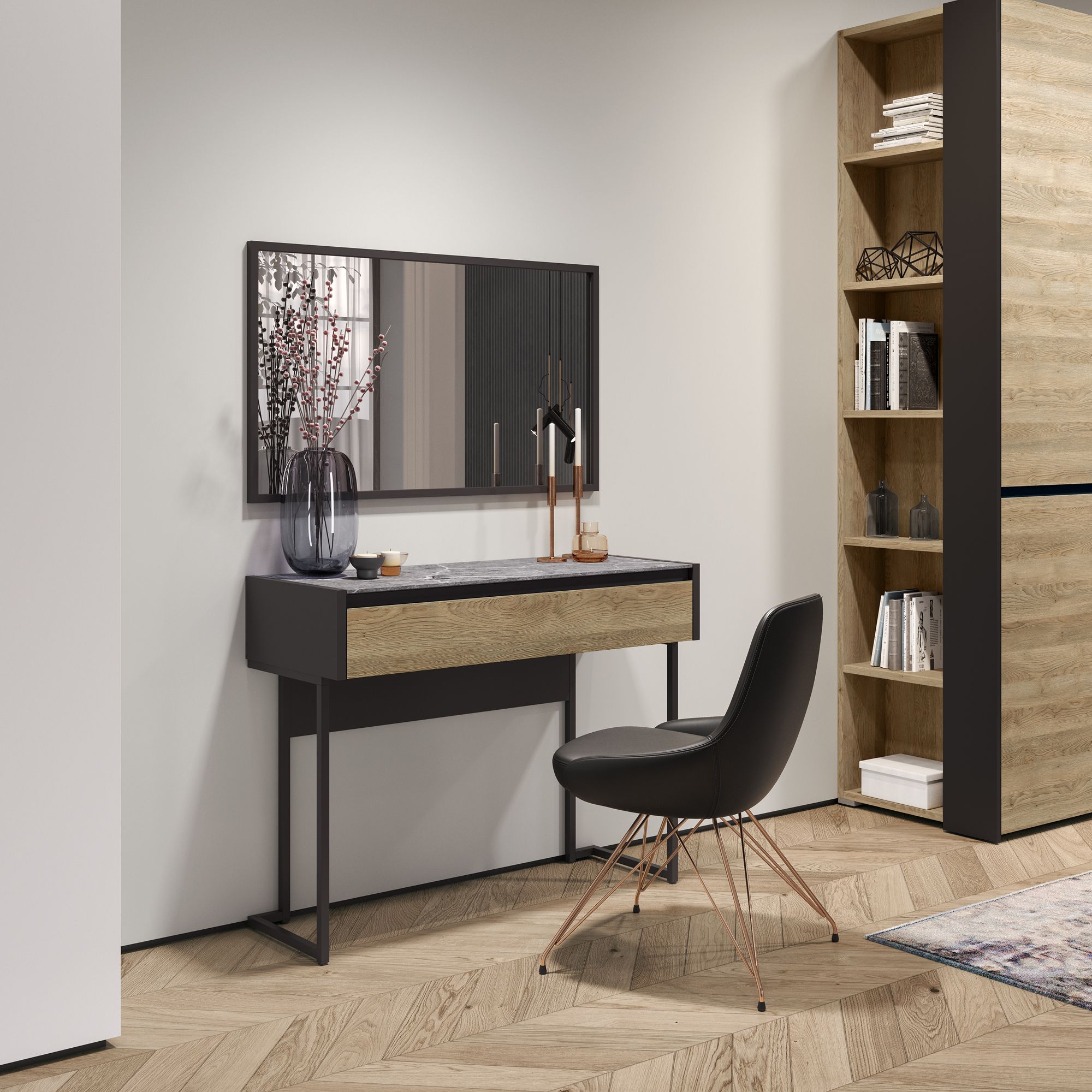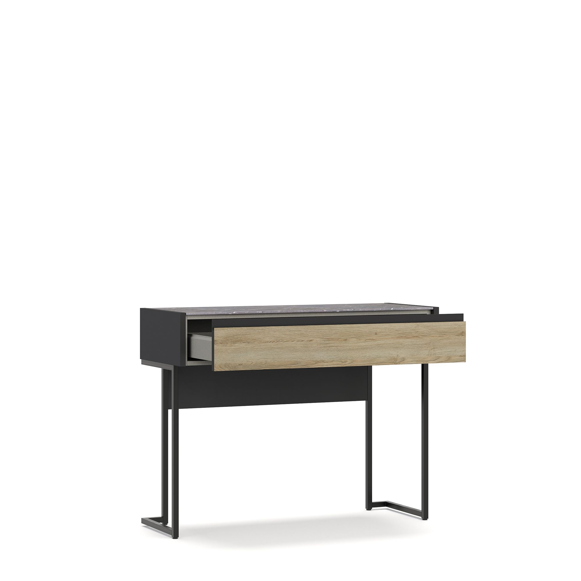 Стол BRUNO оснащен выдвижным ящиком и столешницей в текстуре Мрамор Patagonia. Внутренний декор ящика выполнен в текстуре Шенилл, воспроизводящей рисунок плетения натуральной ткани. Модель может использоваться в качестве туалетного стола (зеркало заказывается отдельно), а также для создания компактного рабочего места.