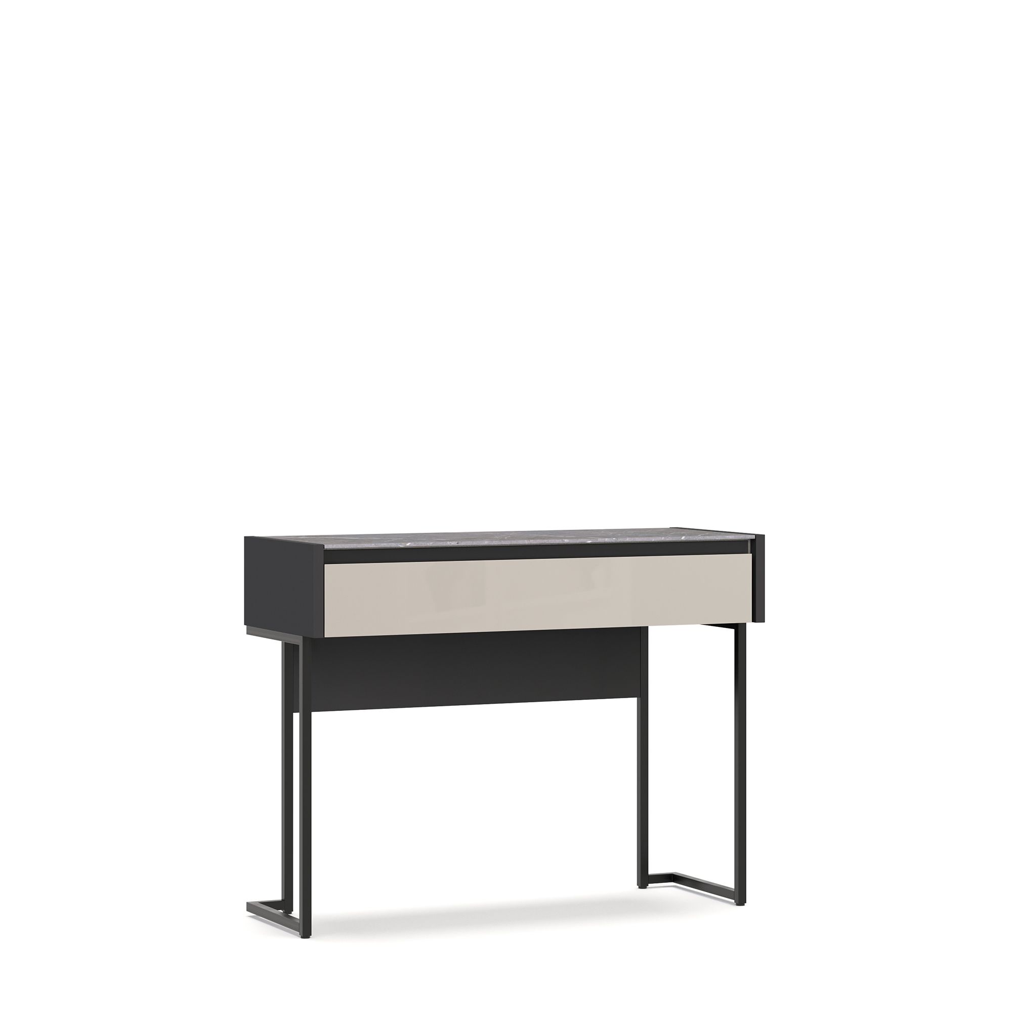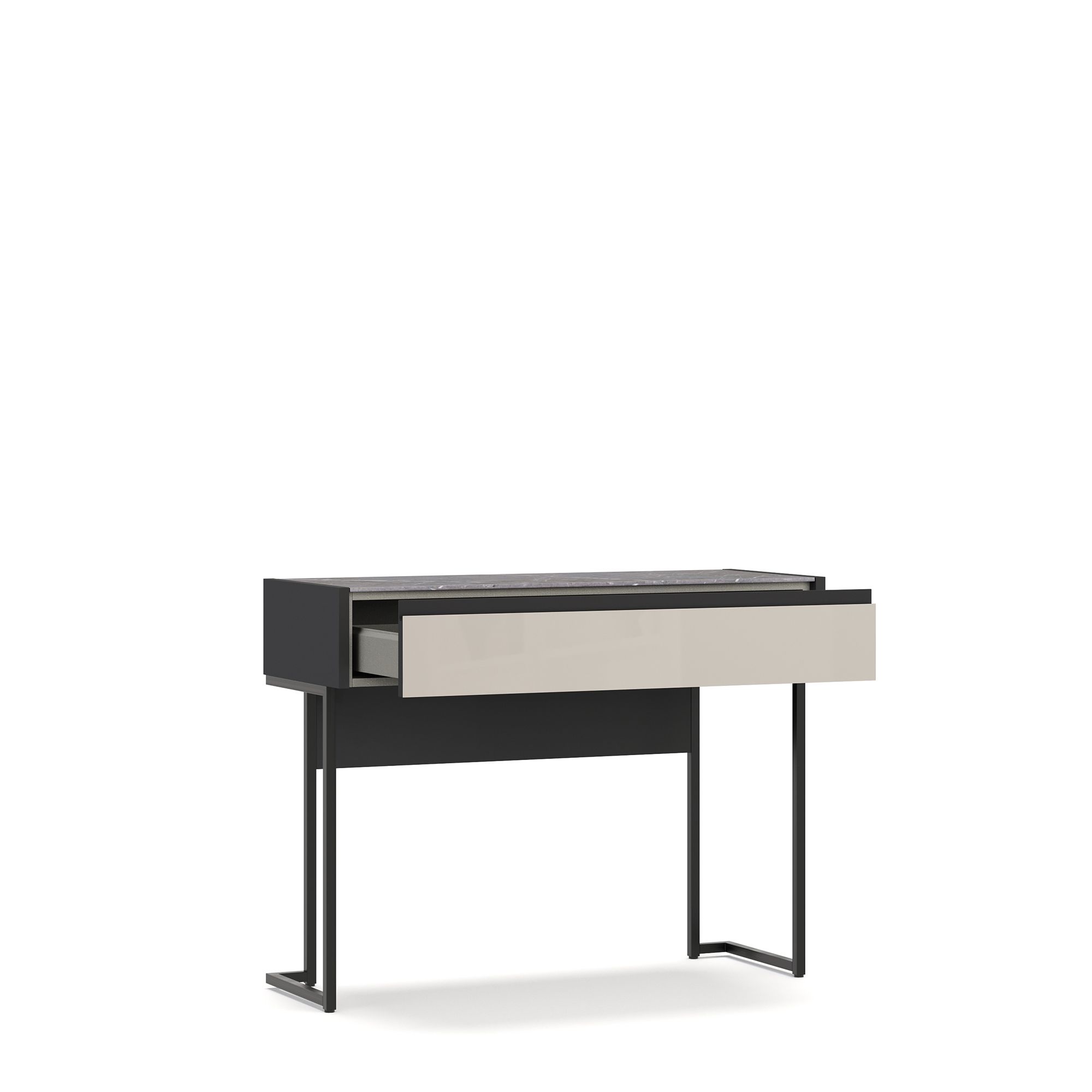 Стол BRUNO оснащен выдвижным ящиком и столешницей в текстуре Мрамор Patagonia. Внутренний декор ящика выполнен в текстуре Шенилл, воспроизводящей рисунок плетения натуральной ткани. Модель может использоваться в качестве туалетного стола (зеркало заказывается отдельно), а также для создания компактного рабочего места.