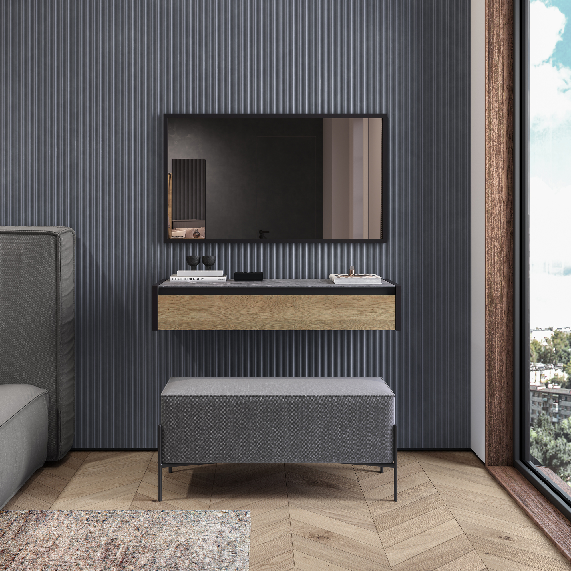 Подвесной стол-консоль BRUNO контрастного дизайна оснащен выдвижным ящиком и столешницей в текстуре Мрамор Patagonia. Внутренний декор ящика выполнен в текстуре Шенилл, воспроизводящей рисунок плетения натуральной ткани. Модель может использоваться в качестве туалетного стола (зеркало заказывается отдельно), а также для создания компактного рабочего места. Допустимая нагрузка на элемент составляет 15 кг.
