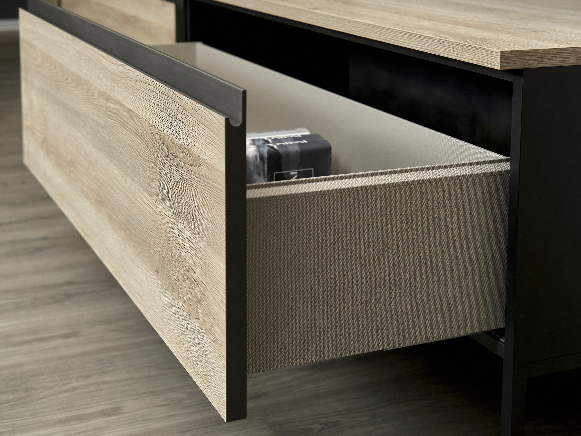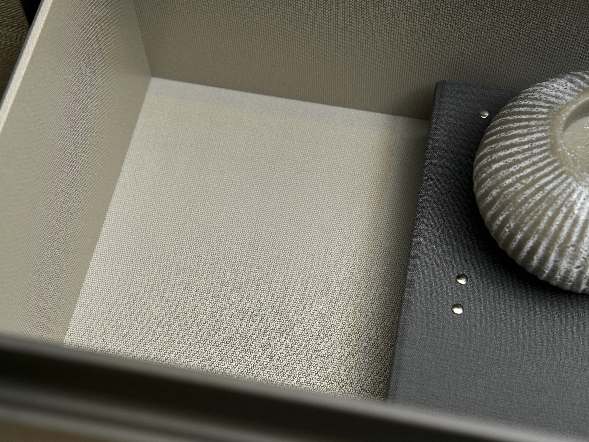 Внутреннее пространство выдвижных ящиков выполнено в отделке текстурой Шенилл, которая в точности воспроизводит рисунок плетения натуральной ткани и применяется, как правило, исключительно в европейских премиальных коллекциях.