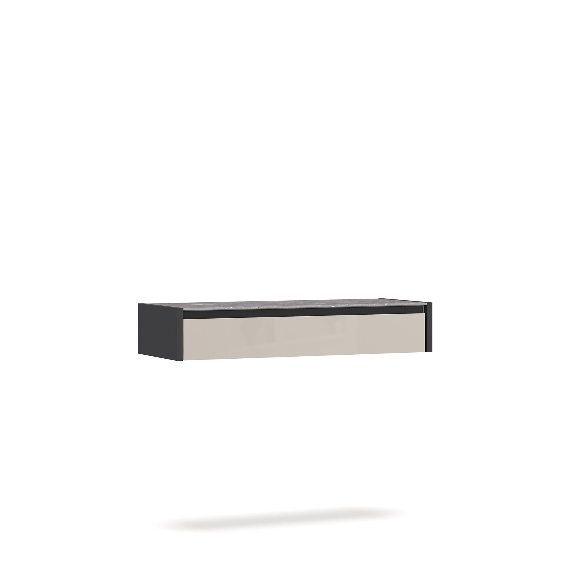Подвесной стол-консоль BRUNO контрастного дизайна оснащен выдвижным ящиком и столешницей в текстуре Мрамор Patagonia. Внутренний декор ящика выполнен в текстуре Шенилл, воспроизводящей рисунок плетения натуральной ткани. Модель может использоваться в качестве туалетного стола (зеркало заказывается отдельно), а также для создания компактного рабочего места. Допустимая нагрузка на элемент составляет 15 кг.