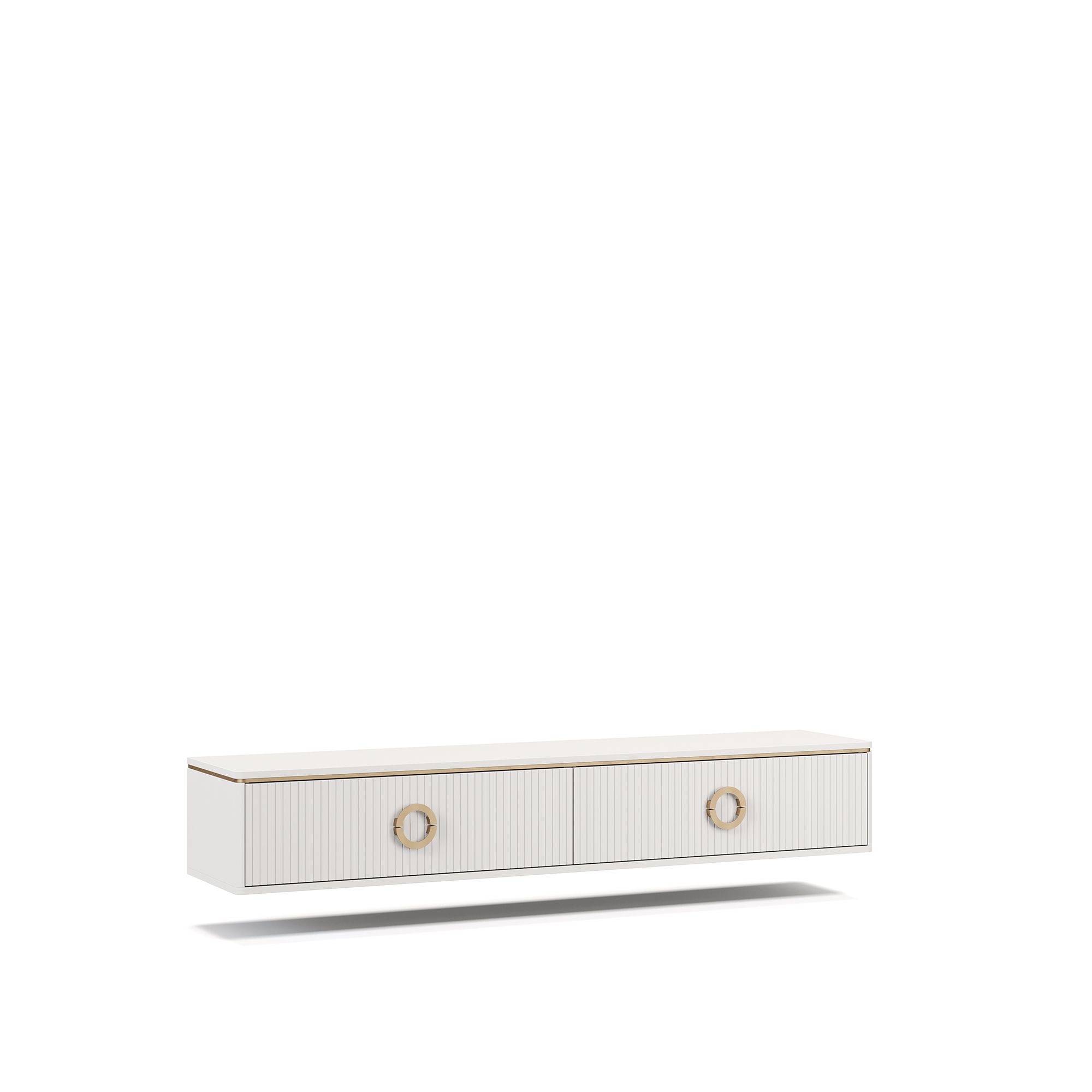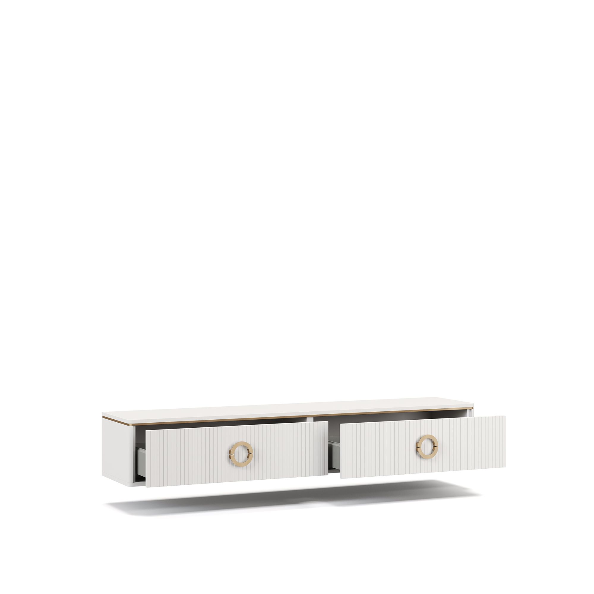Навесная ТВ-тумба TIARA оснащена двумя выдвижными ящиками с внутренней текстурой Шенилл, повторяющей рисунок натуральной ткани. Фасады модели выполнены в отделке эмалью и декорированы вертикальной фрезеровкой. Выдвижные ящики оснащены ручками в отделке Матовое золото. Максимально допустимая распределенная нагрузка – 20 кг.