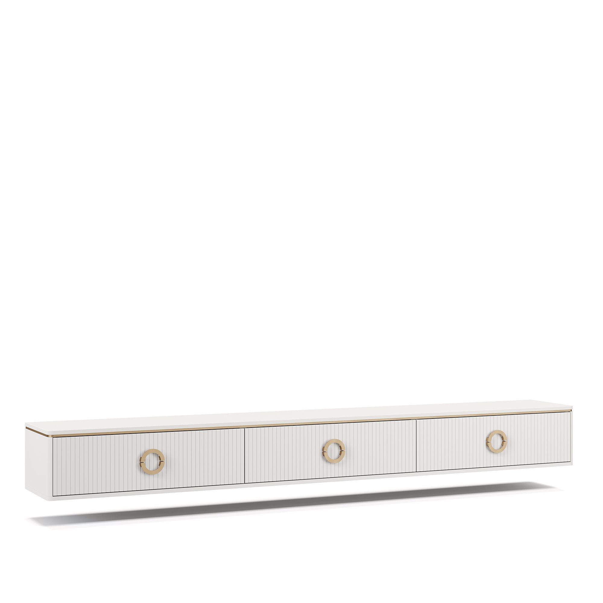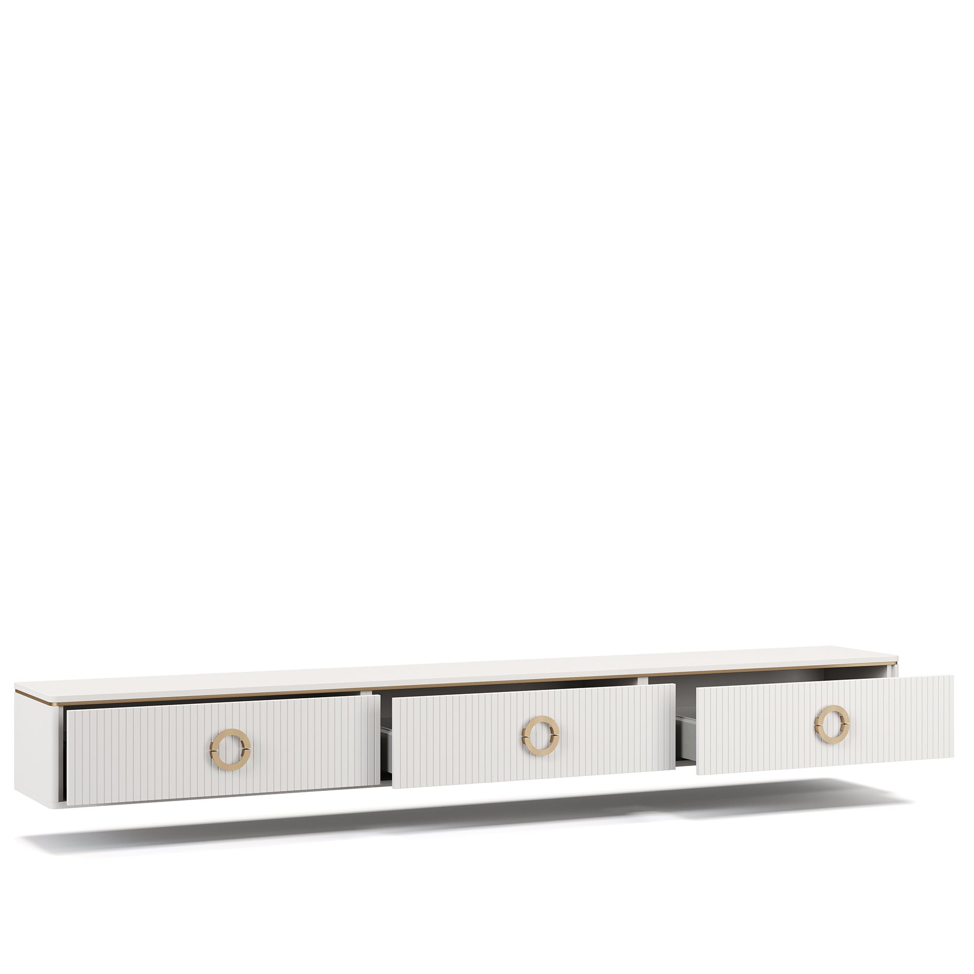 Навесная ТВ-тумба TIARA оснащена тремя выдвижными ящиками с внутренней текстурой Шенилл, повторяющей рисунок натуральной ткани. Фасады модели выполнены в отделке эмалью и декорированы вертикальной фрезеровкой. Выдвижные ящики оснащены ручками в отделке Матовое золото. Максимально допустимая распределенная нагрузка – 25 кг.