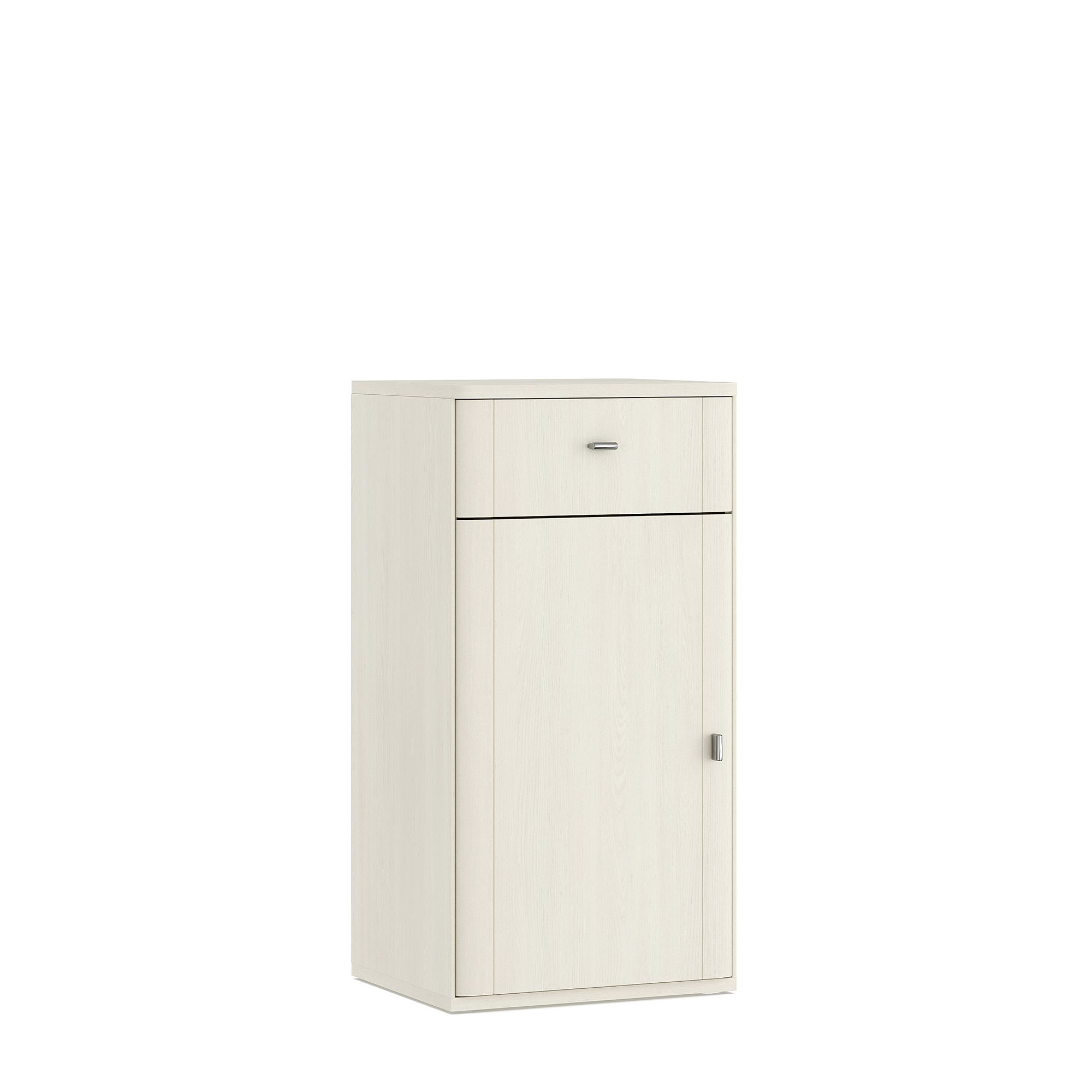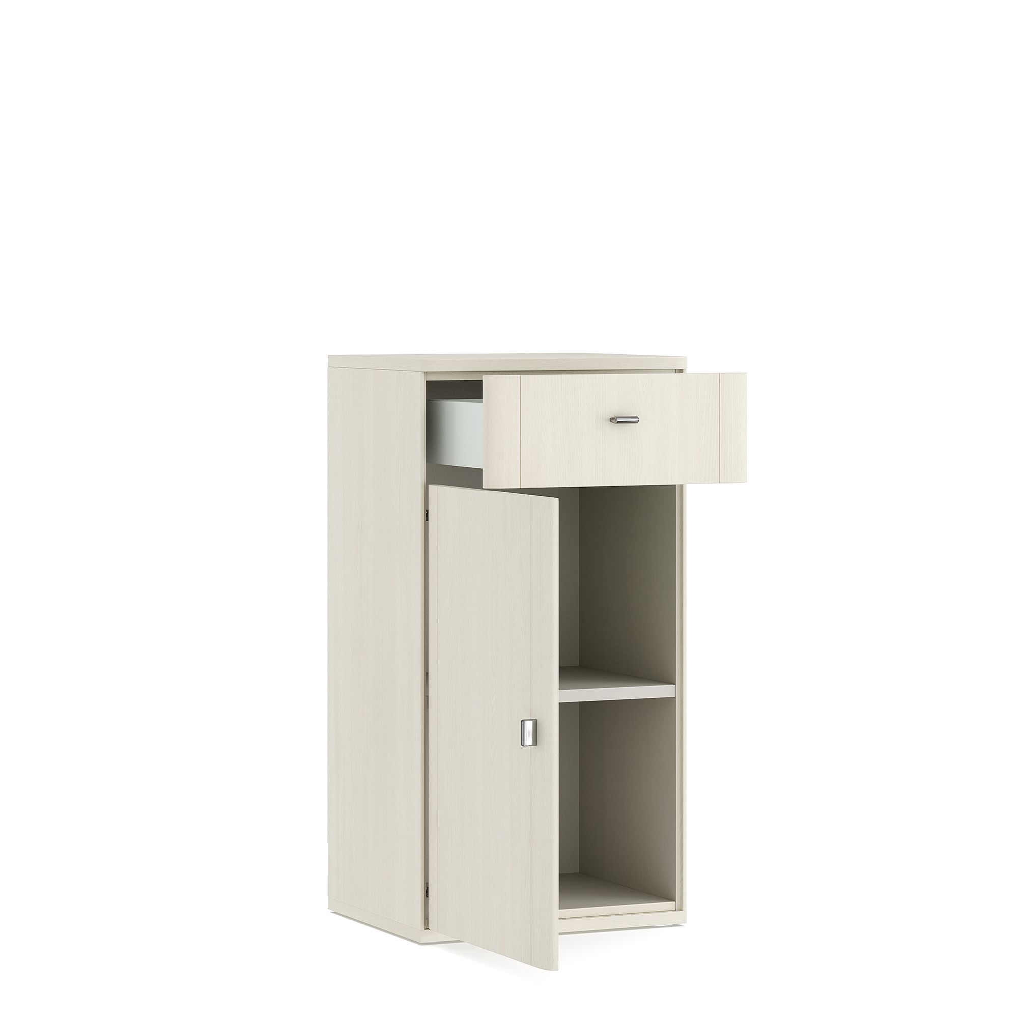 Тумба для обуви оснащена выдвижным ящиком для мелочей и распашным фасадом, за которым располагается полка из ДСП.