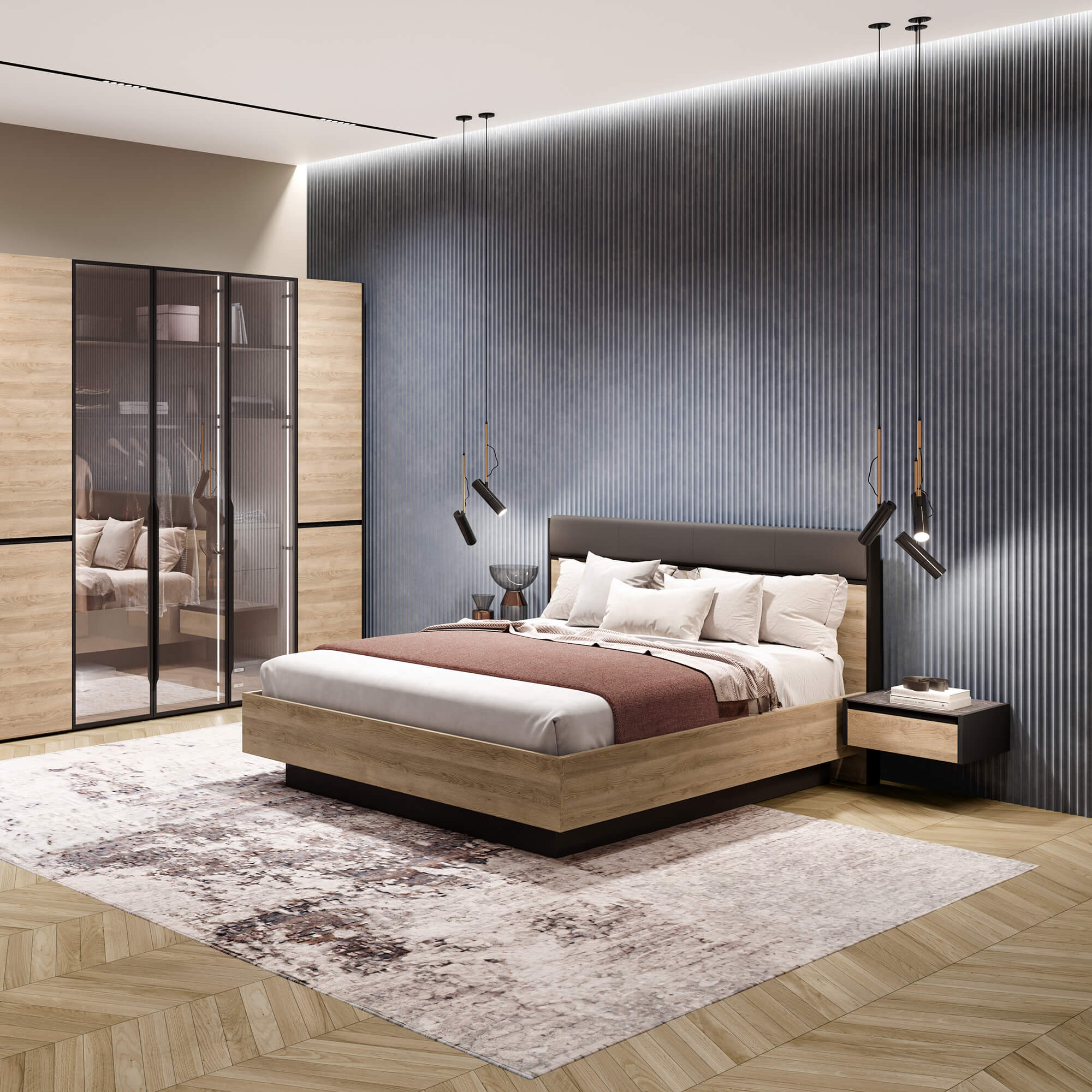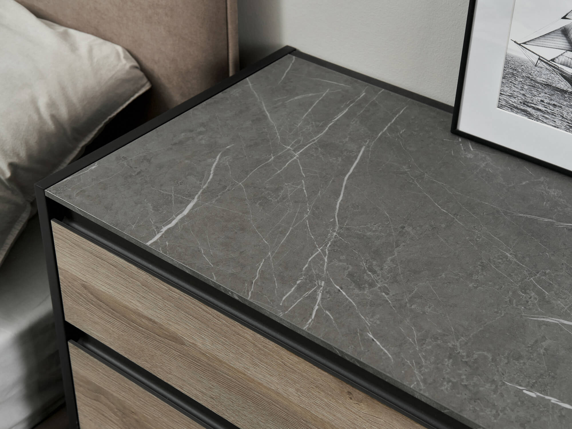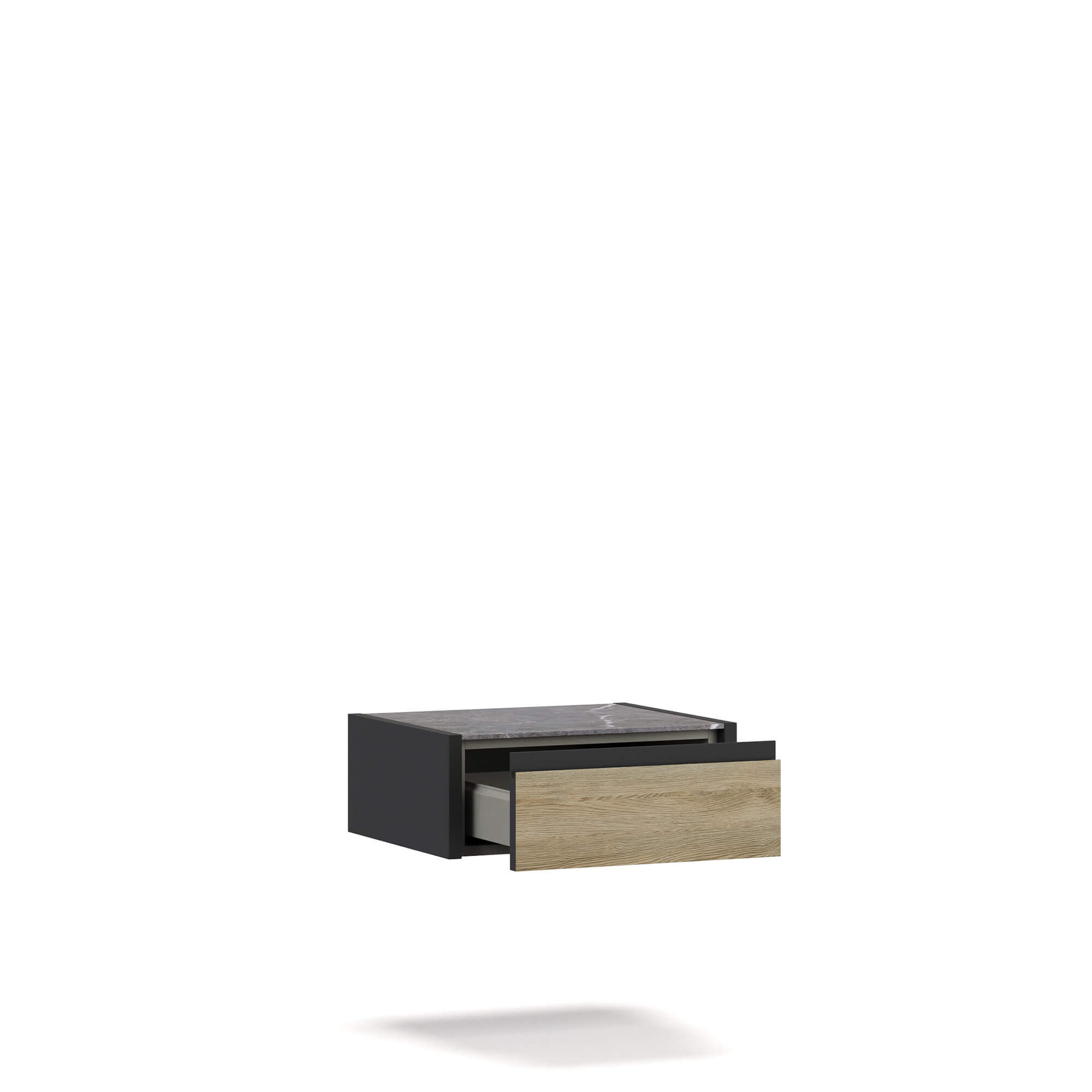 Навесная прикроватная тумба BRUNO оснащена двумя выдвижными ящиками с J-ручкой. Максимальная распределенная нагрузка на элемент составляет 15 кг. Фасады ящиков выполнены в текстуре Дуб Гладстоун Серо-бежевый, верхняя крышка – в акцентном декоре Мрамор Patagonia.