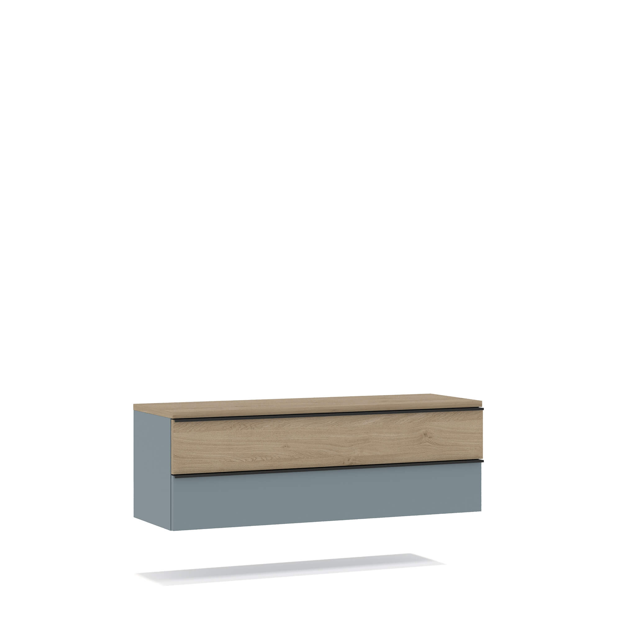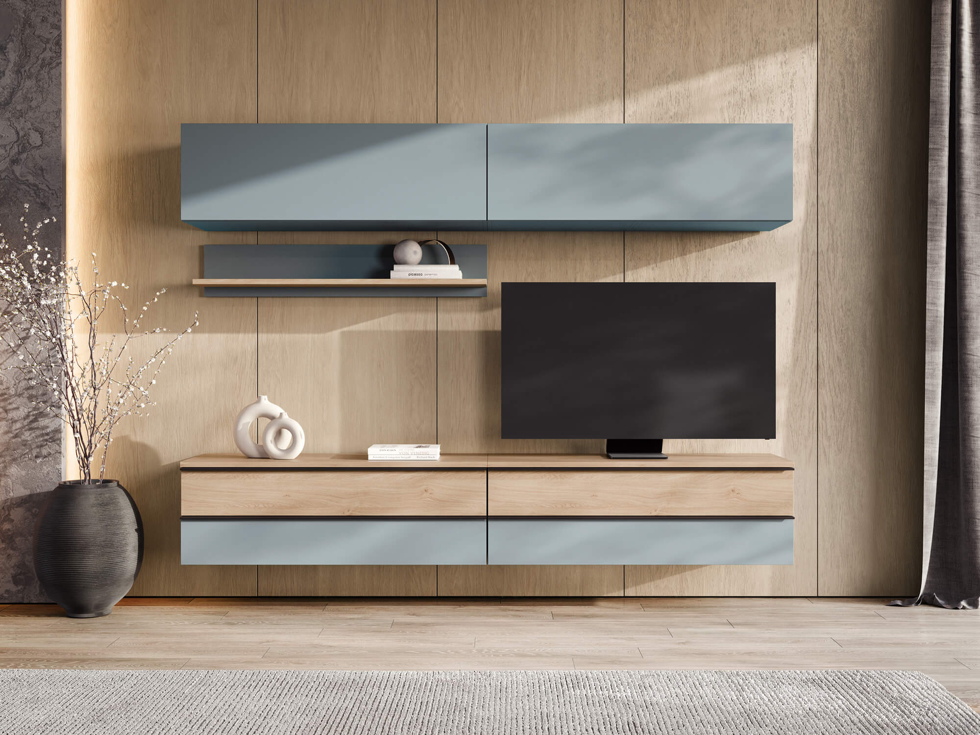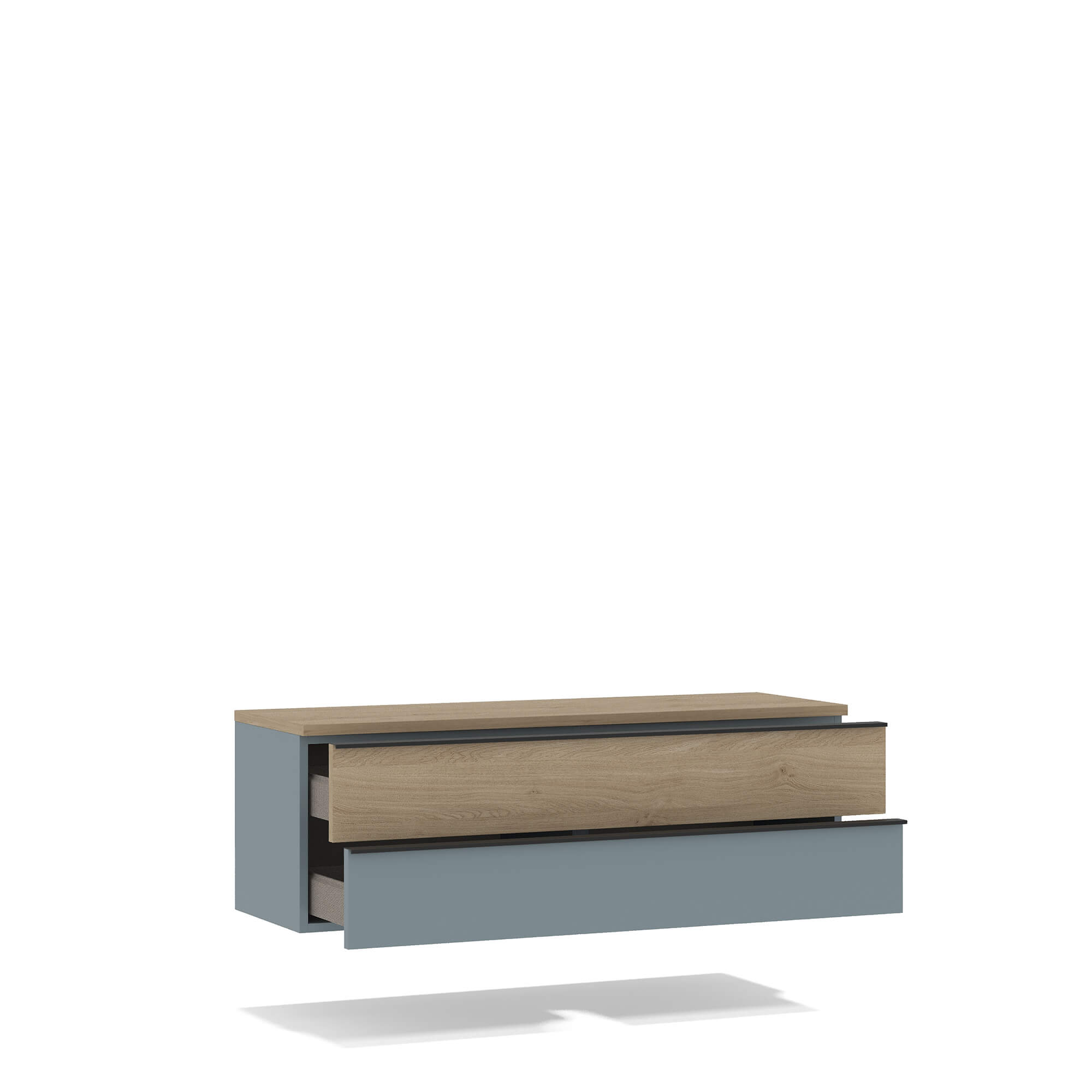 Навесная ТВ-тумба TERAMO оснащена двумя выдвижными ящиками. Максимальная распределенная нагрузка на элемент составляет 20 кг.