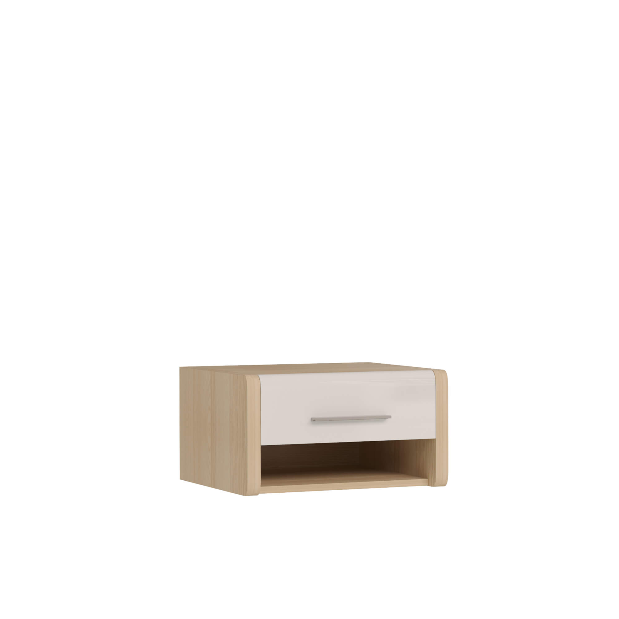 Навесная прикроватная тумба ESTE со скругленной формой боковин оснащена выдвижным ящиком. Максимальная распределенная нагрузка на элемент составляет 10 кг. Модель оснащена накладной металлической ручкой в отделке Хром-глянец.