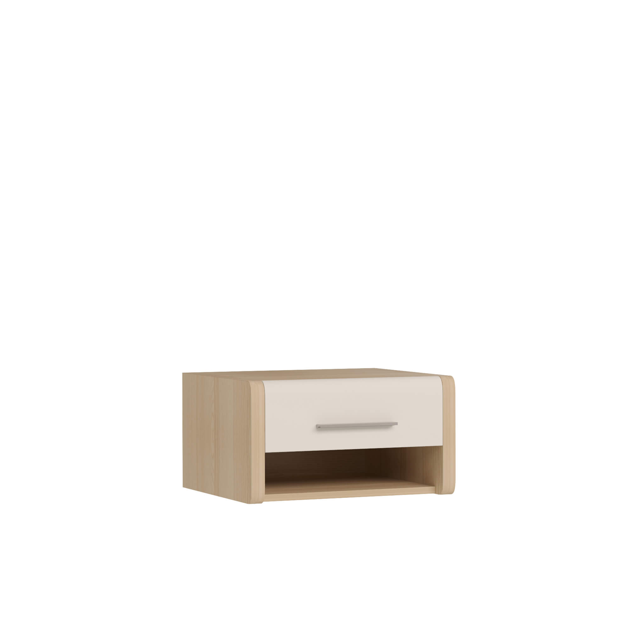 Навесная прикроватная тумба ESTE со скругленной формой боковин оснащена выдвижным ящиком. Максимальная распределенная нагрузка на элемент составляет 10 кг. Модель оснащена накладной металлической ручкой в отделке Хром-глянец.