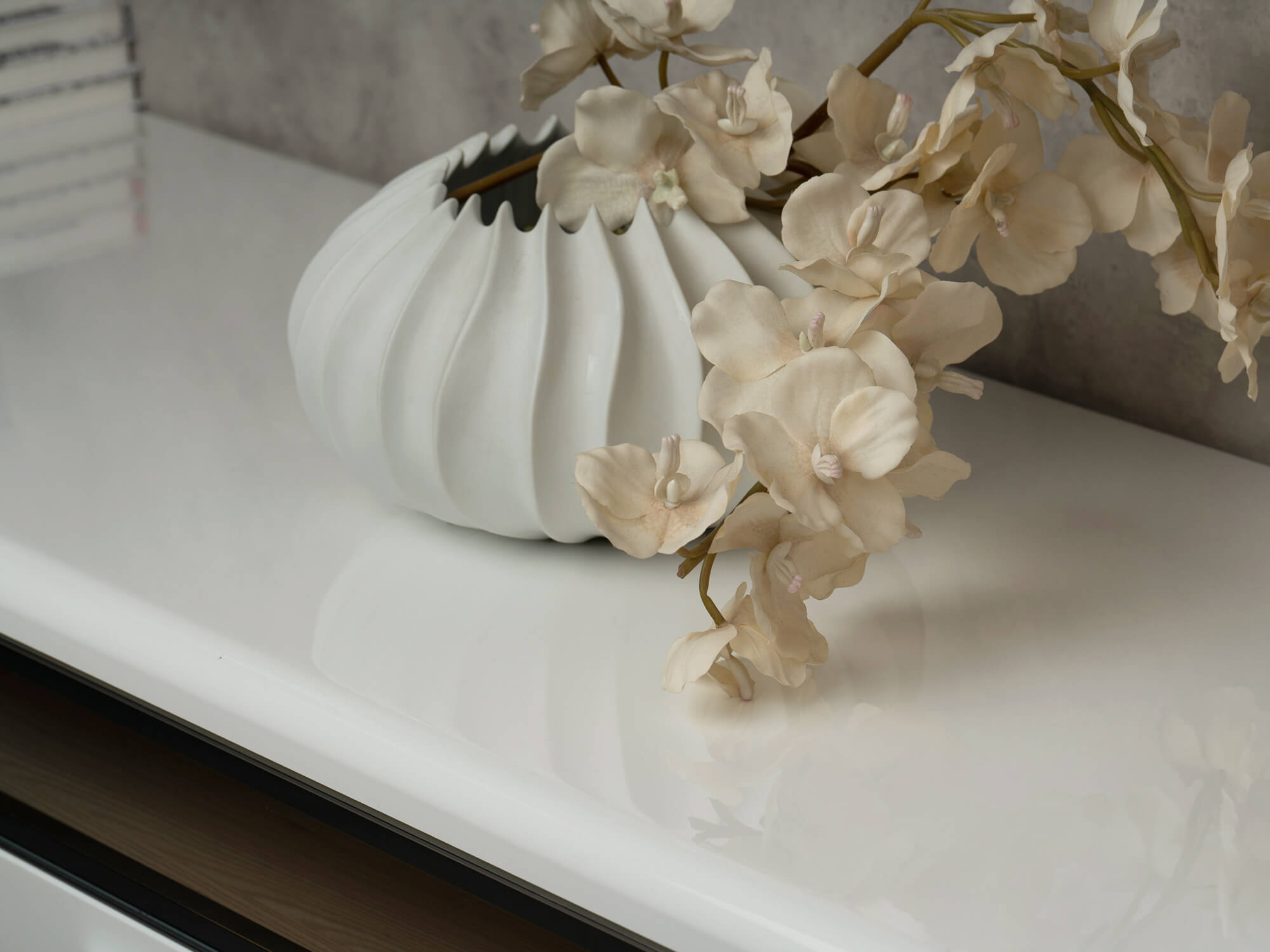 В производстве фасадов коллекции используется технология окутывания, позволяющая получить гладкие детали без кромок, которые обладают высокой долговечностью благодаря надежной защите от влаги и практичны в уборке.