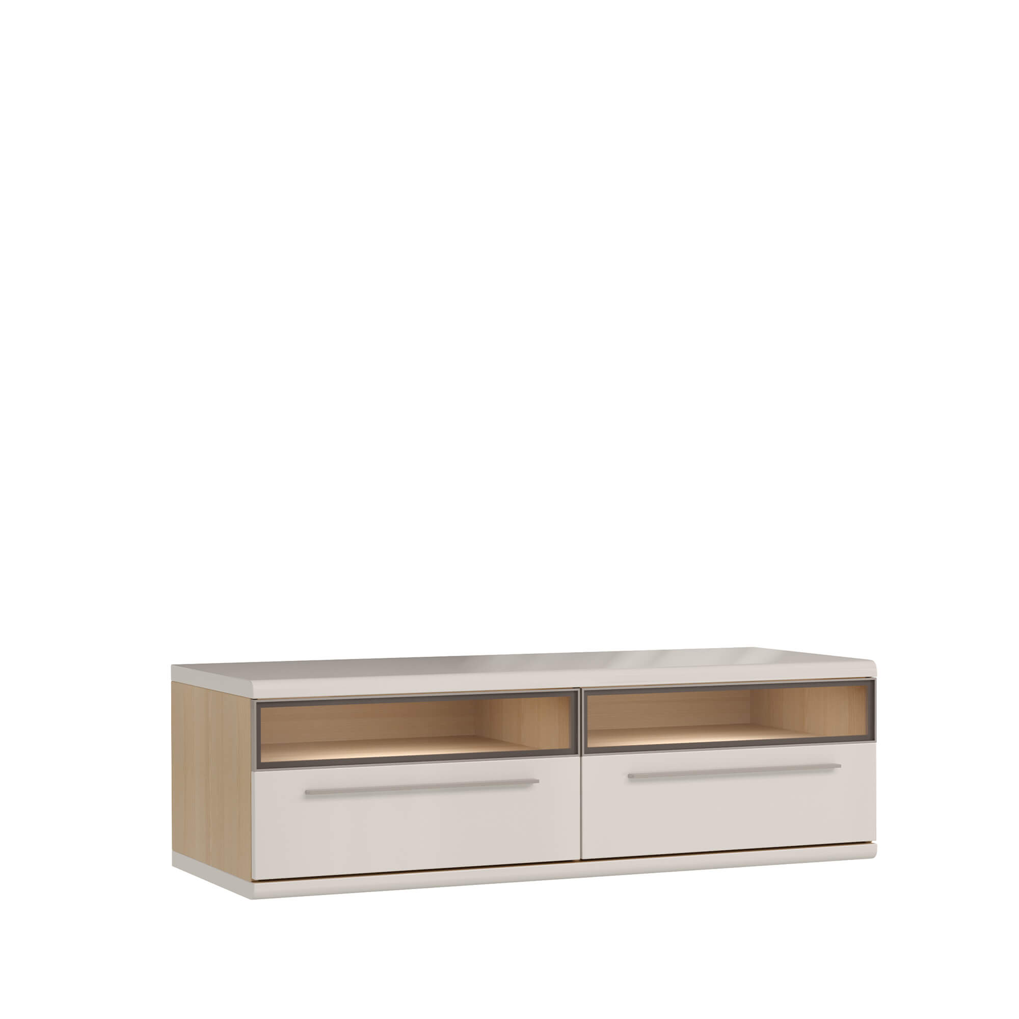 Навесная ТВ-тумба ESTE оснащена двумя выдвижными ящиками с комбинированными фасадами. В верхней части фасадов расположена вставка с тонированным стеклом, за которой находится световое оборудование. Система включения светильников не входит в комплект мебели и заказывается отдельно. Максимальная распределенная нагрузка на элемент составляет 30 кг.