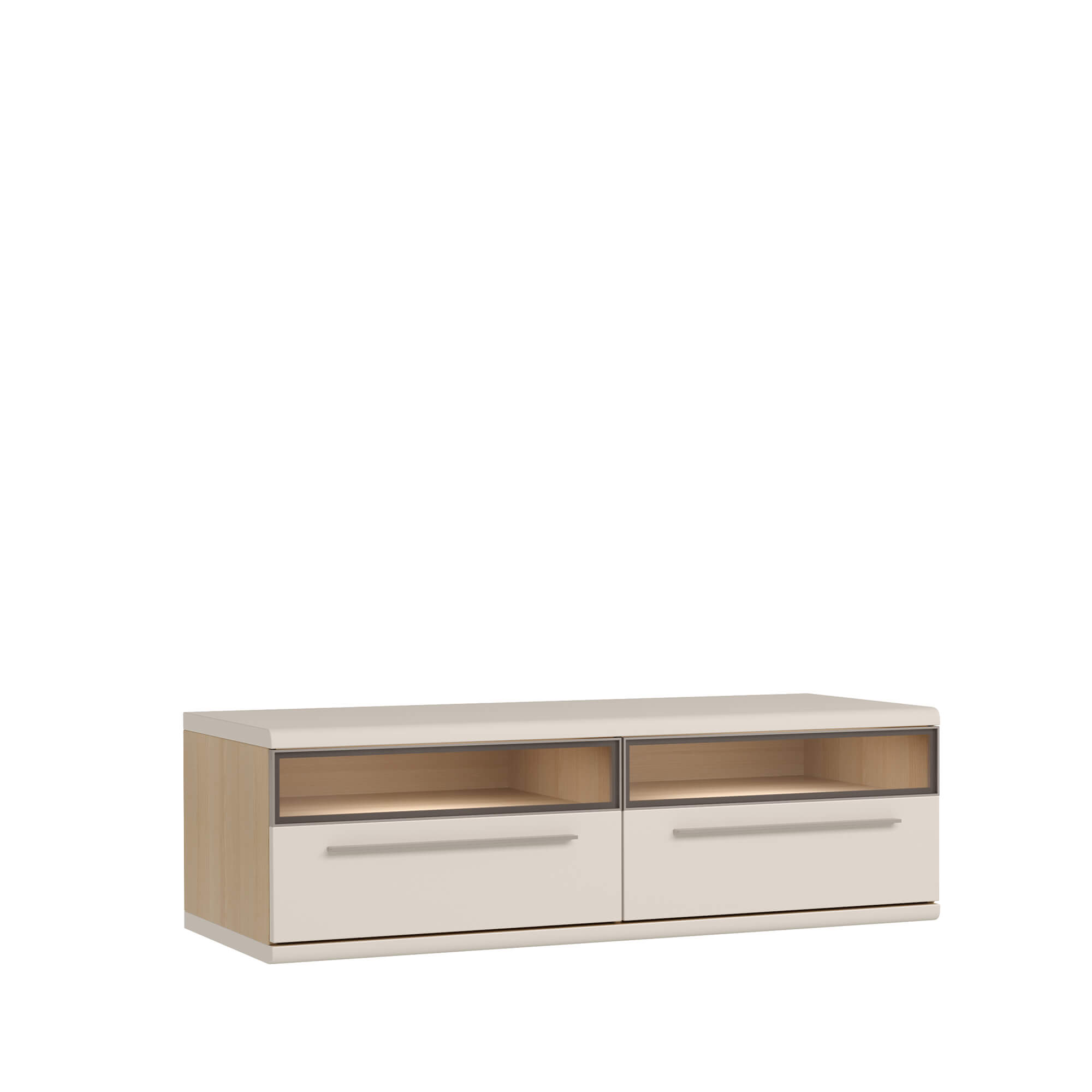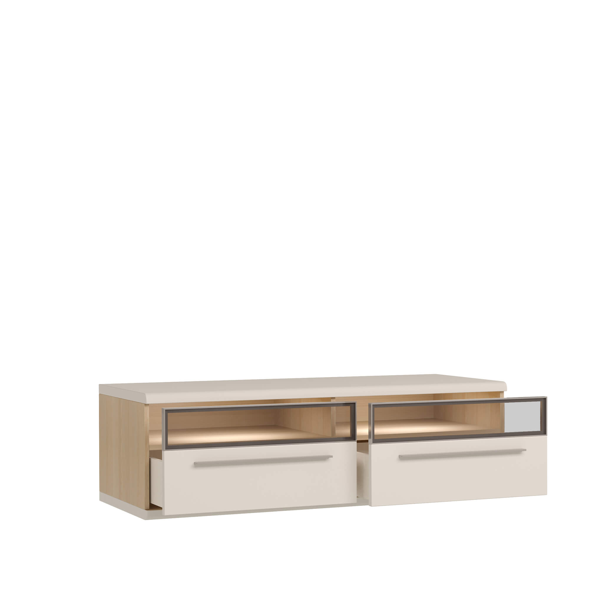 Навесная ТВ-тумба ESTE оснащена двумя выдвижными ящиками с комбинированными фасадами. В верхней части фасадов расположена вставка с тонированным стеклом, за которой находится световое оборудование. Система включения светильников не входит в комплект мебели и заказывается отдельно. Максимальная распределенная нагрузка на элемент составляет 30 кг.