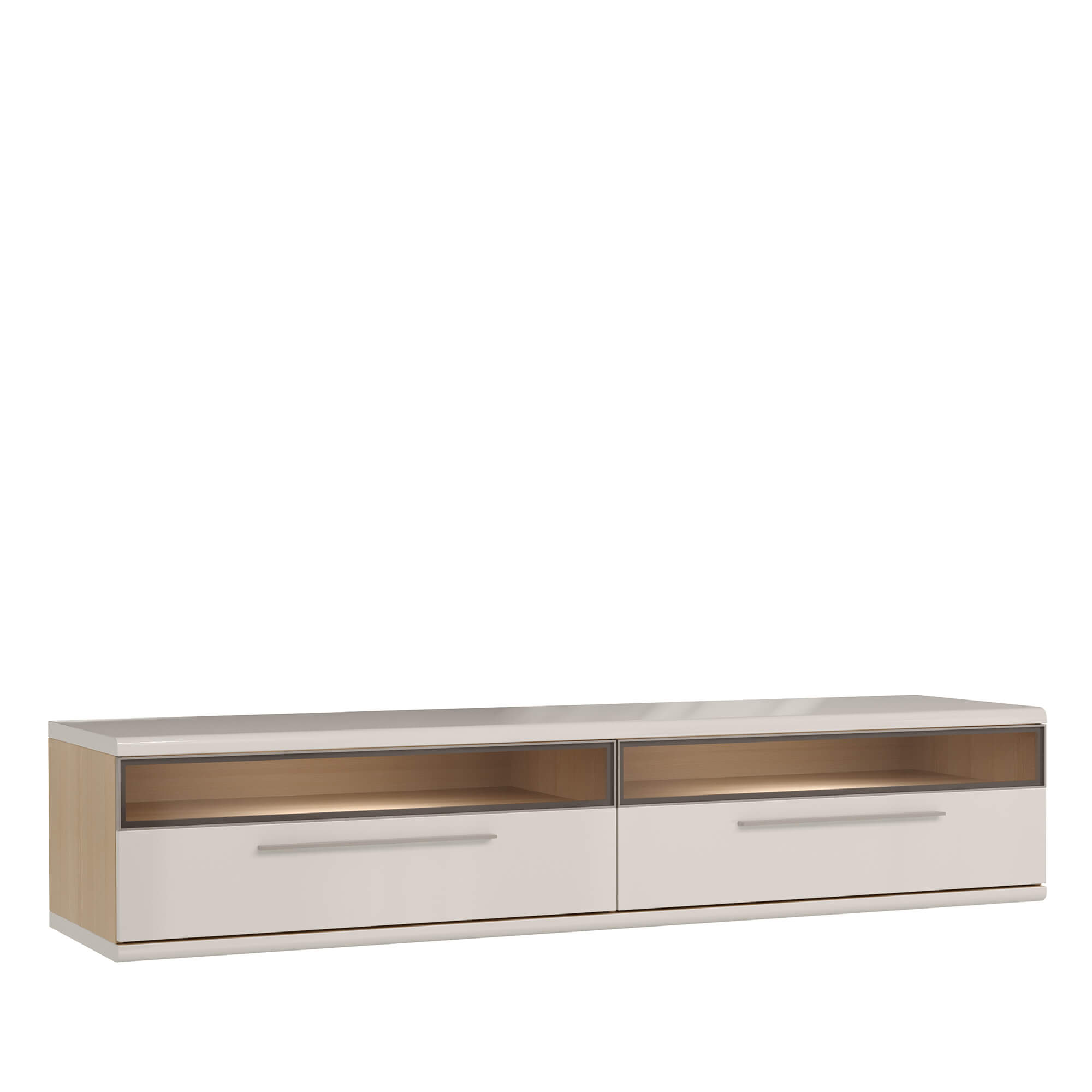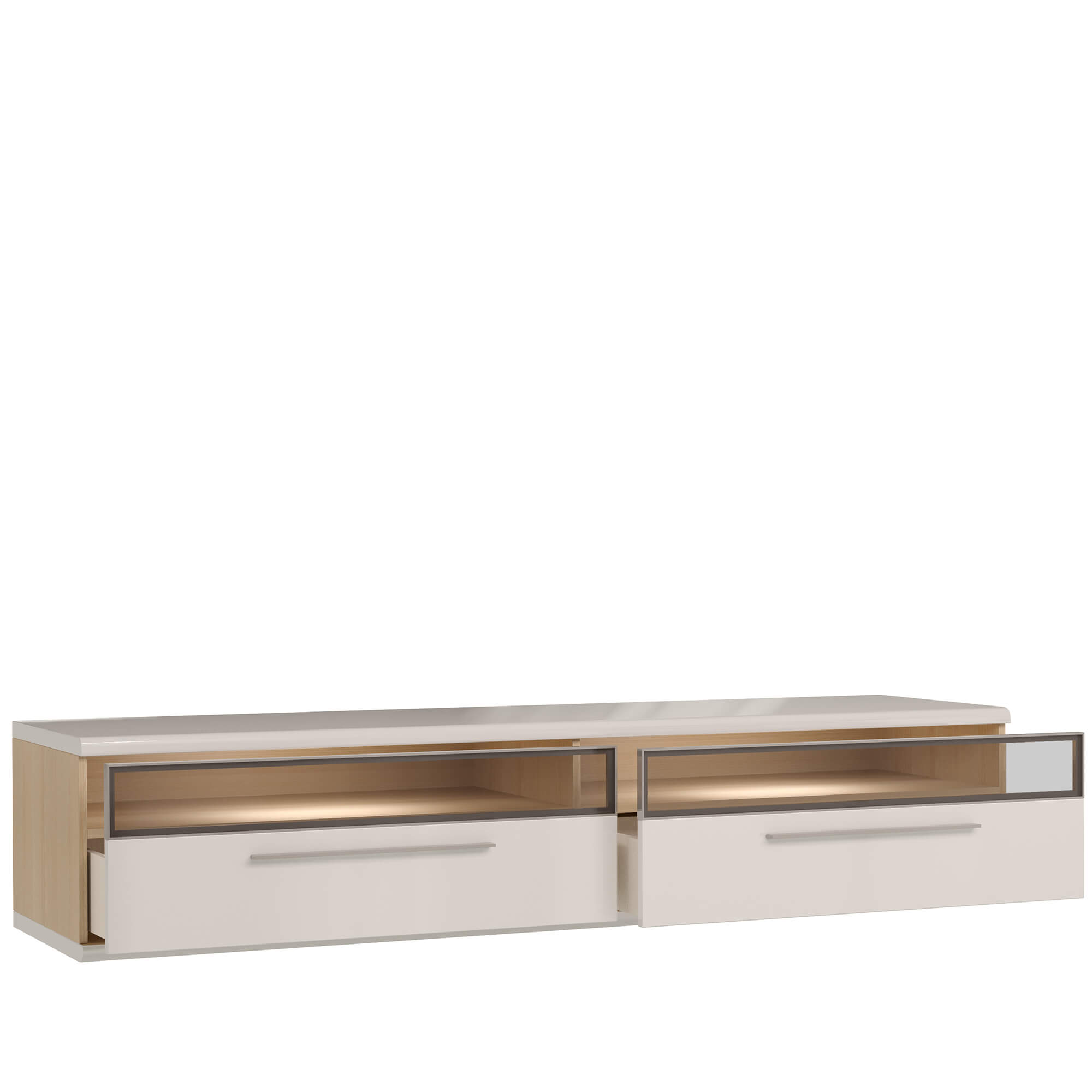 Навесная ТВ-тумба ESTE оснащена двумя выдвижными ящиками с комбинированными фасадами. В верхней части фасадов расположена вставка с тонированным стеклом, за которой находится световое оборудование. Система включения светильников не входит в комплект мебели и заказывается отдельно. Максимальная распределенная нагрузка на элемент составляет 30 кг.