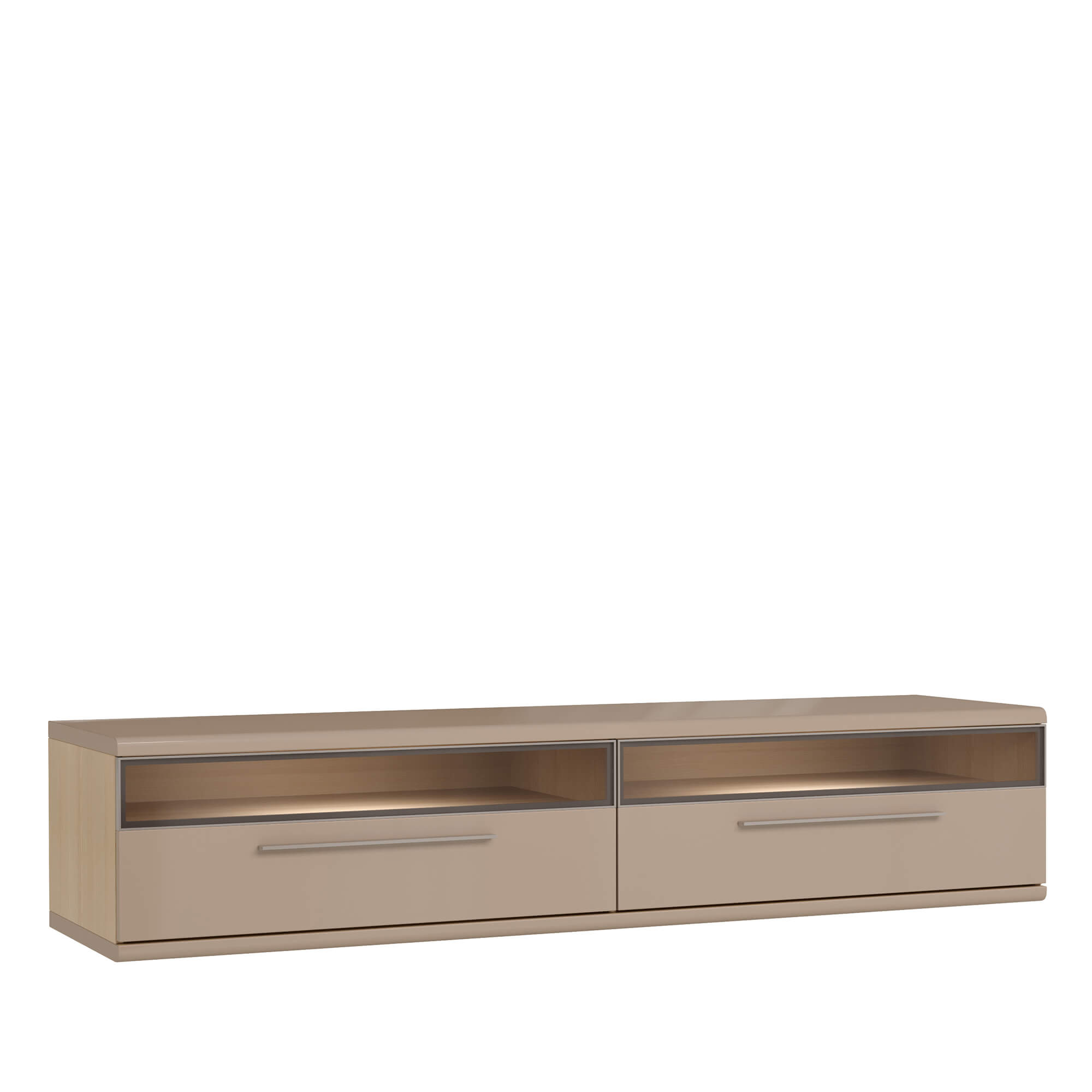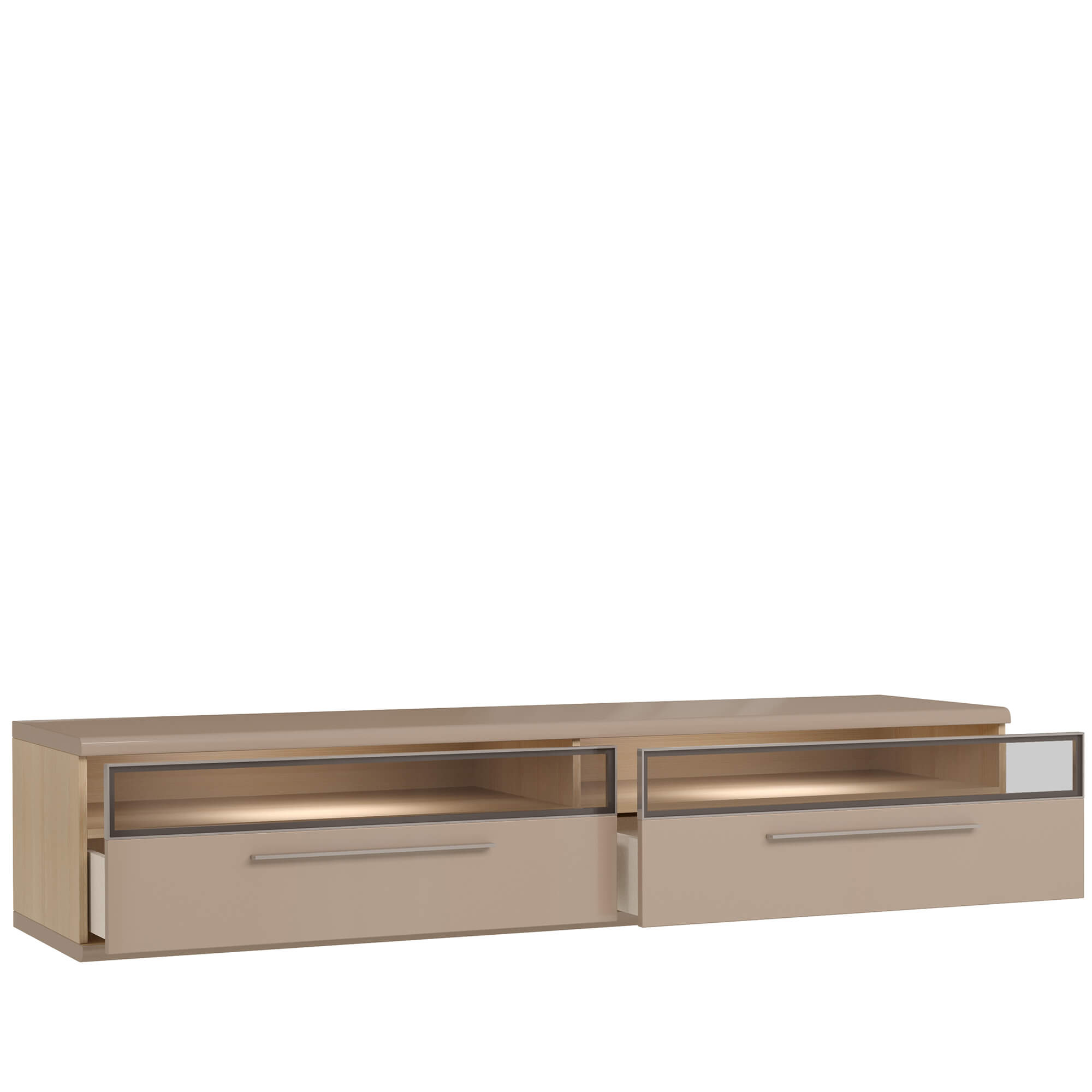 Навесная ТВ-тумба ESTE оснащена двумя выдвижными ящиками с комбинированными фасадами. В верхней части фасадов расположена вставка с тонированным стеклом, за которой находится световое оборудование. Система включения светильников не входит в комплект мебели и заказывается отдельно. Максимальная распределенная нагрузка на элемент составляет 30 кг.