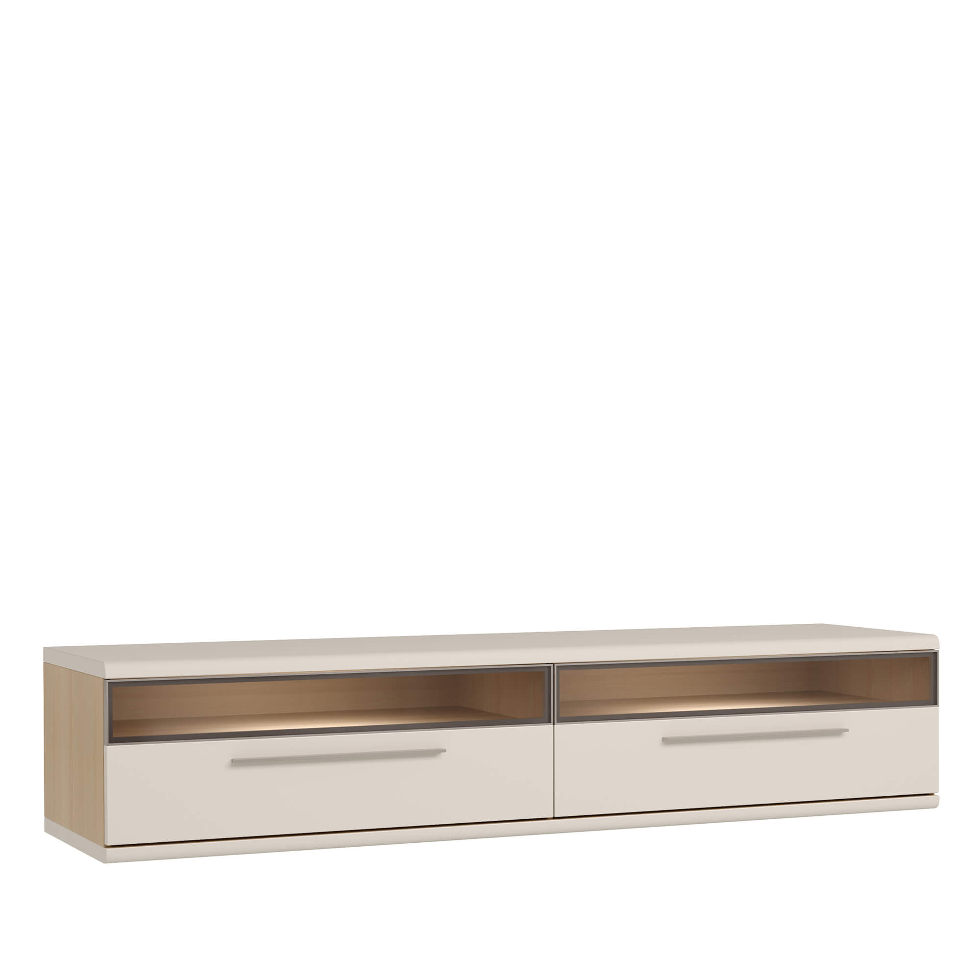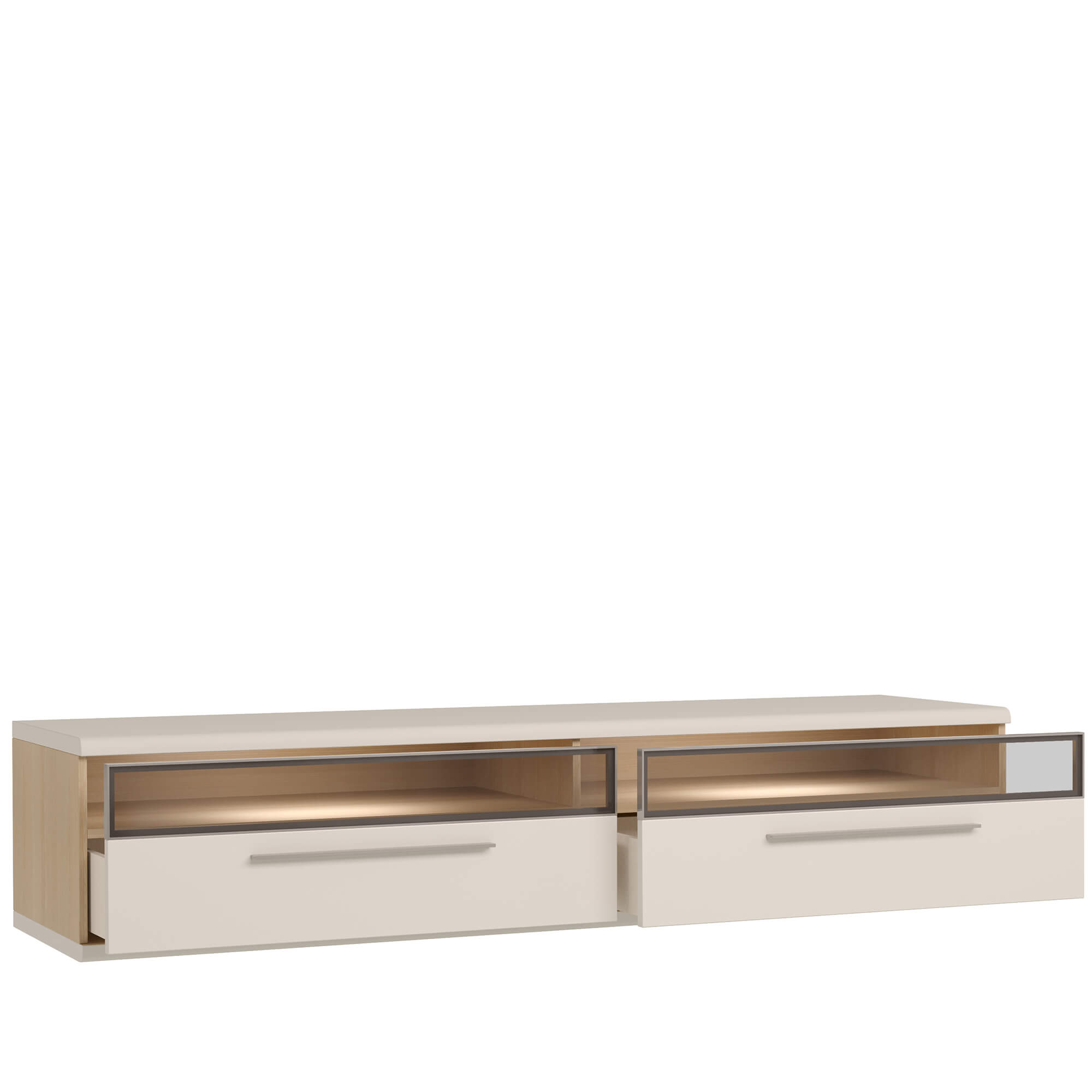 Навесная ТВ-тумба ESTE оснащена двумя выдвижными ящиками с комбинированными фасадами. В верхней части фасадов расположена вставка с тонированным стеклом, за которой находится световое оборудование. Система включения светильников не входит в комплект мебели и заказывается отдельно. Максимальная распределенная нагрузка на элемент составляет 30 кг.