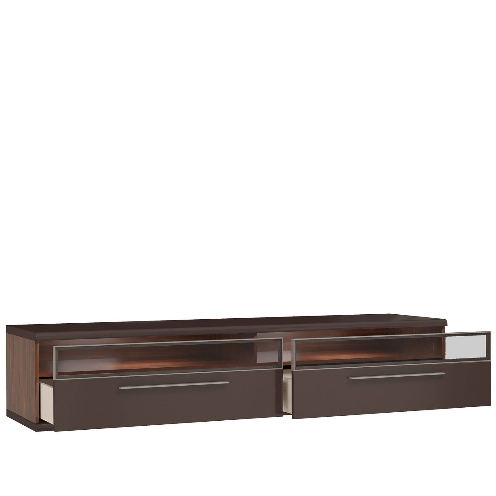 Навесная ТВ-тумба SAVONA оснащена двумя выдвижными ящиками с комбинированными фасадами. В верхней части фасадов расположена вставка с тонированным стеклом, за которой находится световое оборудование. Система включения светильников не входит в комплект мебели и заказывается отдельно. Максимальная распределенная нагрузка на элемент составляет 30 кг.