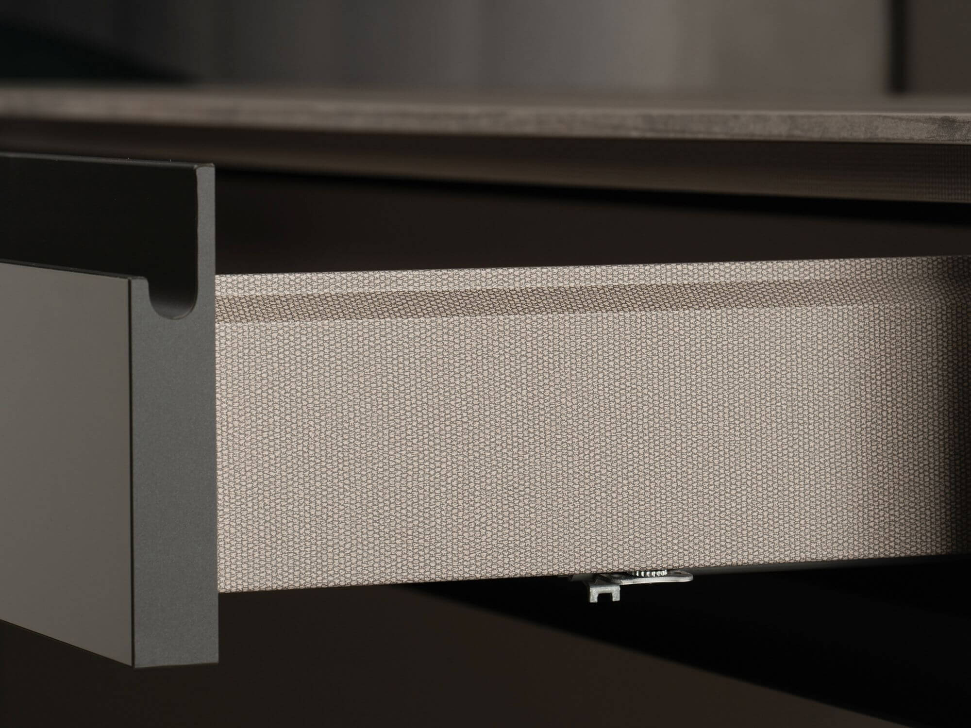 Выдвижные ящики с изящной скошенной гранью боковины выполнены в отделке текстурой Шенилл, в точности воспроизводящей рисунок плетения натуральной ткани.