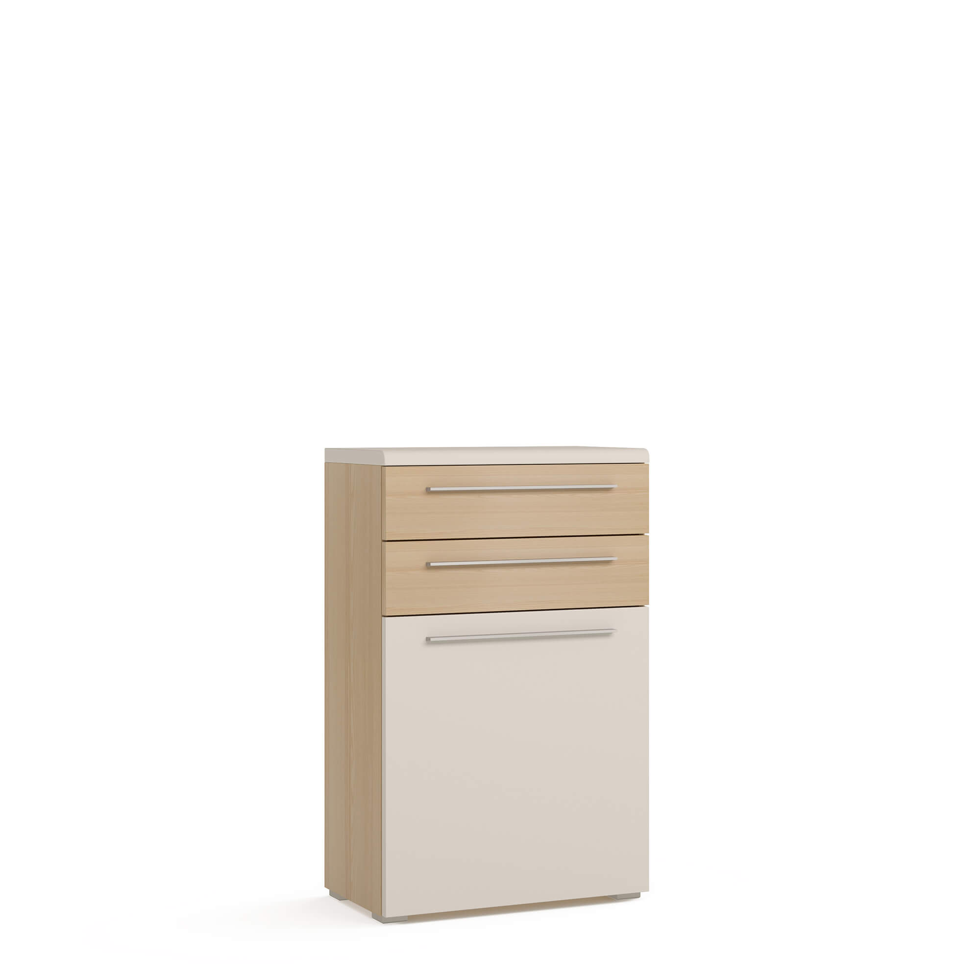Тумба для обуви ESTE оснащена распашным фасадом (возможно навешивание как на левую, так и на правую сторону). Внутреннее пространство разделено полкой на две равные части. В верхней части расположены два выдвижных ящика для мелочей.
