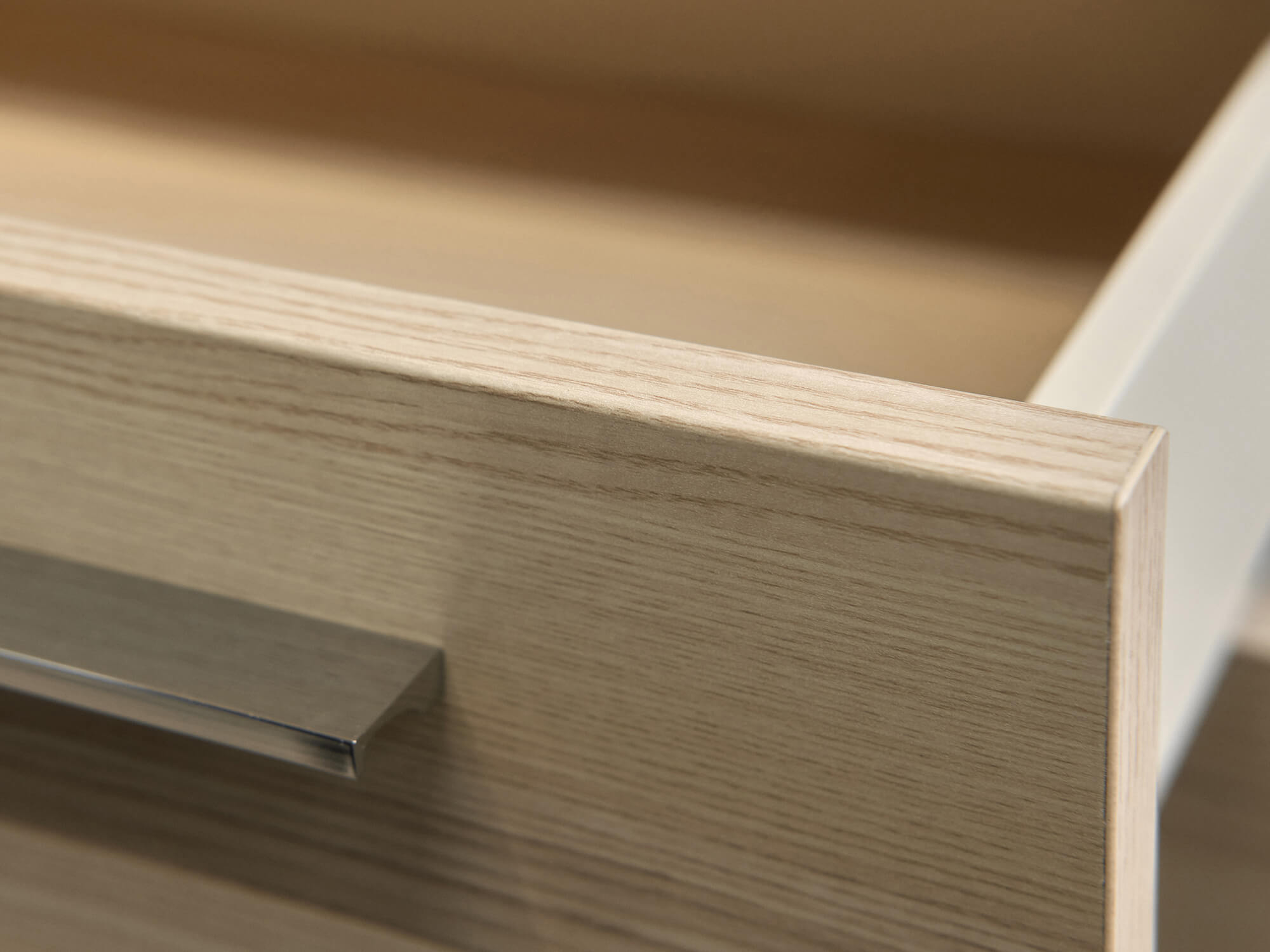 В производстве фасадов коллекции используется технология окутывания, позволяющая получить гладкие детали без кромок, которые обладают высокой долговечностью благодаря надежной защите от влаги и практичны в уборке.