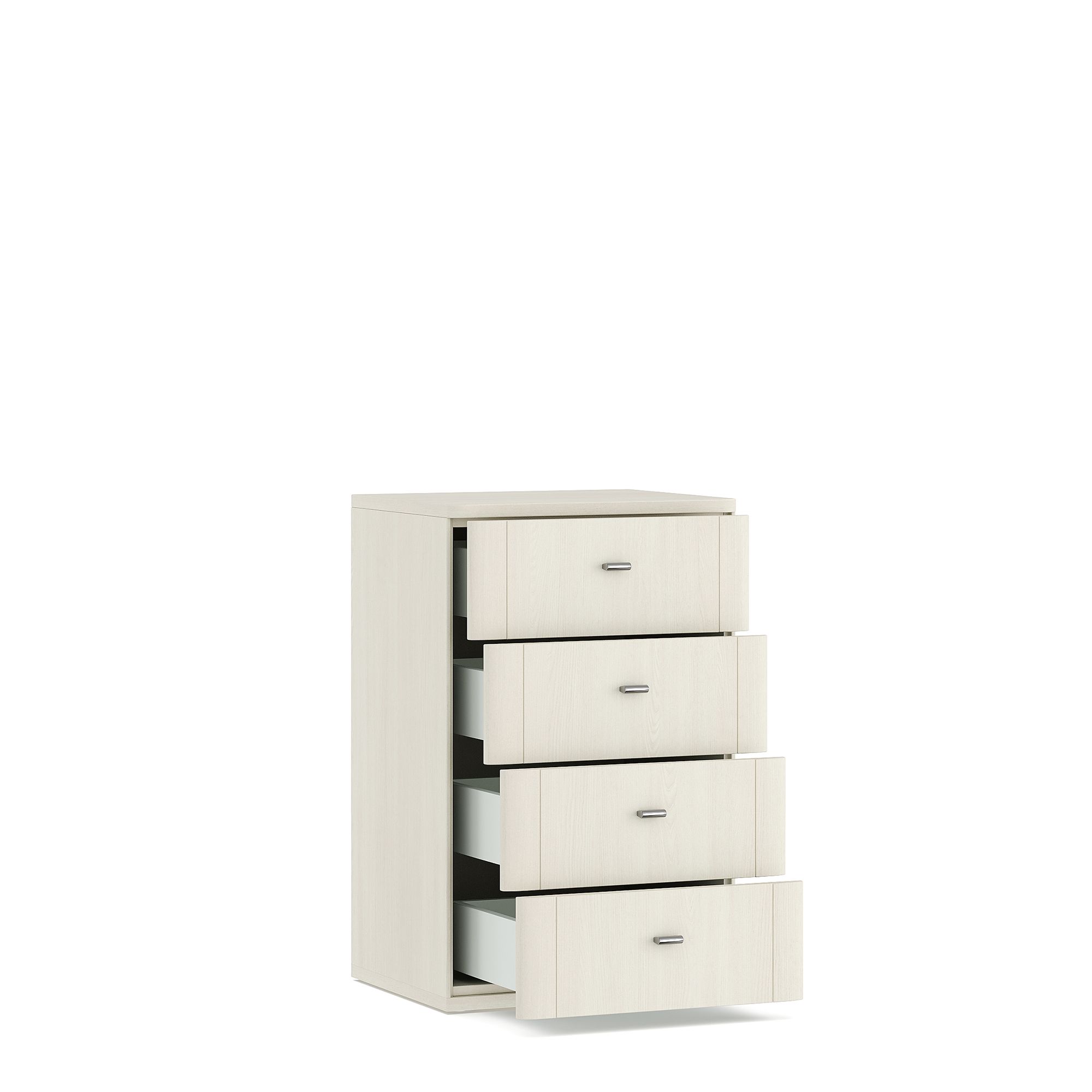Тумба ELEGANTE оснащена четырьмя выдвижными ящиками с плавными, скругленными гранями фасадов, которые делают взаимодействие с мебелью особенно приятным. В производстве фасадов использована технология окутывания, позволяющая получить детали без кромок.