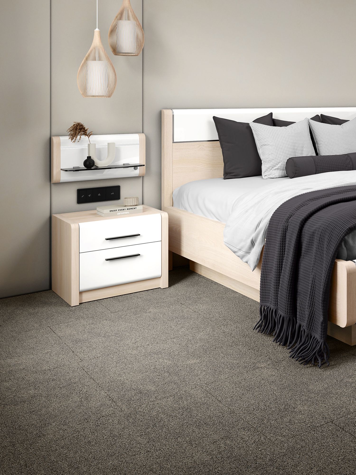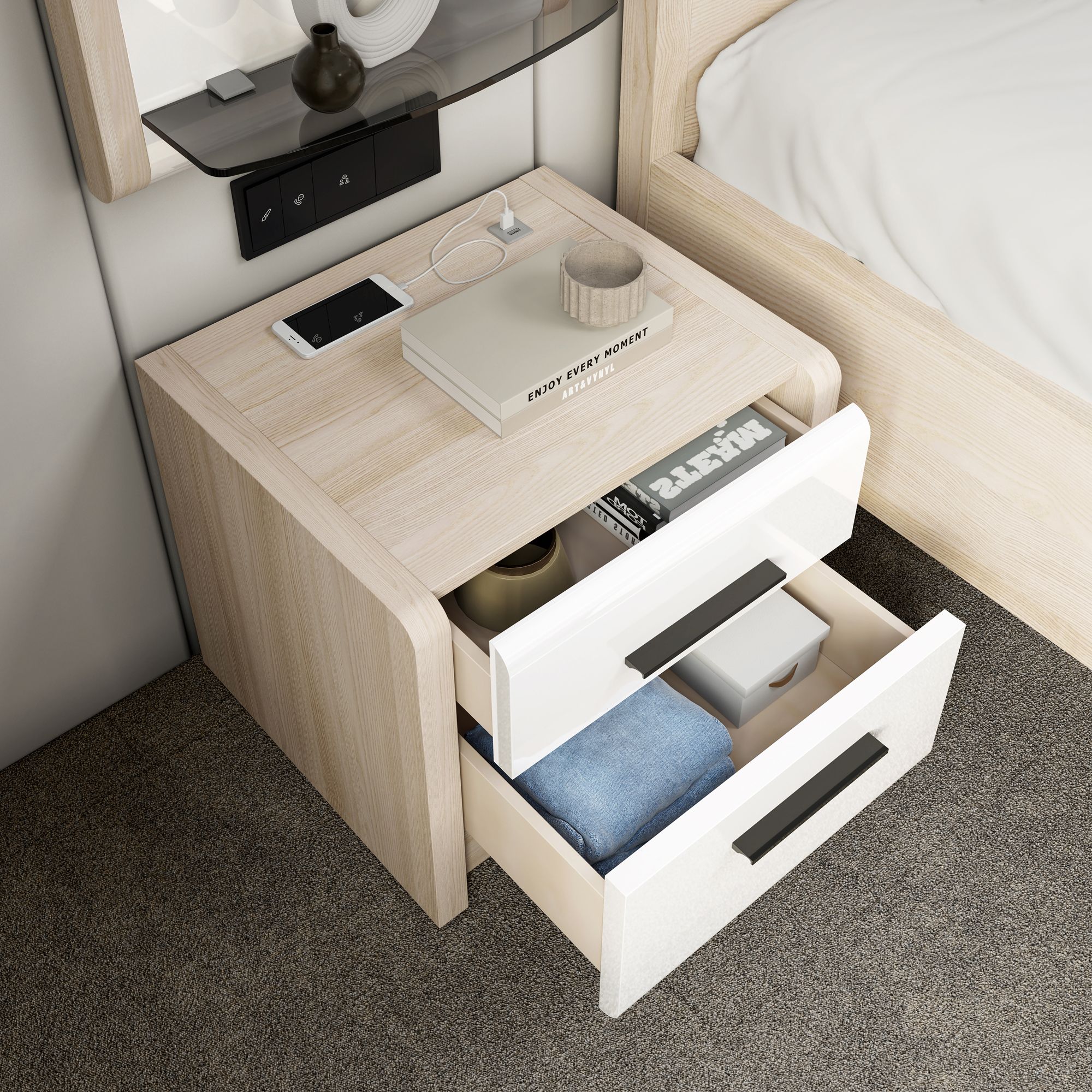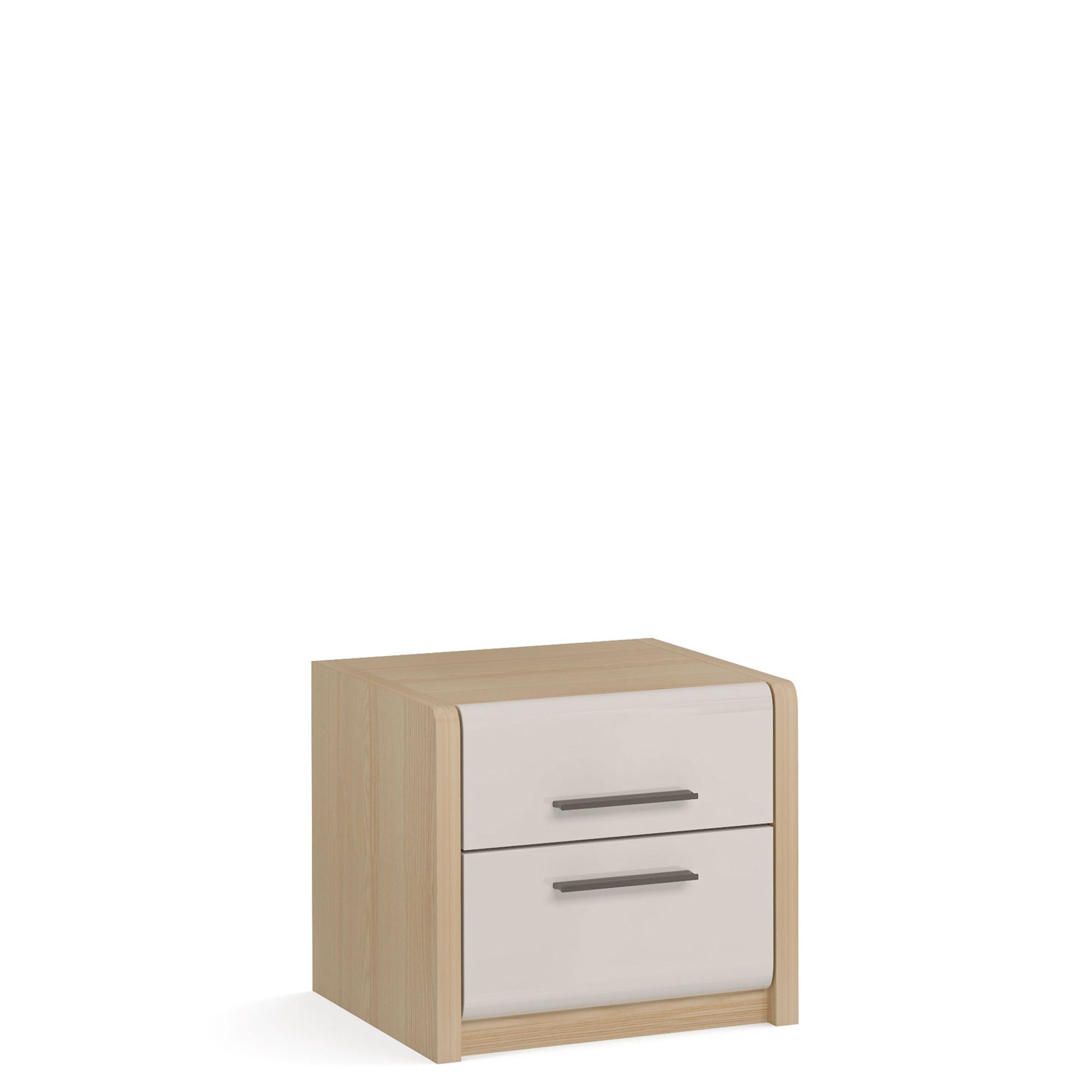 Прикроватная тумба ESTE оснащена двумя выдвижными ящиками с плавными, скругленными гранями фасадов, которые делают взаимодействие с мебелью особенно приятным. В производстве фасадов использована технология окутывания, позволяющая получить детали без кромок.