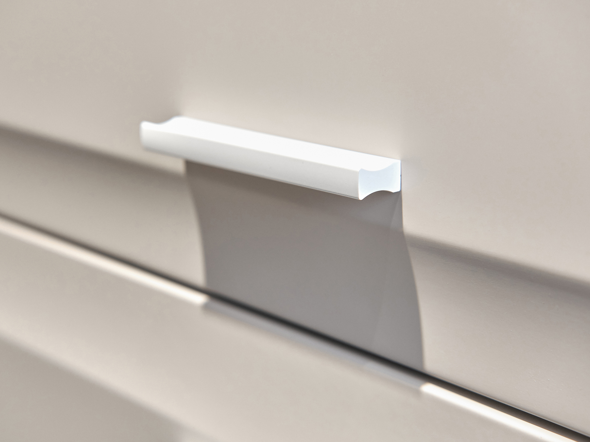 Благодаря многослойной отделке эмалью фасады коллекции не имеют острых кромок, что делает взаимодействие с мебелью тактильно приятным и повышает безопасность использования.